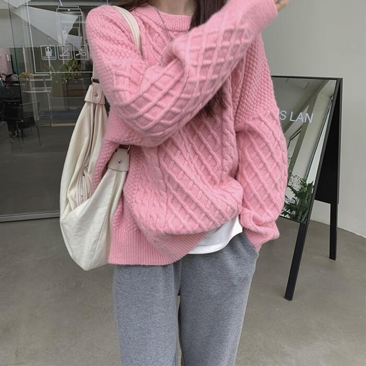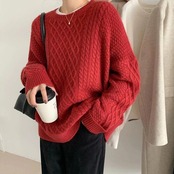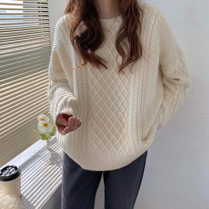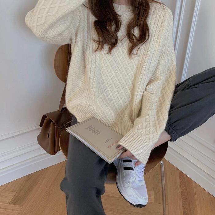 色々な編み方を織り交ぜた切替デザインのクルーネックニット。