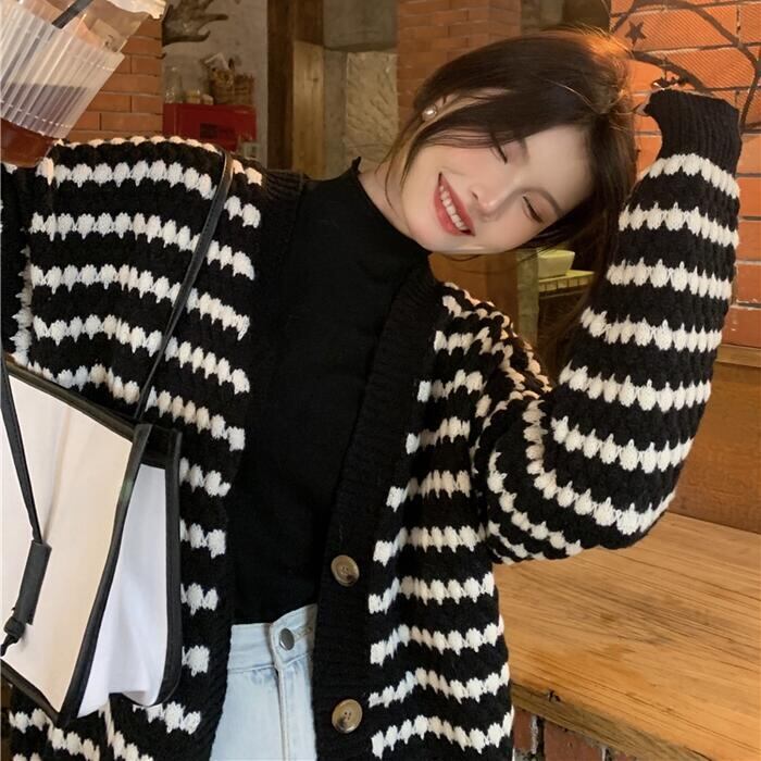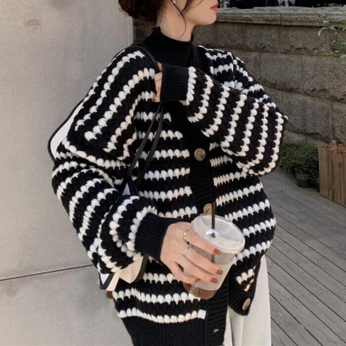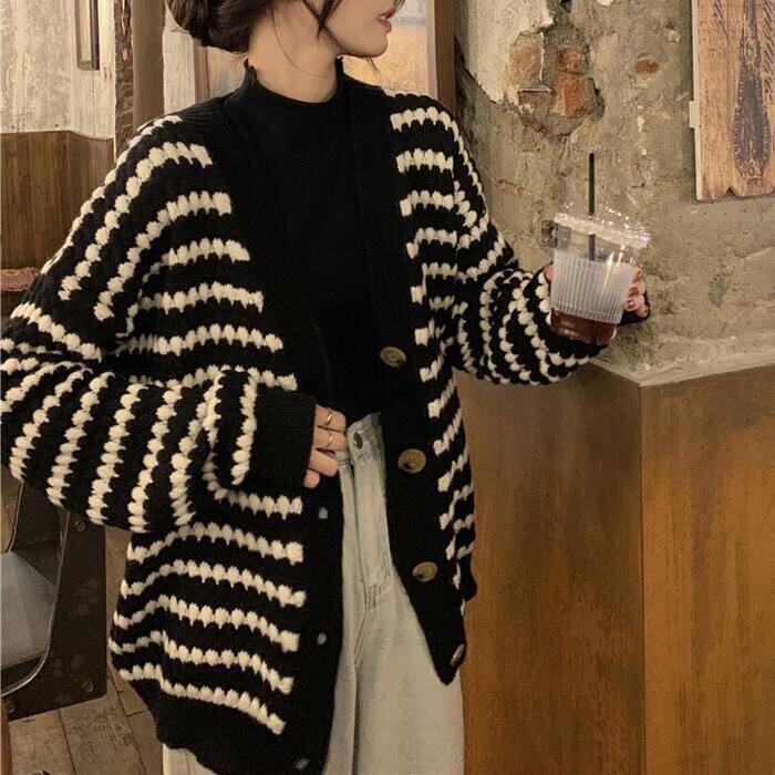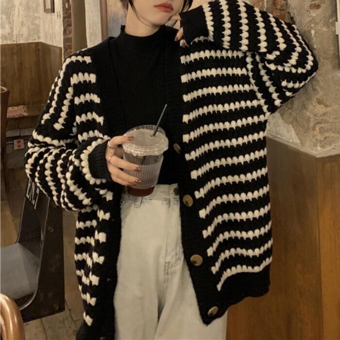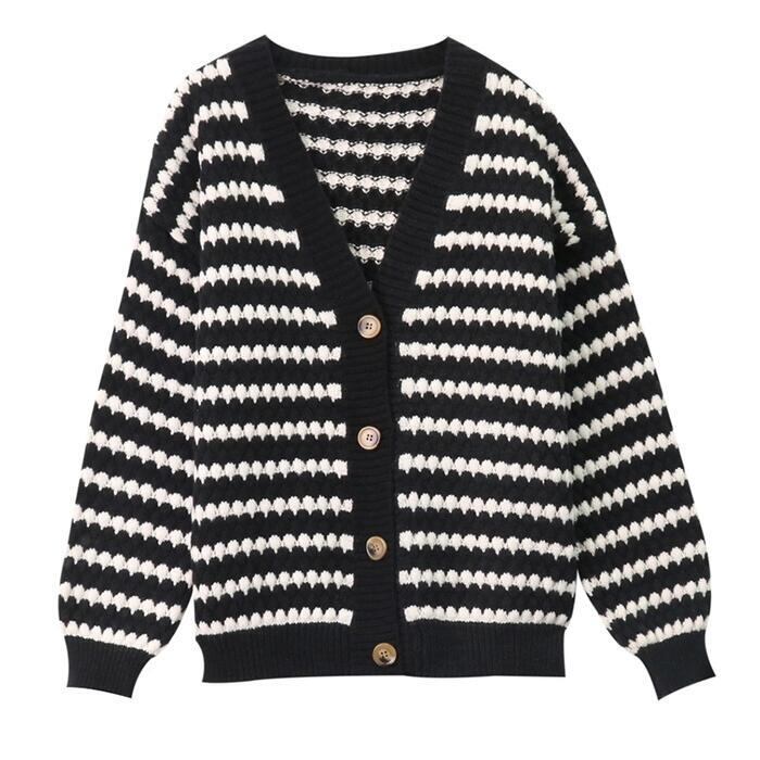 大きいサイズ 体型カバー トップス ニット カーディガン セーター アウター ジャケット ボーダー レディース きれいめ カジュアル 長袖 大人 可愛い フェミニン おしゃれ ゆったり 羽織り Vネック 韓国 ホワイト 白 ブラック 黒 春 秋 冬 20代 30代 40代 50代