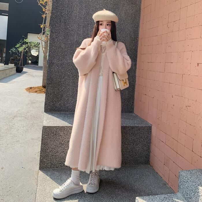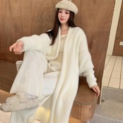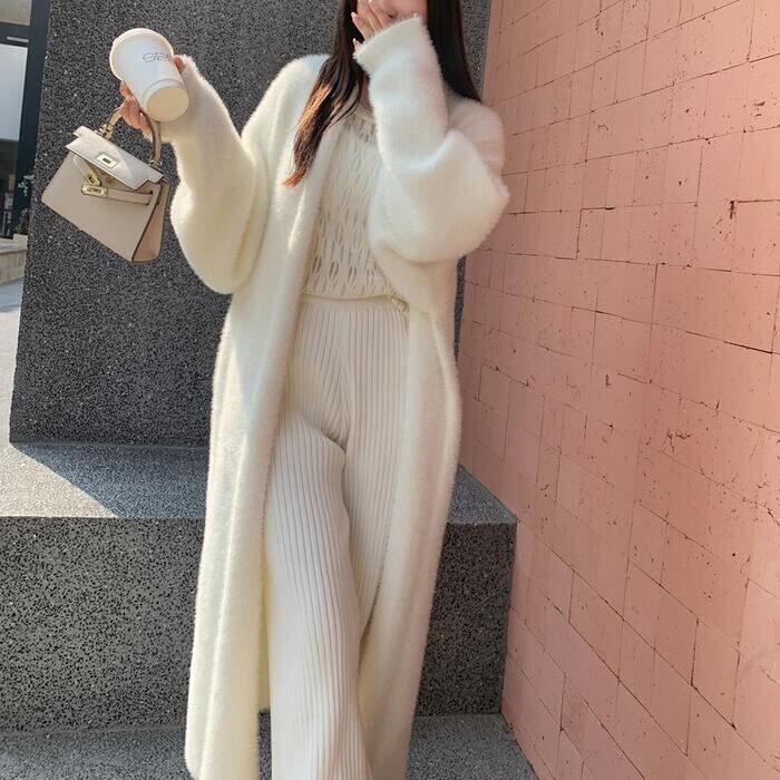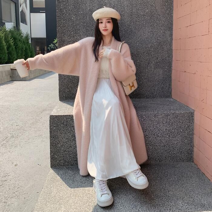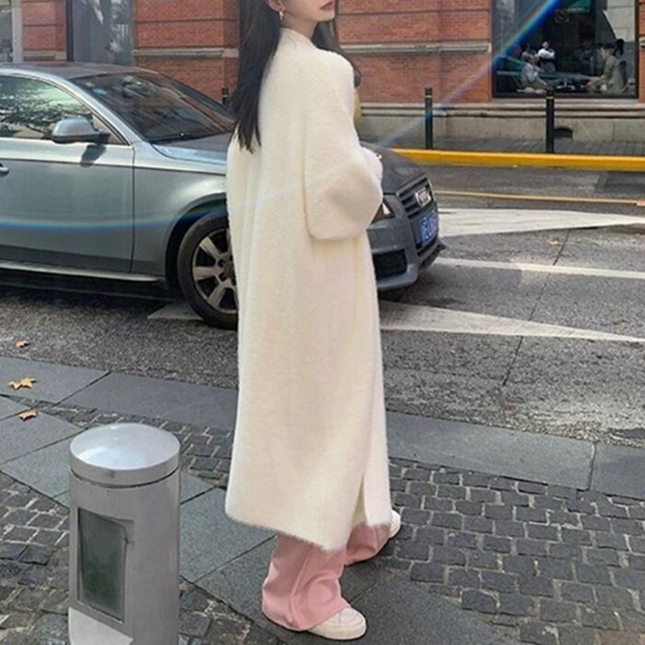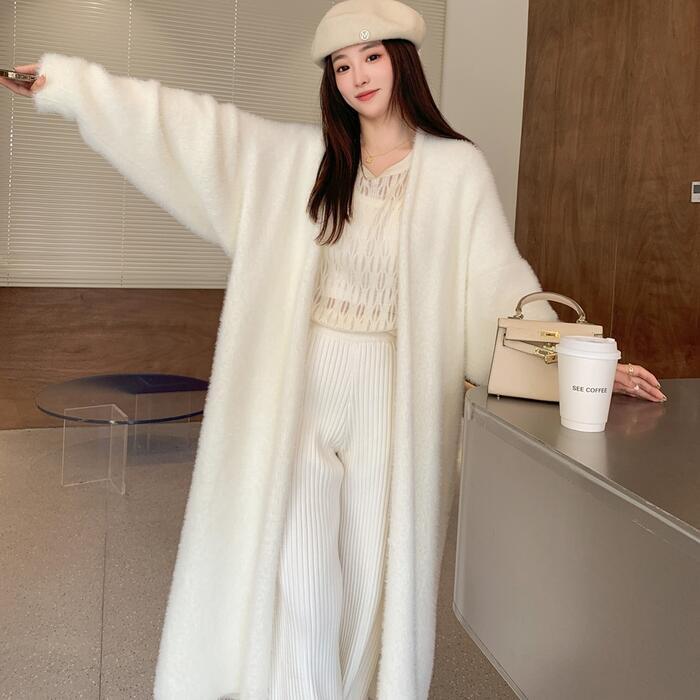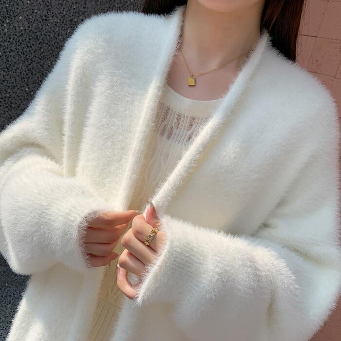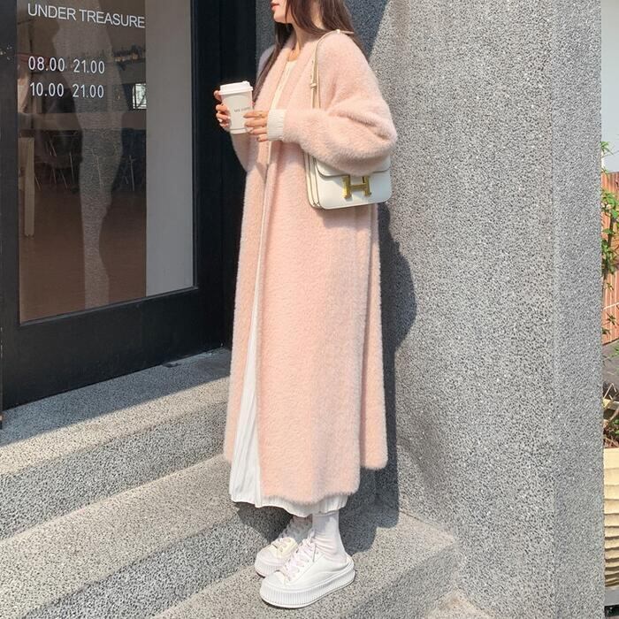 全2色 大きいサイズ 体型カバー アウター トップス ニット カーディガン ジャケット 羽織り レディース エレガント きれいめ カジュアル 長袖 大人 可愛い フェミニン ロング丈 ロングカーデ おしゃれ ゆったり ガウン 韓国 ホワイト 白 ピンク 春 秋 冬 20代 30代 40代 50代