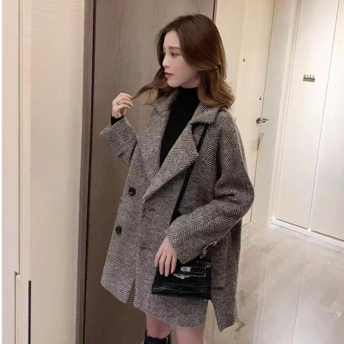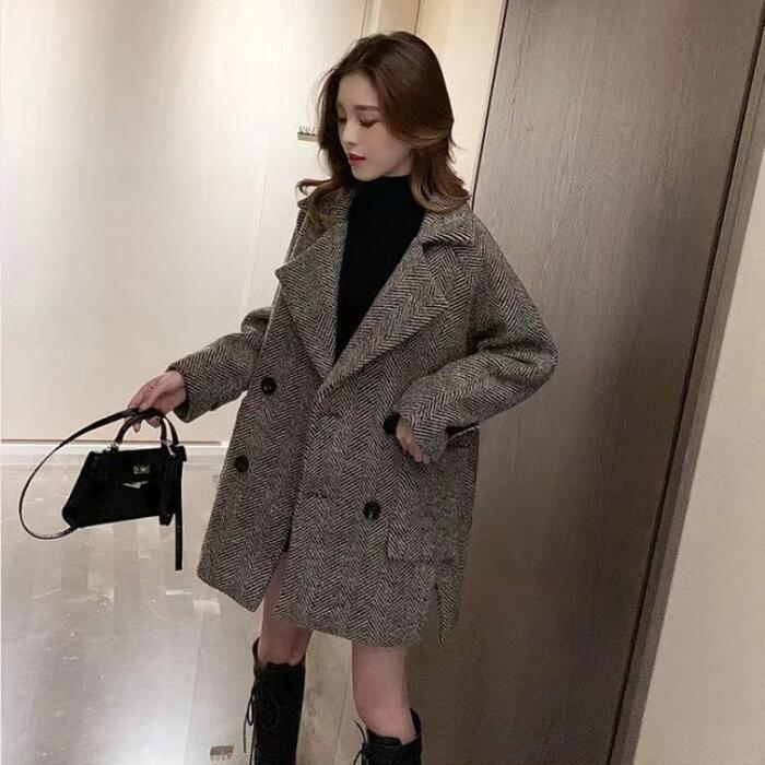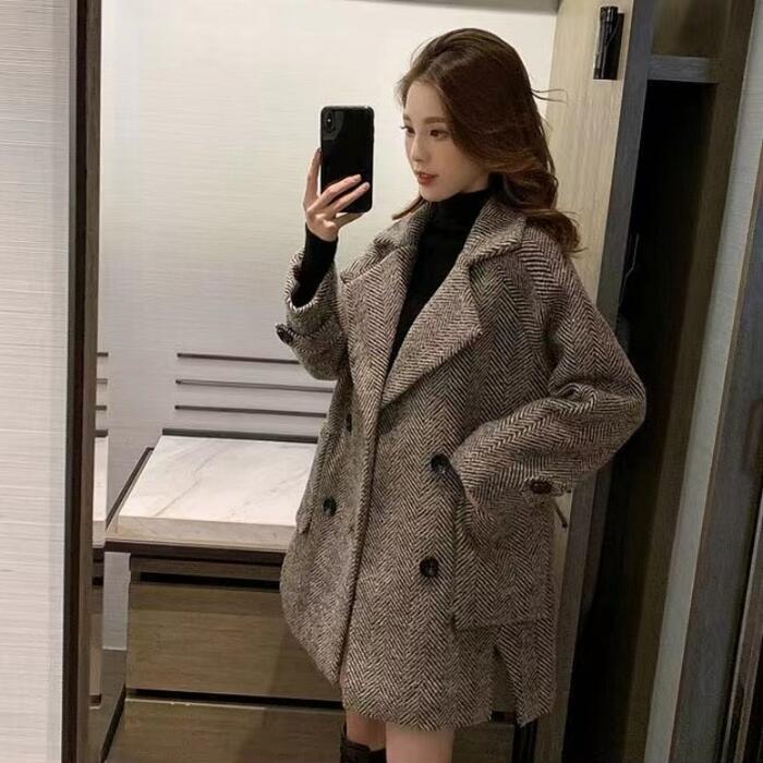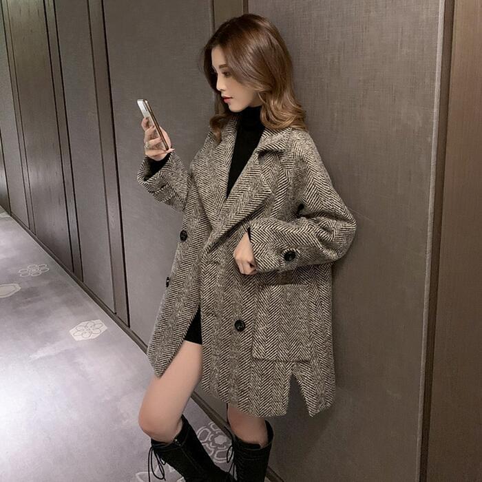 全2色 大きいサイズ 体型カバー ゆったり トラッド アウター コート ジャケット チェスターコート テーラード レディース エレガント きれいめ カジュアル 長袖 大人 可愛い フェミニン ミディ丈 おしゃれ かっこいい ヘリンボーン 韓国 ブラック 黒 ブラウン 春 秋 冬 20代 30代 40代 50代