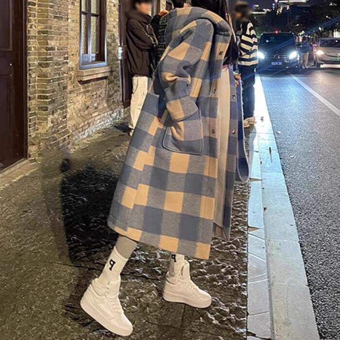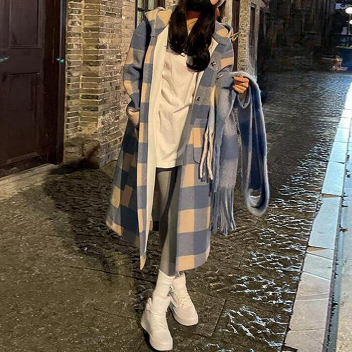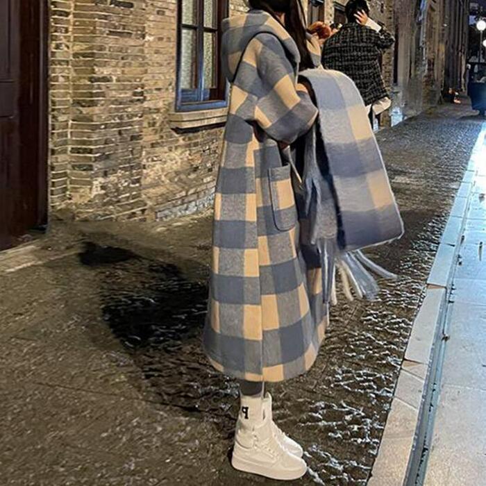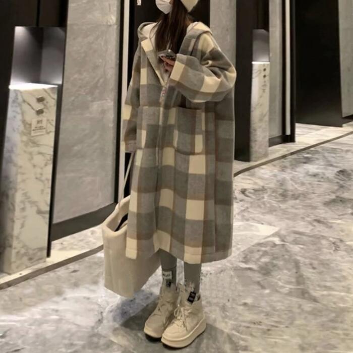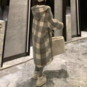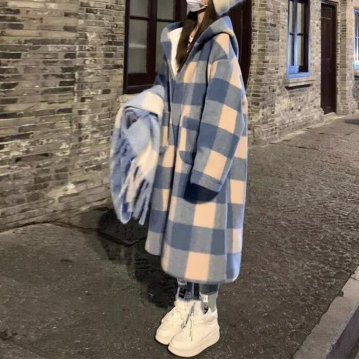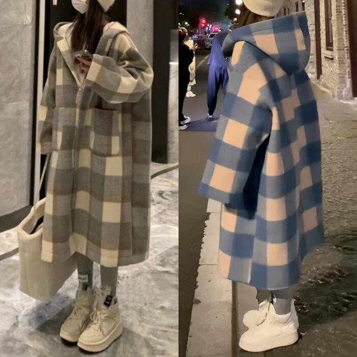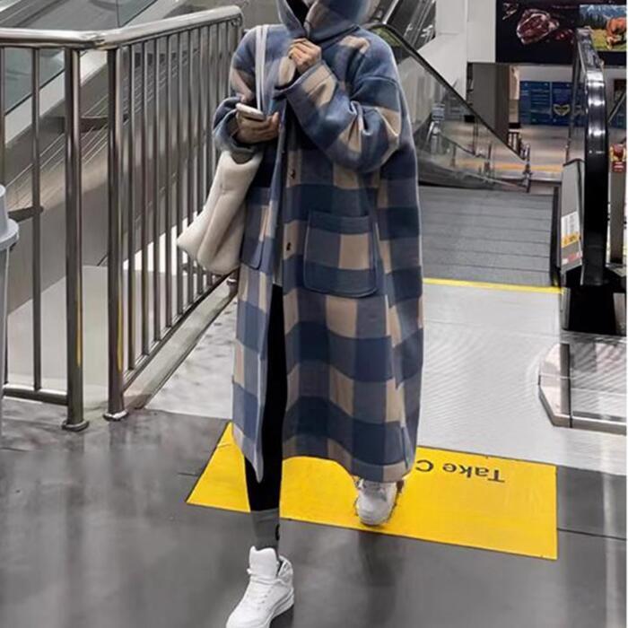 全2色 体型カバー アウター コート ジャケット チェスター チェック フード レディース きれいめ カジュアル 長袖 大人 可愛い フェミニン ゆったり ビッグシルエット オーバーサイズ おしゃれ 韓国 ブルー 青 ベージュ 春 秋 冬 20代 30代 40代 50代
