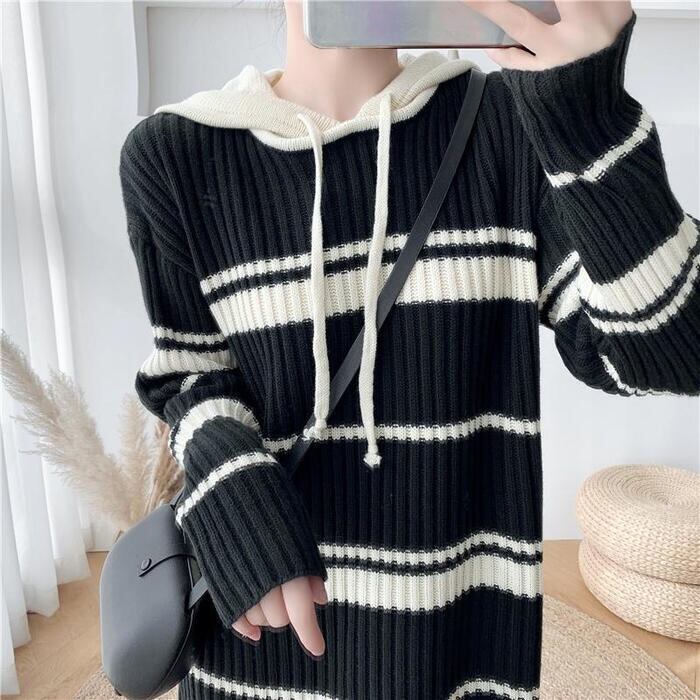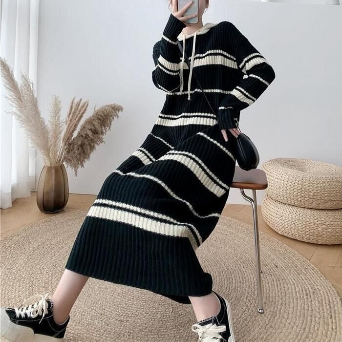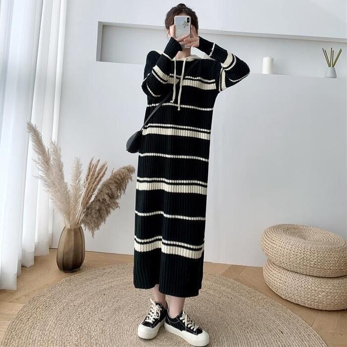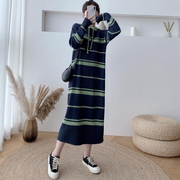 全2色 大きいサイズ ワンピース ニット ドレス ボーダー ワンピ 袖あり フード パーカー レディース きれいめ カジュアル ミモレ丈 長袖 大人 可愛い フェミニン ゆったり 体型カバー リラックス ネイビー ブラック 黒 春 秋 冬 20代 30代 40代 50代