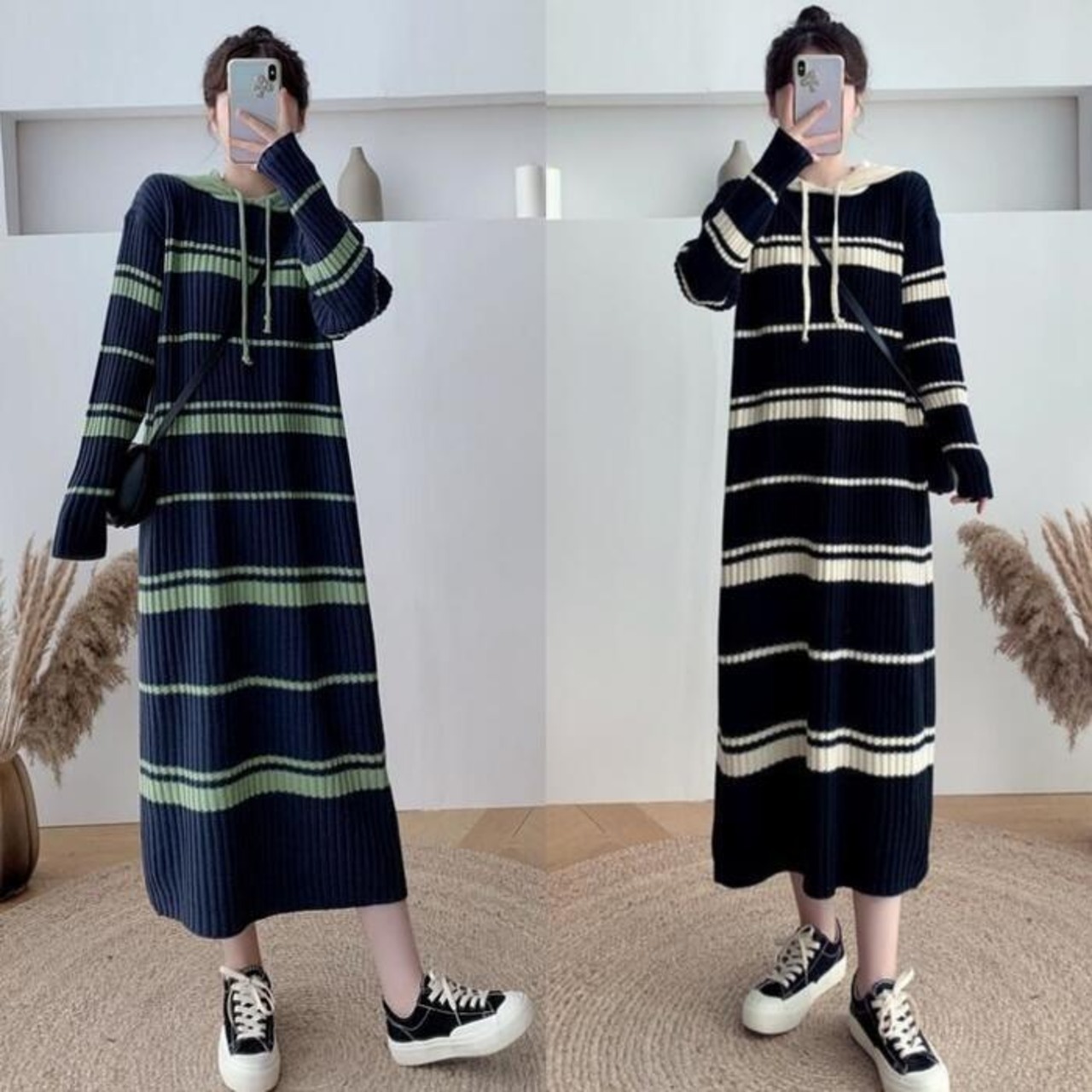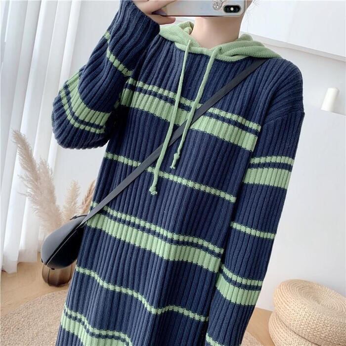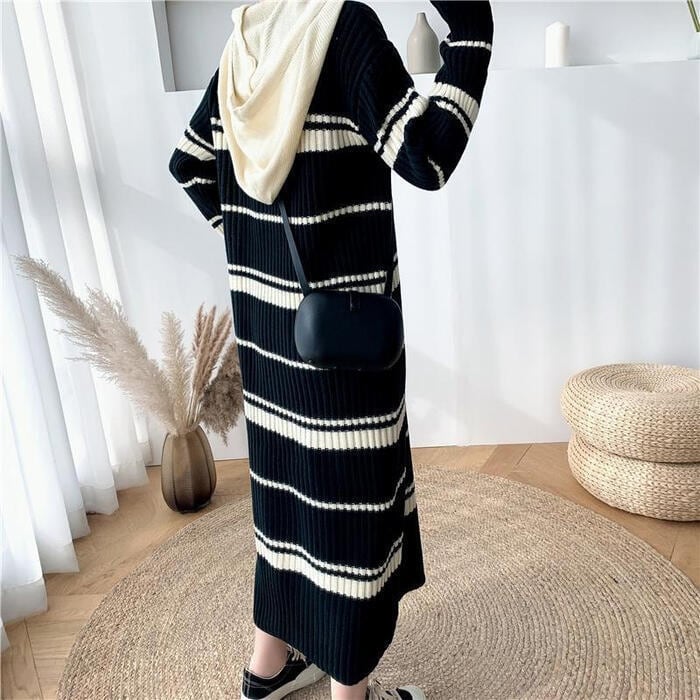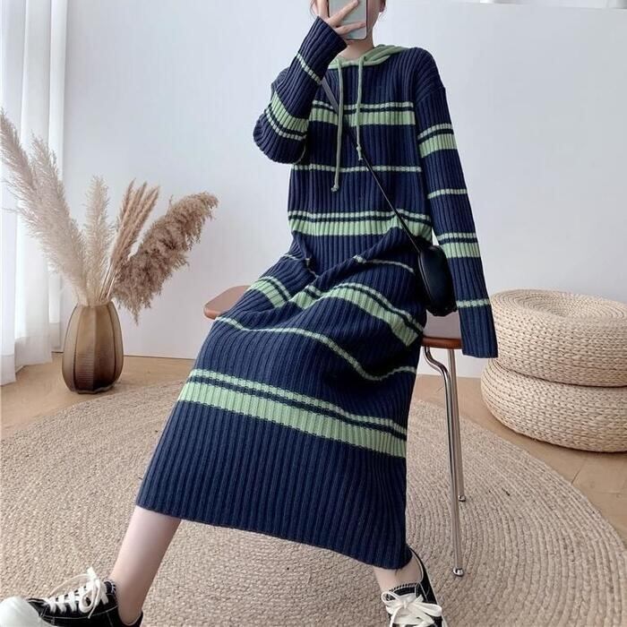 ランダムボーダーのカジュアルなニットワンピース。