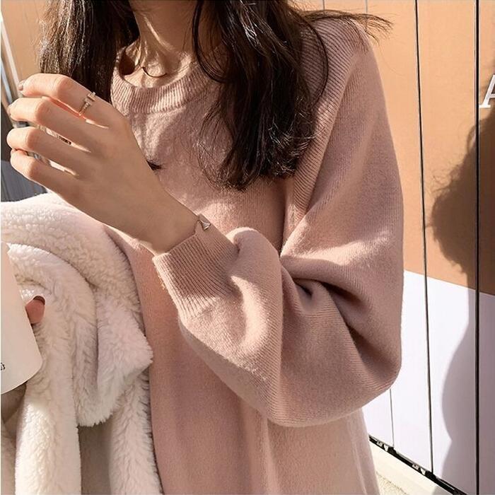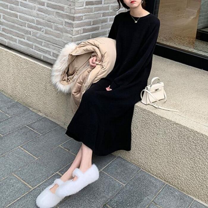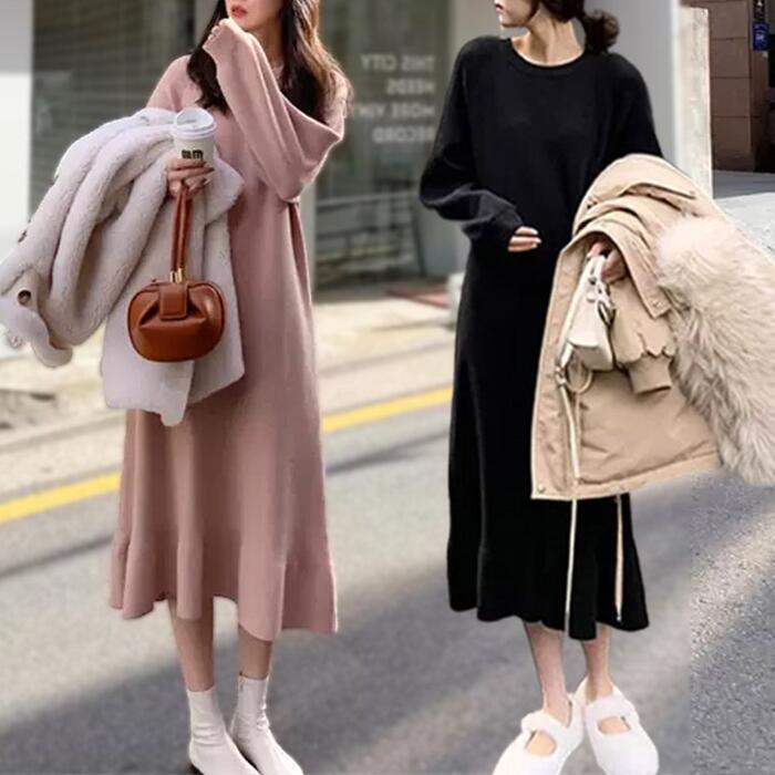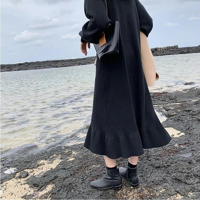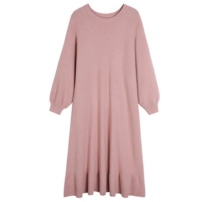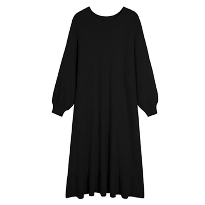 全2色 大きいサイズ ワンピース ニット ドレス ワンピ 袖あり フレア パフスリーブ レディース きれいめ エレガント カジュアル ミモレ丈 長袖 大人 可愛い フェミニン ゆったり 体型カバー シンプル リラックス ピンク ブラック 黒 春 秋 冬 20代 30代 40代 50代