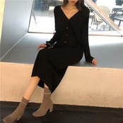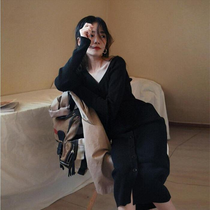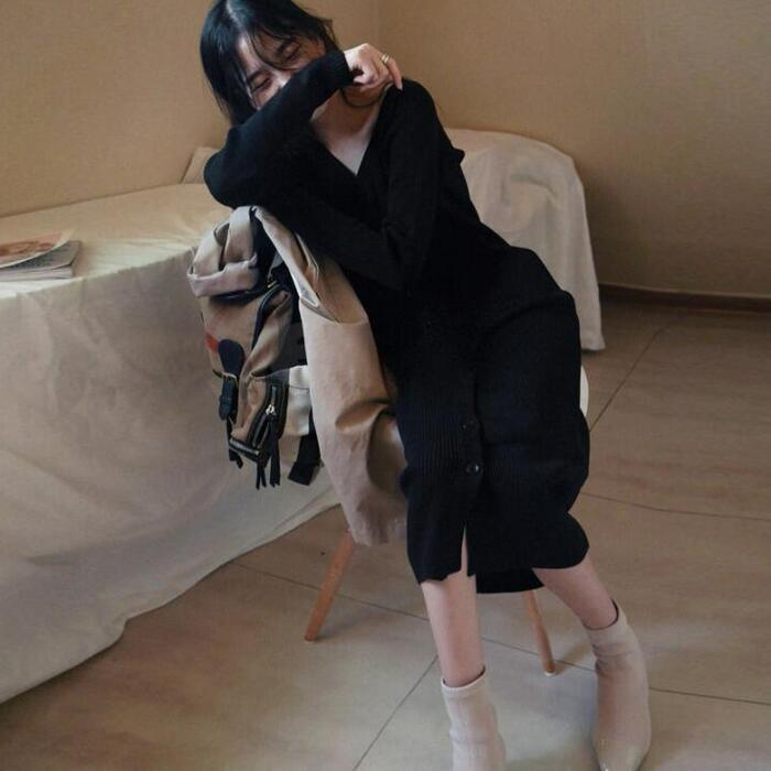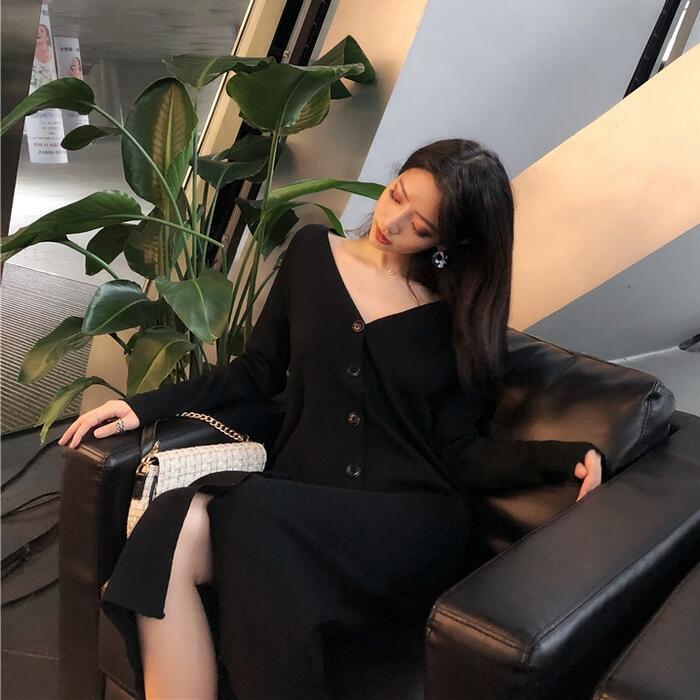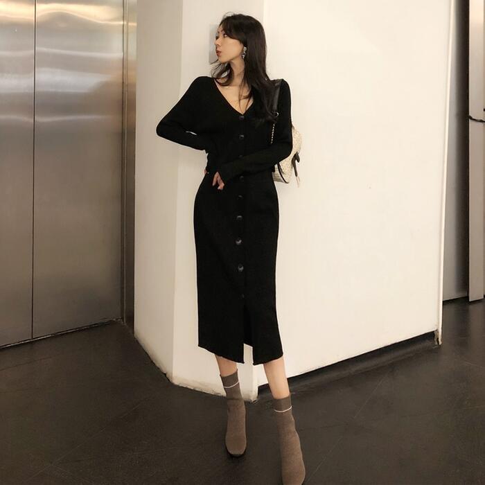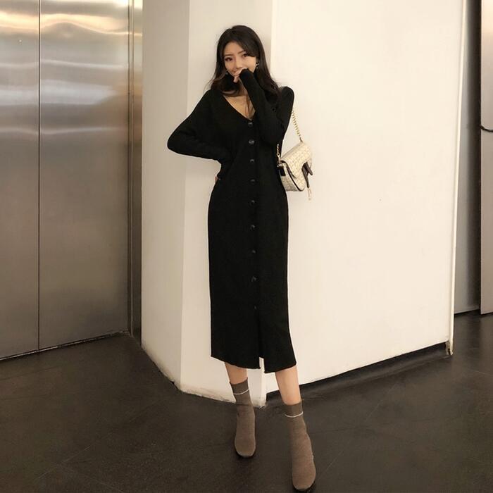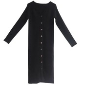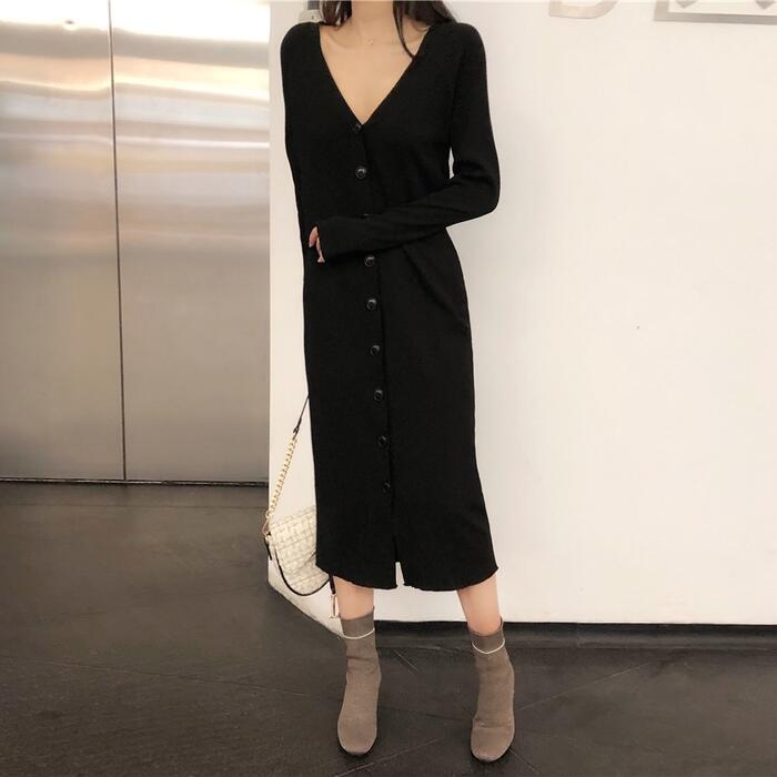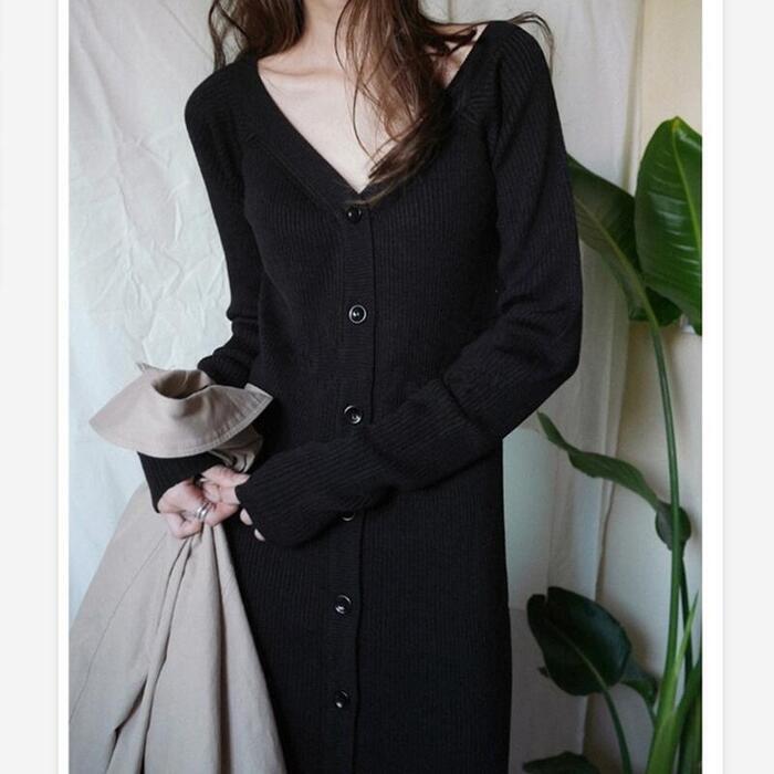 大きいサイズ ワンピース ニット ドレス ワンピ 袖あり レディース きれいめ エレガント カジュアル ミモレ丈 長袖 フロントボタン 大人 可愛い フェミニン タイト スリム シンプル Vネック 楽ちん ブラック 黒 春 秋 冬 20代 30代 40代 50代