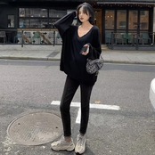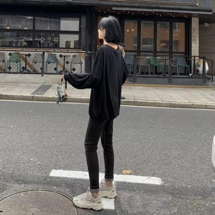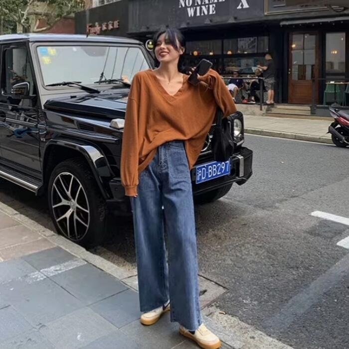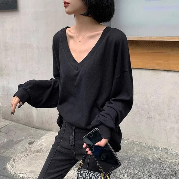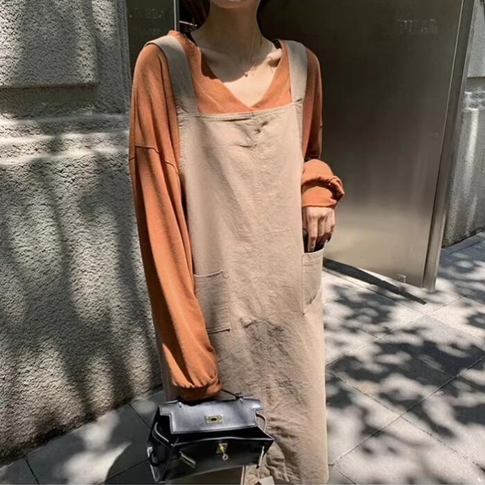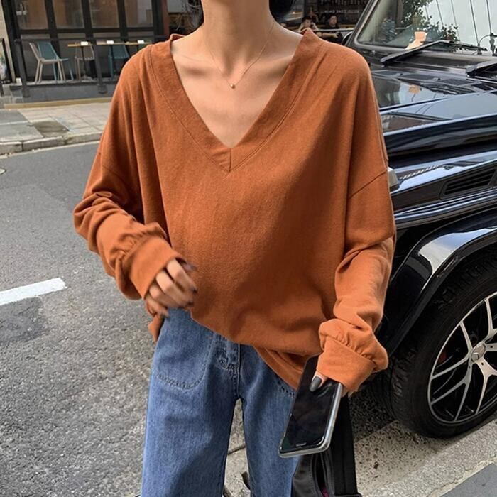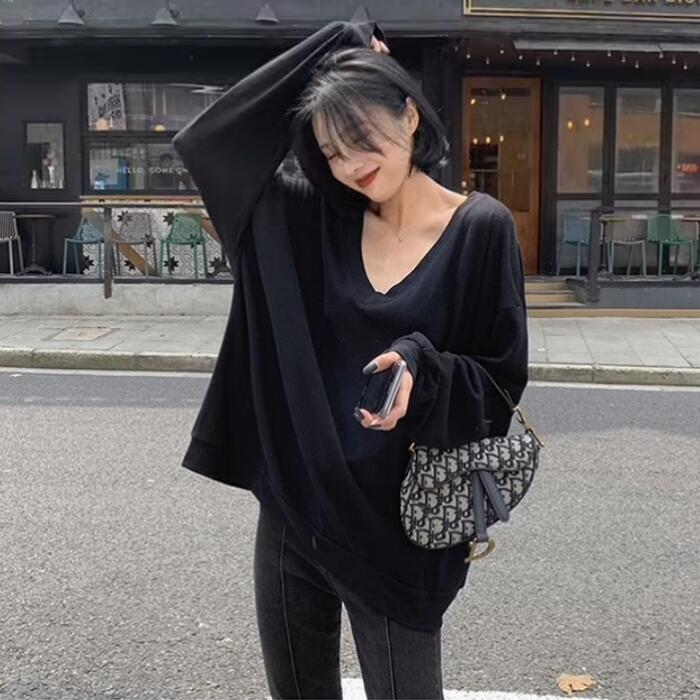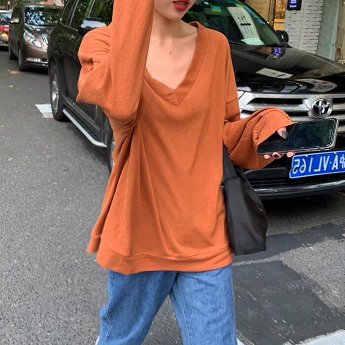 全2色 大きいサイズ トップス Tシャツ カットソー レディース きれいめ カジュアル 長袖 大人 可愛い フェミニン おしゃれ ゆったり シンプル オーバーサイズ 楽ちん Vネック インナー レイヤード 体型カバー 韓国 オレンジ ブラック 黒 春 秋 冬 20代 30代 40代 50代