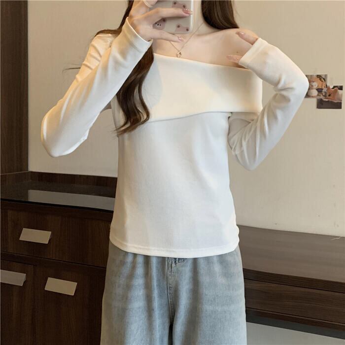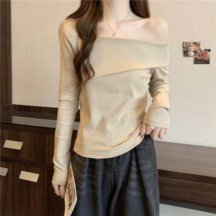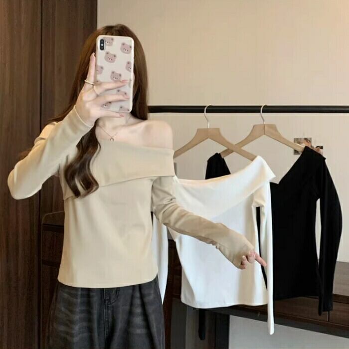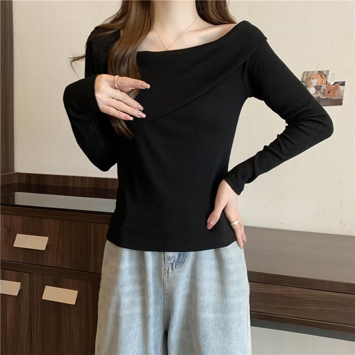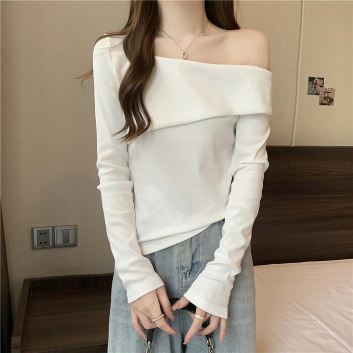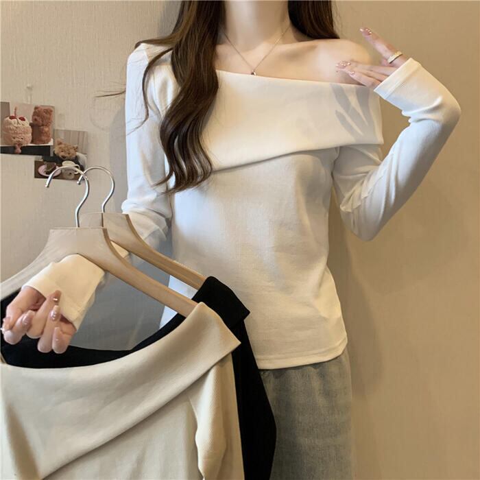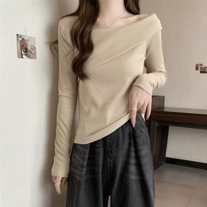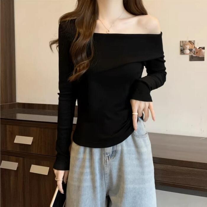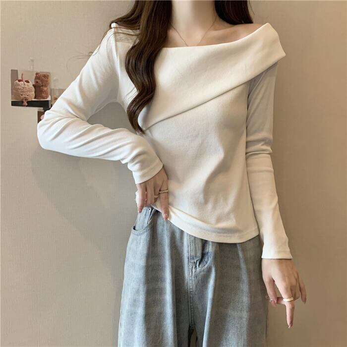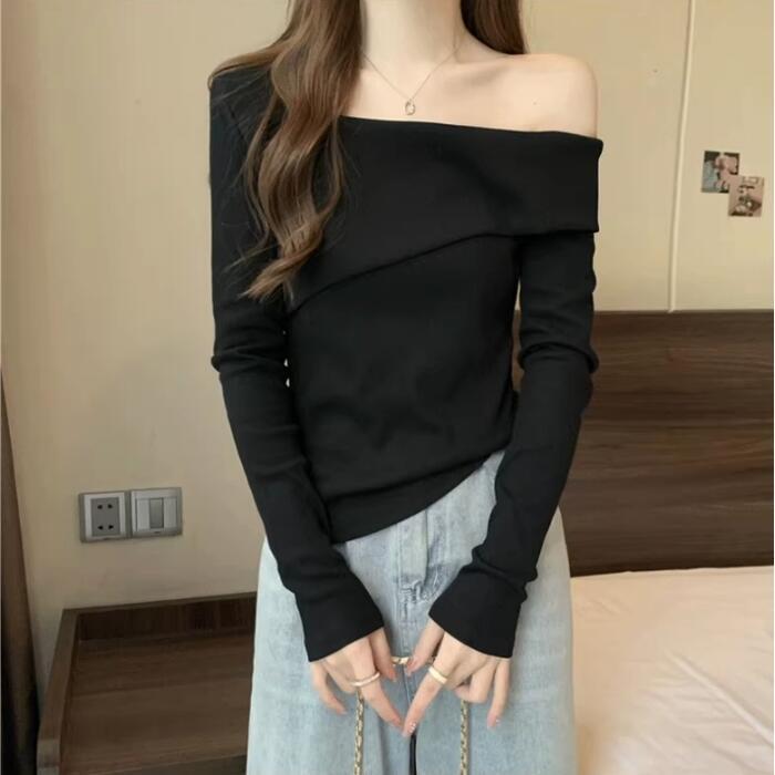 全3色 大きいサイズ 体型カバー シンプル トップス Tシャツ ニット カットソー オフショルダー ワンショルダー レディース エレガント きれいめ カジュアル 長袖 大人 可愛い フェミニン おしゃれ ボートネック プルオーバー ベージュ ホワイト 白 ブラック 黒 春 秋 冬 20代 30代 40代 50代