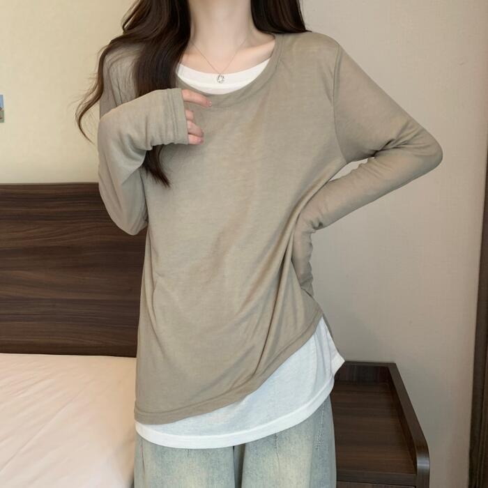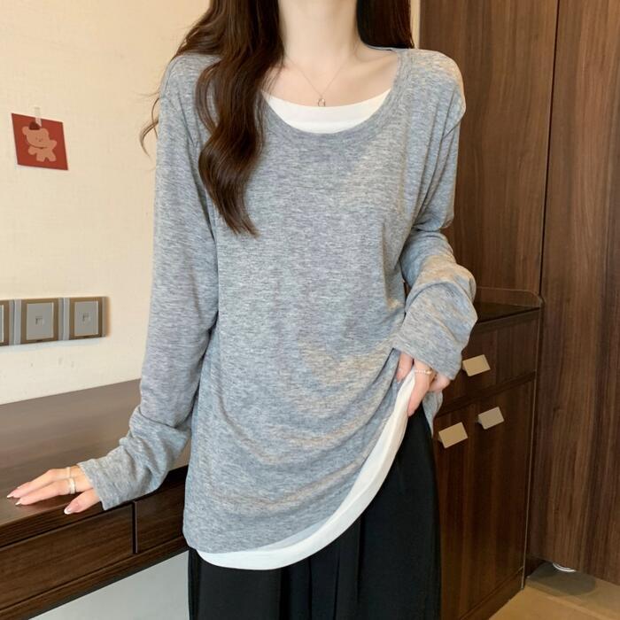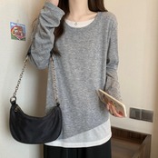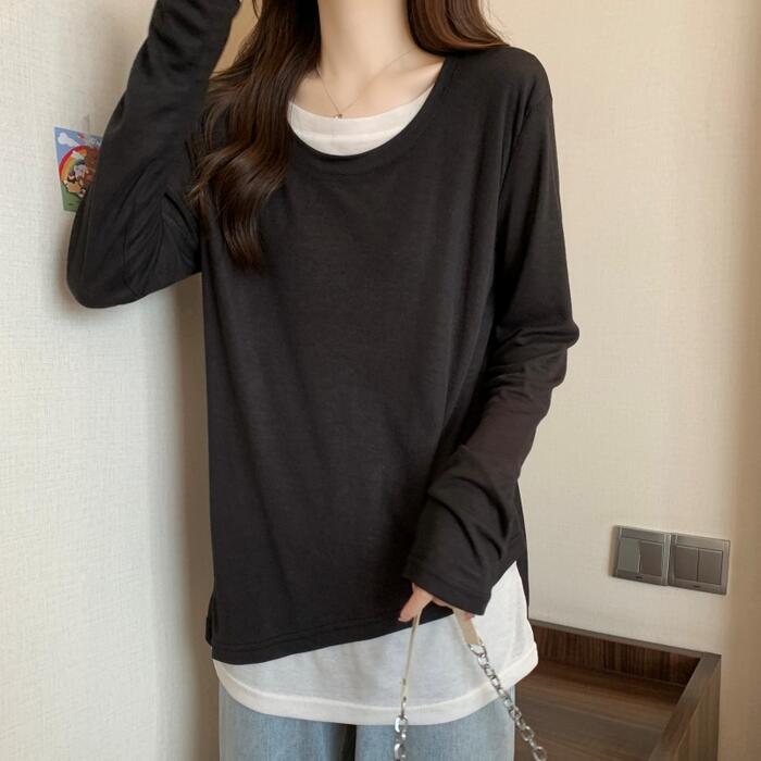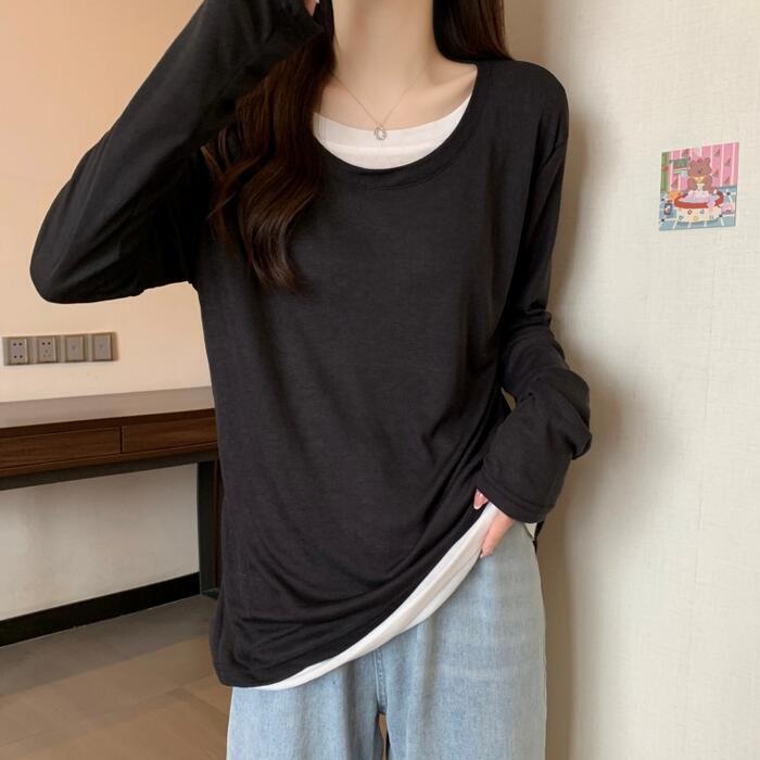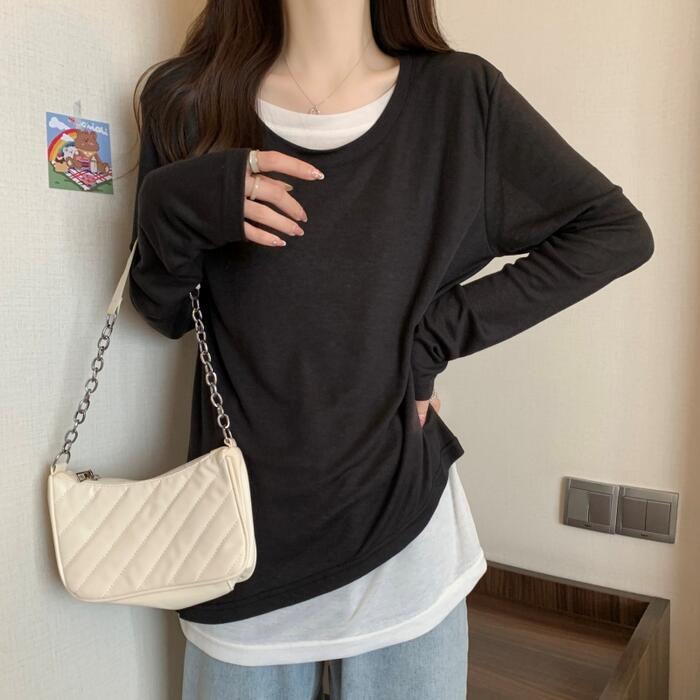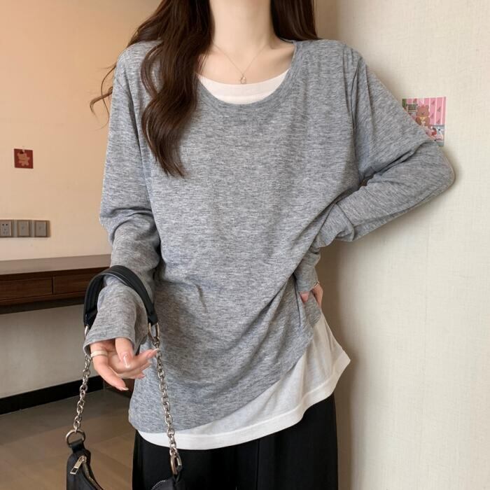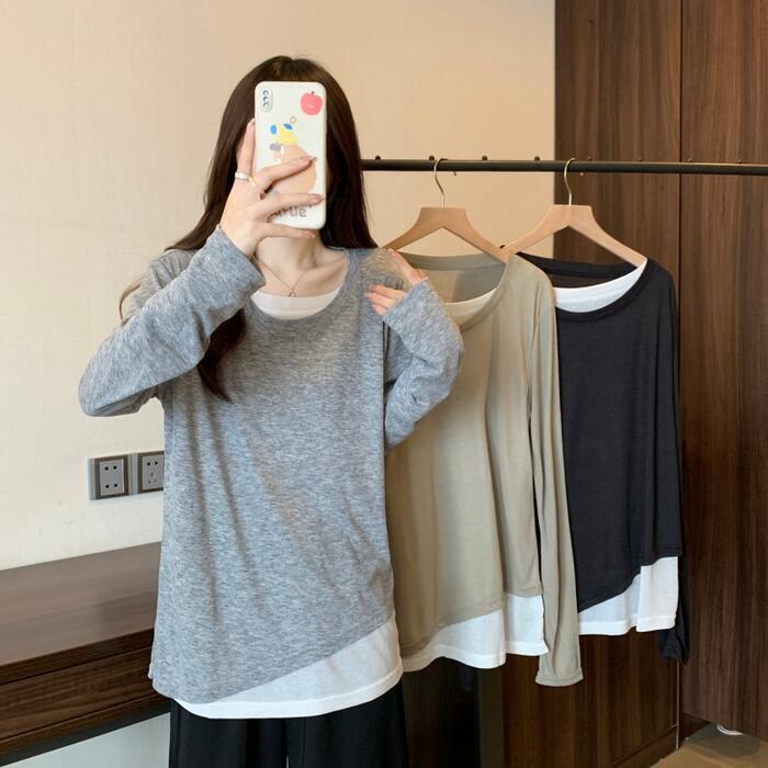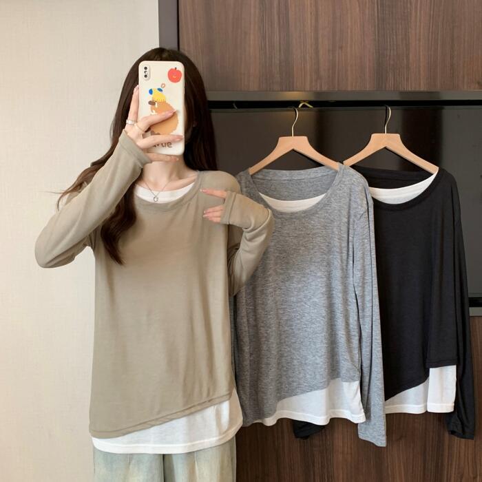 全3色 大きいサイズ 体型カバー レイヤード風 トップス Tシャツ カットソー レディース きれいめ カジュアル 長袖 大人 可愛い フェミニン おしゃれ クルーネック プルオーバー シンプル ゆったり ベージュ グレー ブラック 黒 春 秋 冬 20代 30代 40代 50代