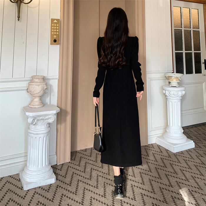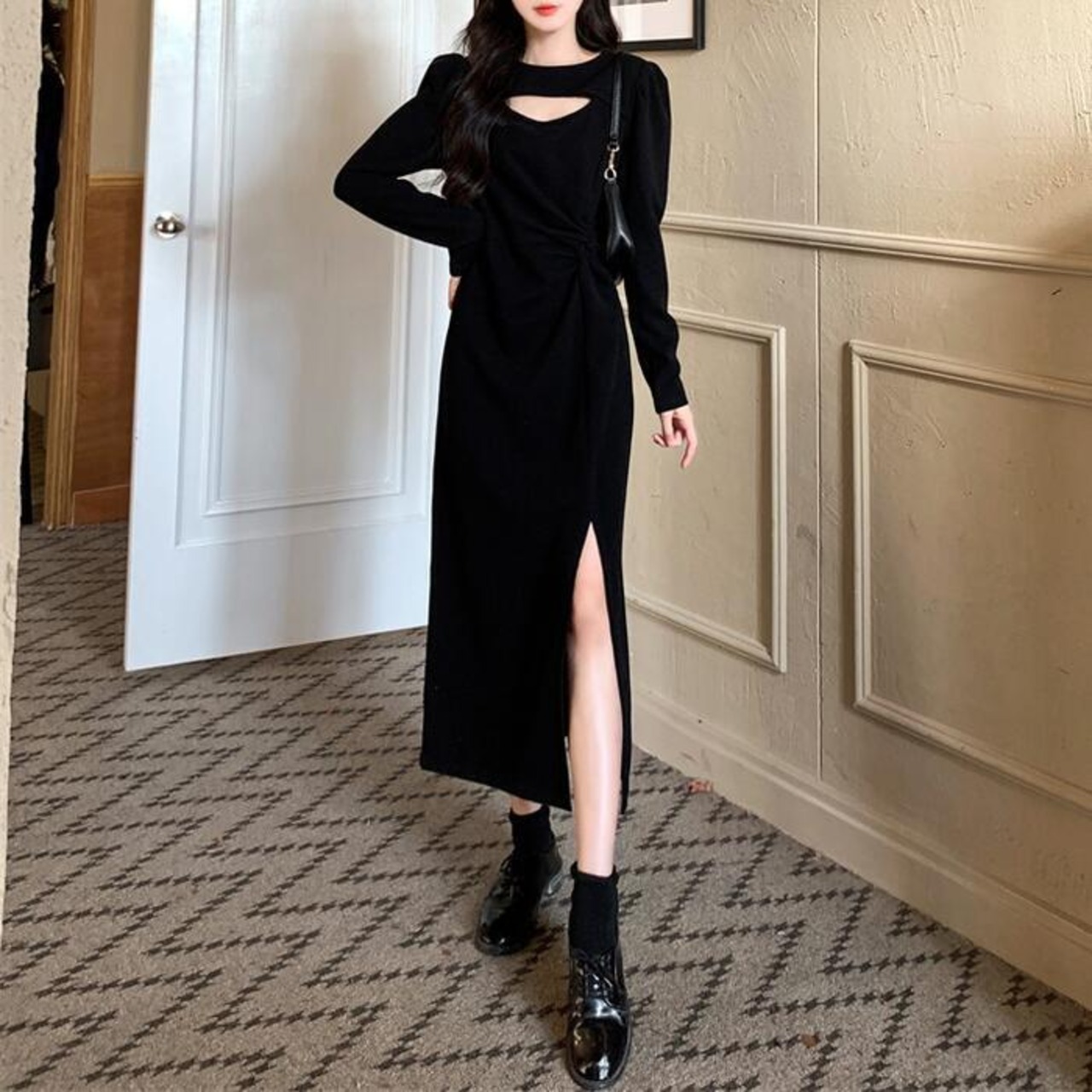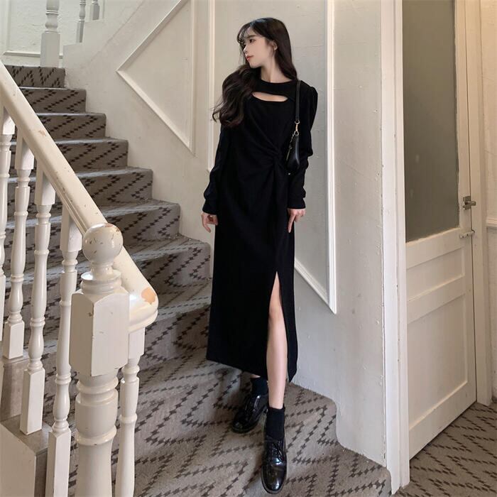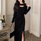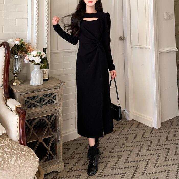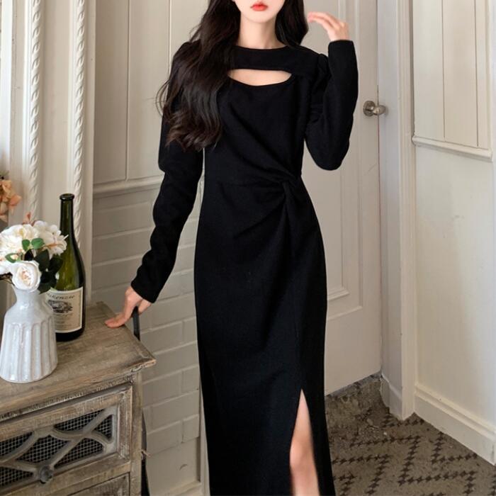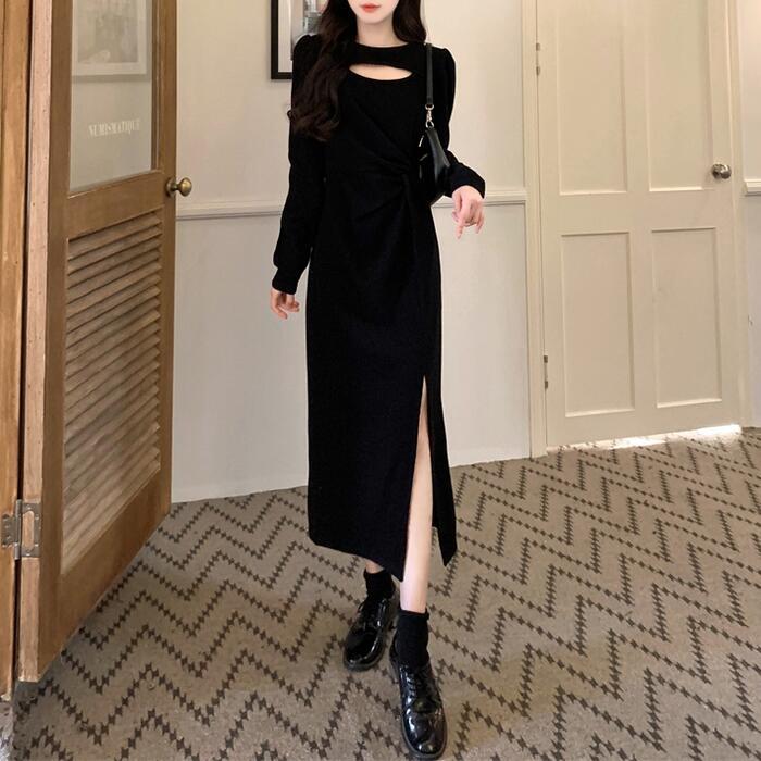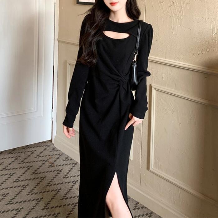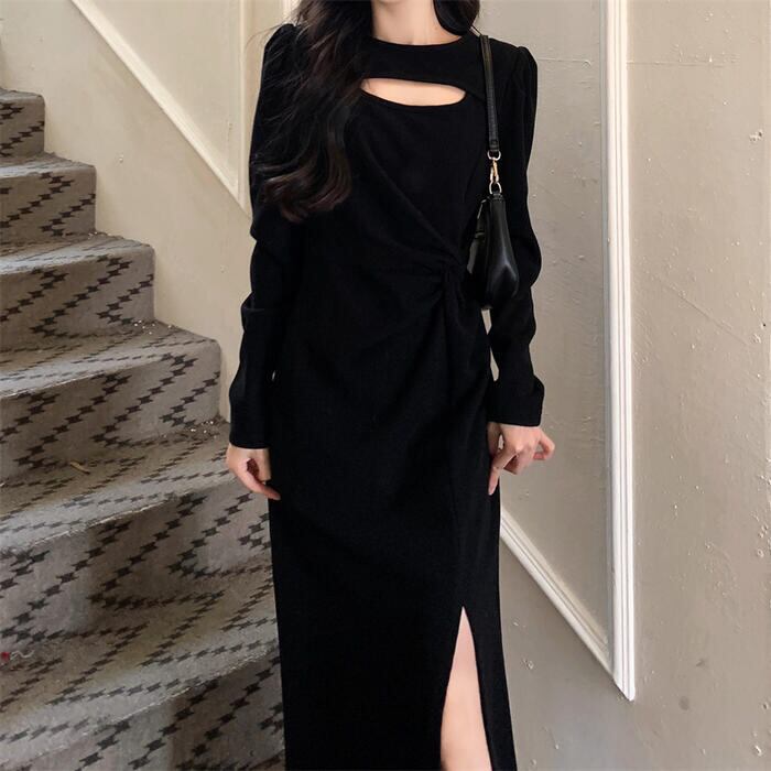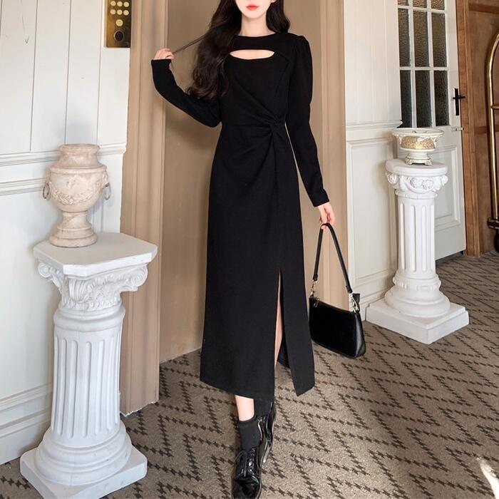 ワンピース ニット ドレス ワンピ 袖あり カットアウト レディース きれいめ エレガント カジュアル ミモレ丈 長袖 大人 可愛い フェミニン スリット 体型カバー 大きいサイズ ブラック 黒 春 秋 冬 20代 30代 40代 50代