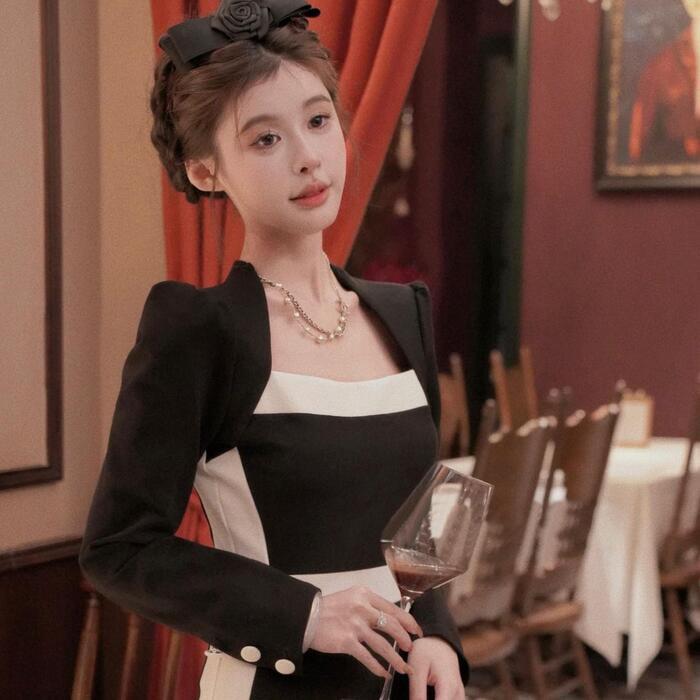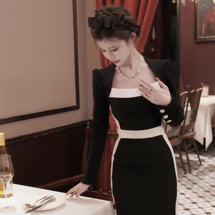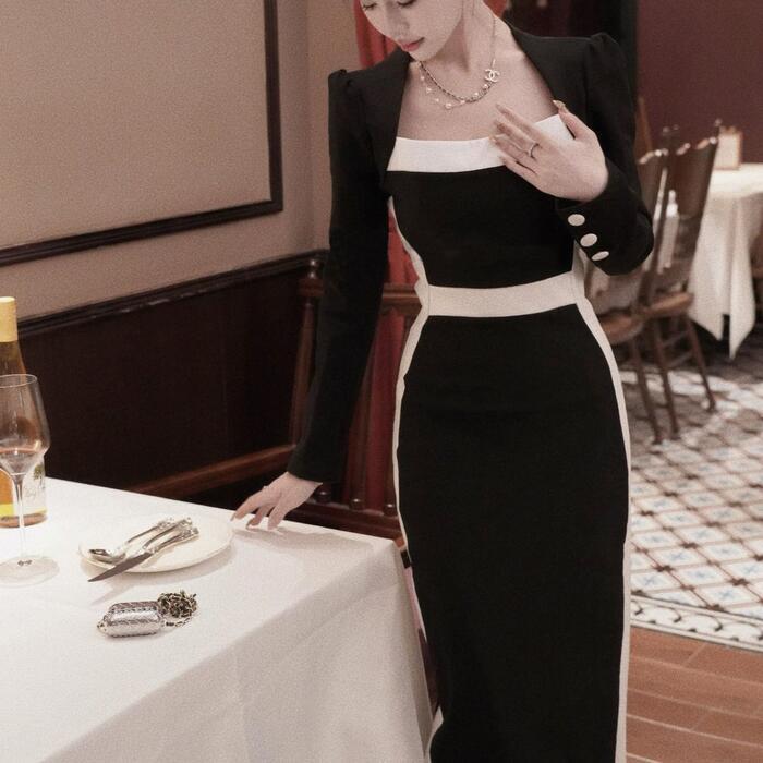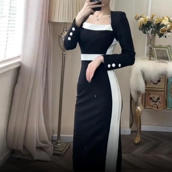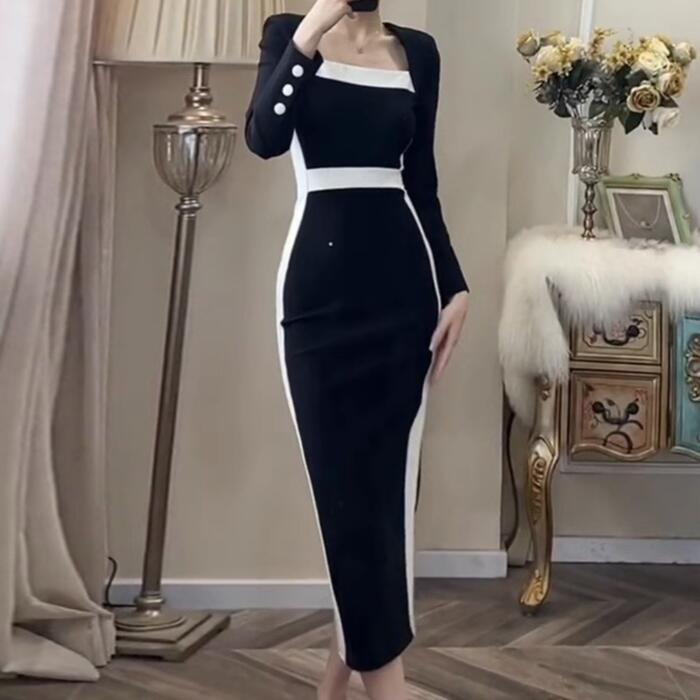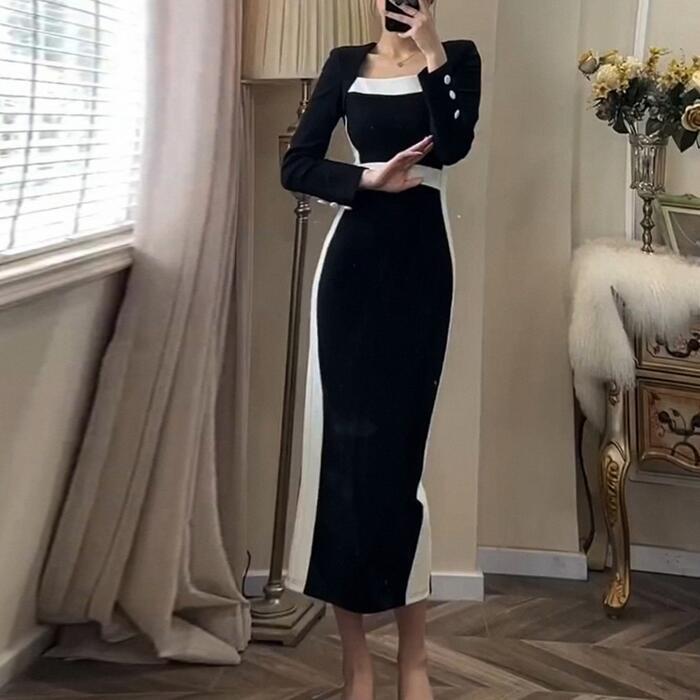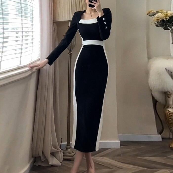 大きいサイズ お呼ばれ ワンピース ドレス 袖あり ライン レディース エレガント きれいめ カジュアル ミモレ丈 長袖 大人 可愛い フェミニン 切り替え ハイウエスト バイカラー 配色 オケージョン 二次会 オケージョン タイト スリム ブラック 黒 春 秋 冬 20代 30代 40代 50代