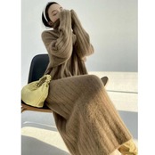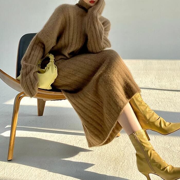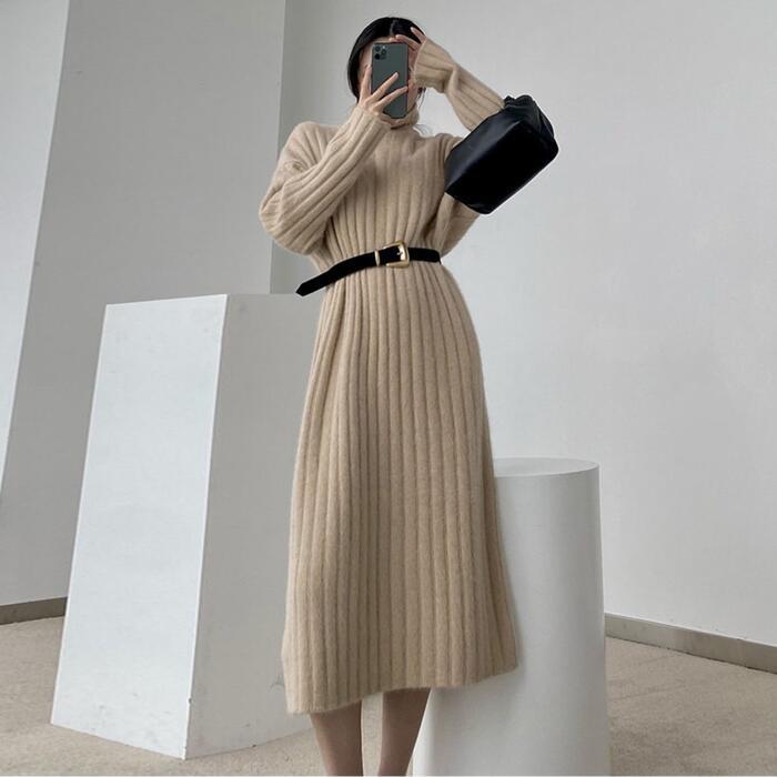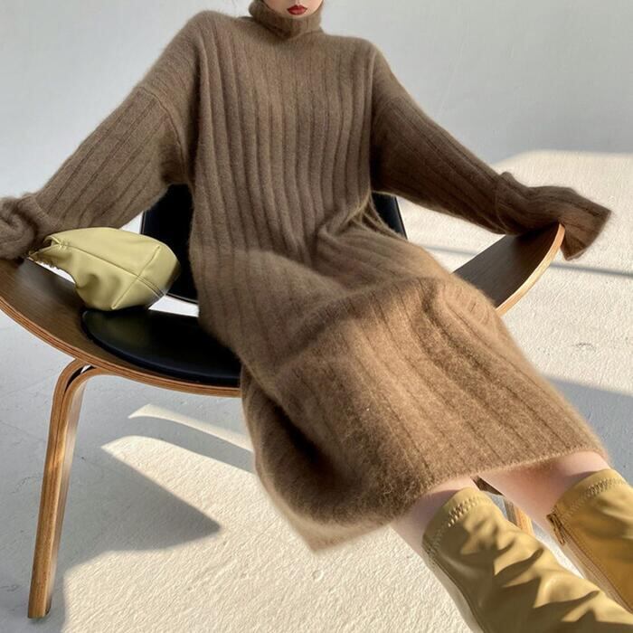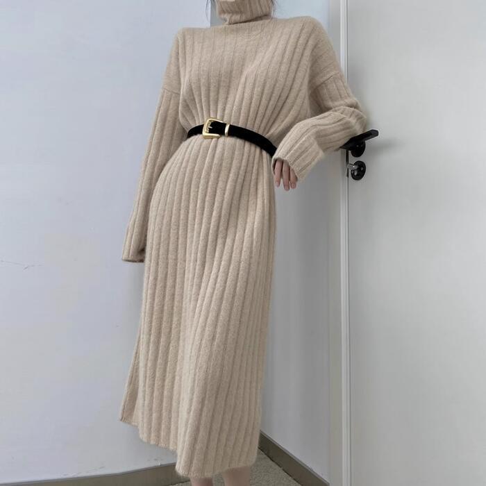 全2色 大きいサイズ ワンピース ニット ドレス タートルネック リブ ワンピ 袖あり レディース きれいめ エレガント カジュアル ミモレ丈 長袖 大人 可愛い フェミニン ゆったり 楽ちん 体型カバー シンプル 韓国 ベージュ ブラウン 春 秋 冬 20代 30代 40代 50代