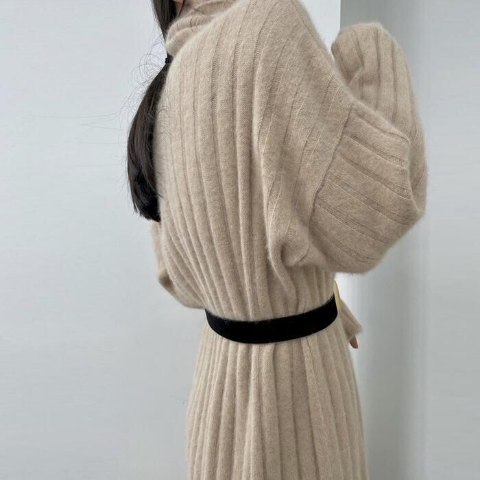 体のラインを拾わないゆったりシルエットのリブニットワンピース。