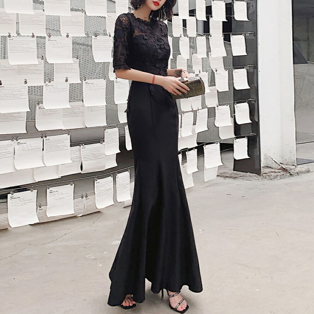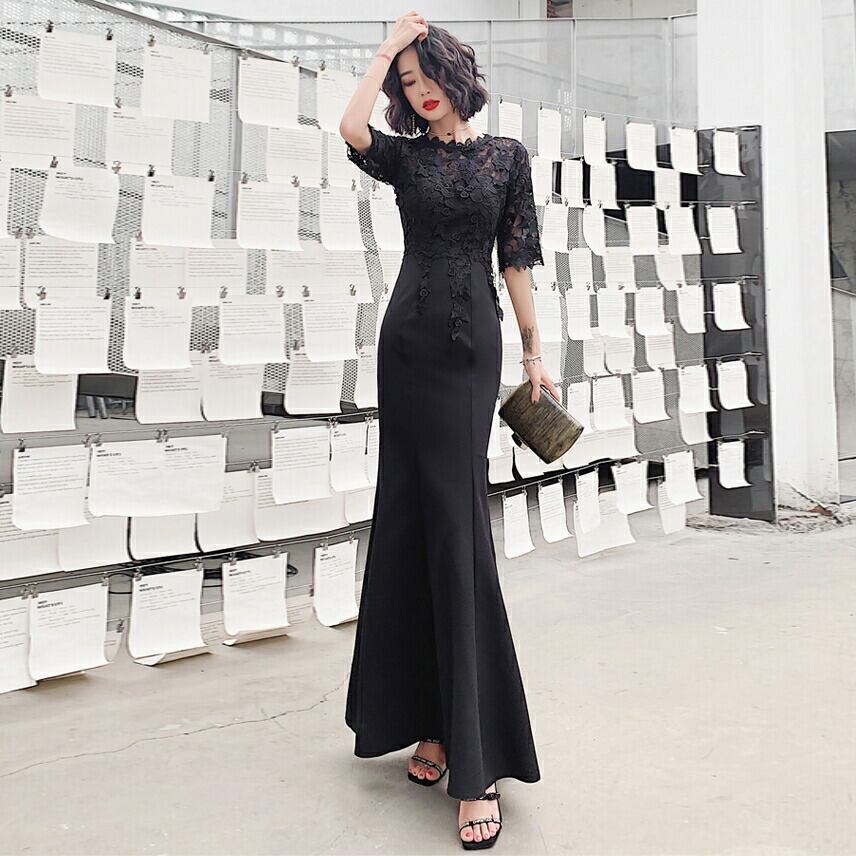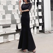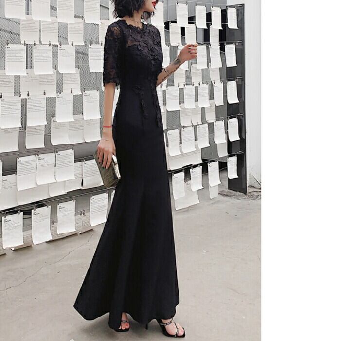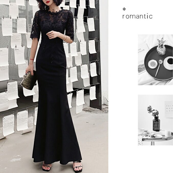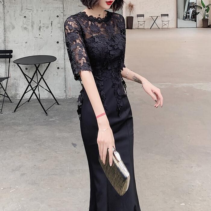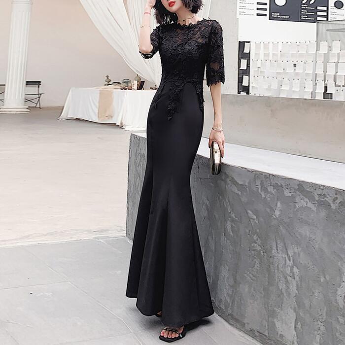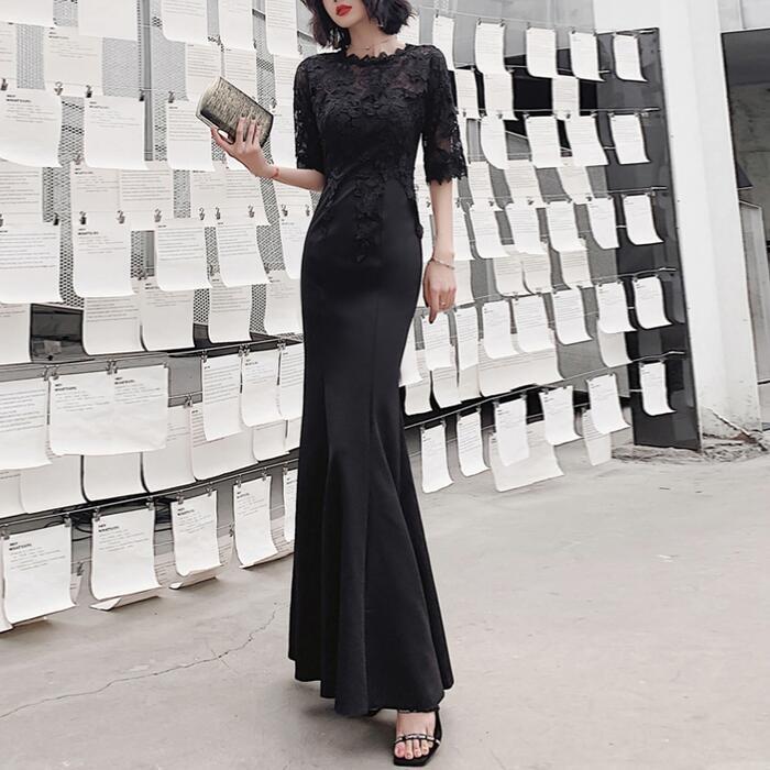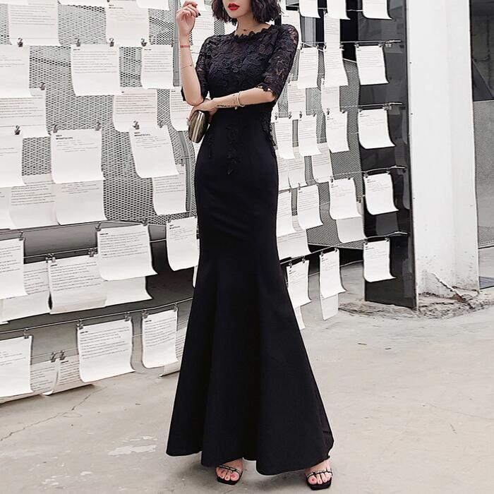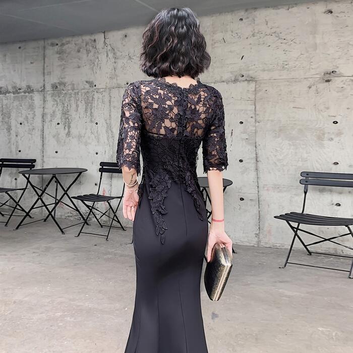 大きいサイズ お呼ばれ フォーマル 結婚式 ワンピース ドレス 袖あり レース シアー マーメイド レディース エレガント きれいめ カジュアル ロング丈 五分袖 大人 可愛い フェミニン 切り替え ハイウエスト 透け感 オケージョン 二次会 ブラック 黒 春 夏 秋 冬 20代 30代 40代 50代