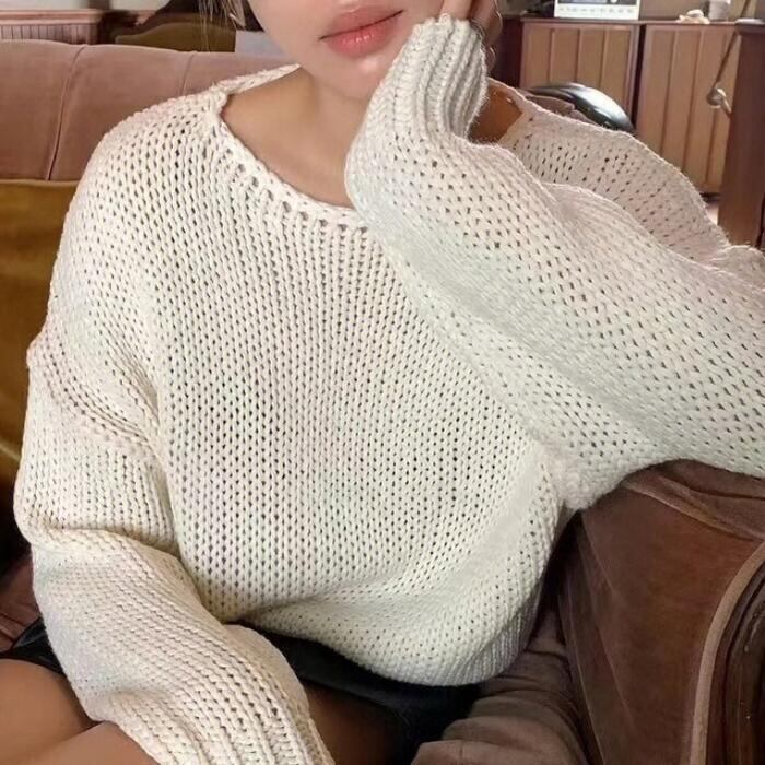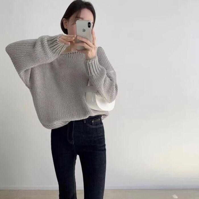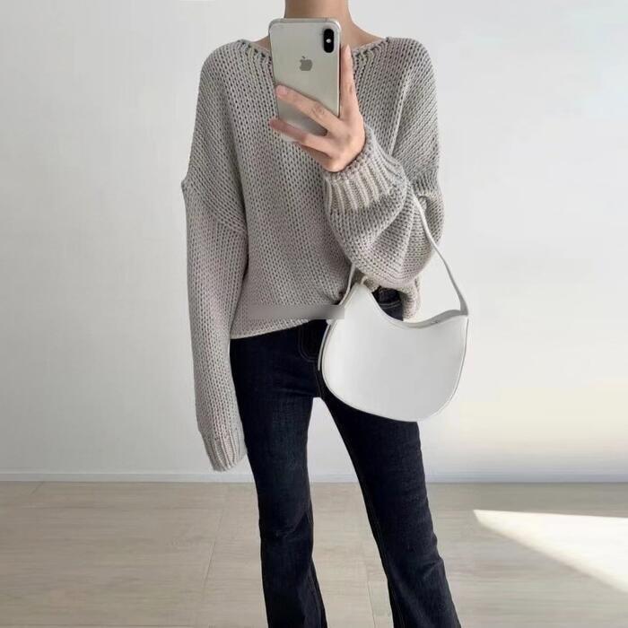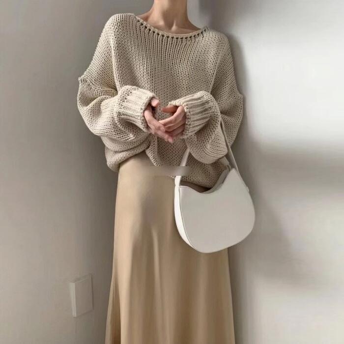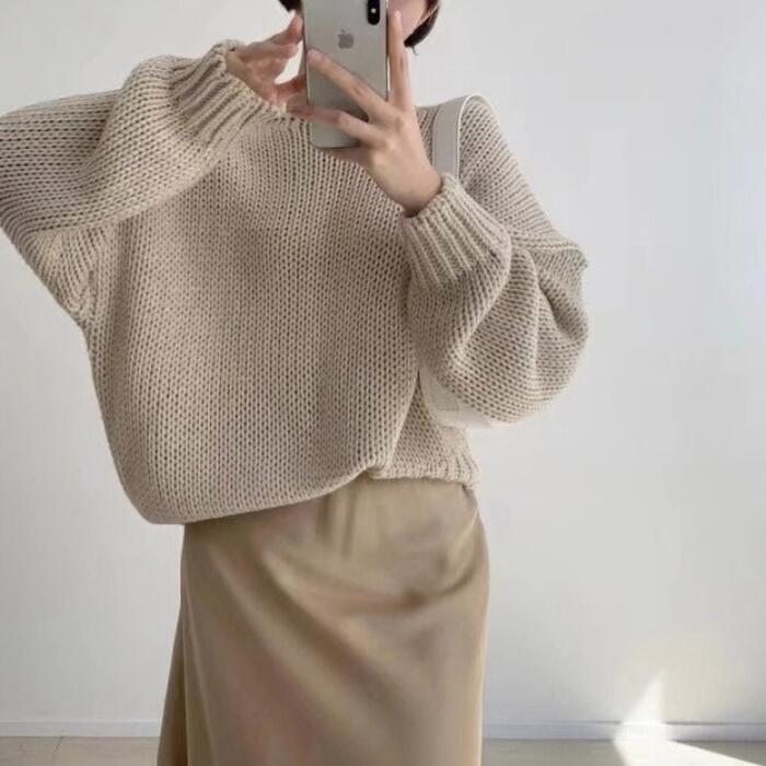 全3色 大きいサイズ トップス ニット ローゲージ セーター レディース エレガント きれいめ カジュアル 長袖 大人 可愛い フェミニン おしゃれ クルーネック プルオーバー シンプル 体型カバー 韓国 ホワイト 白 グレーベージュ 春 秋 冬 20代 30代 40代 50代
