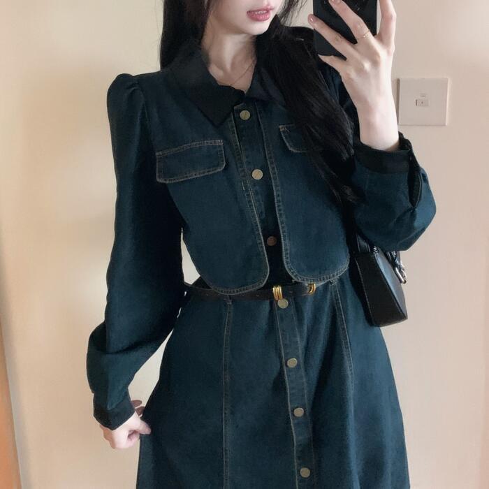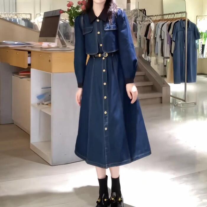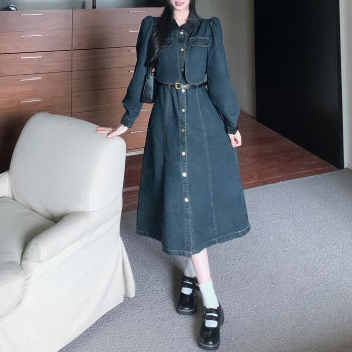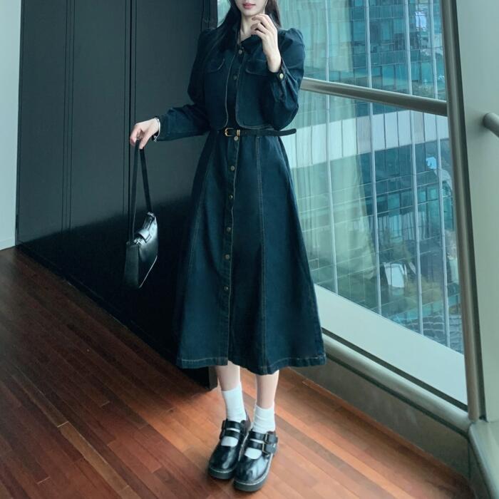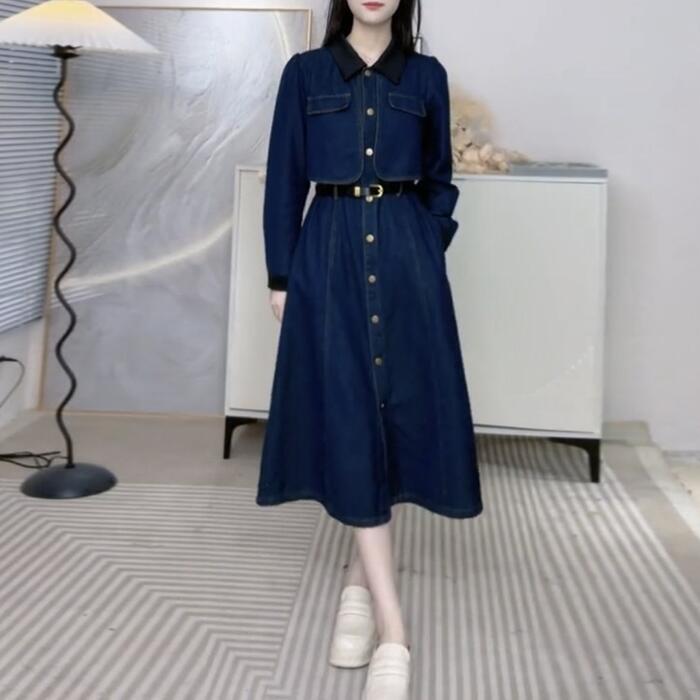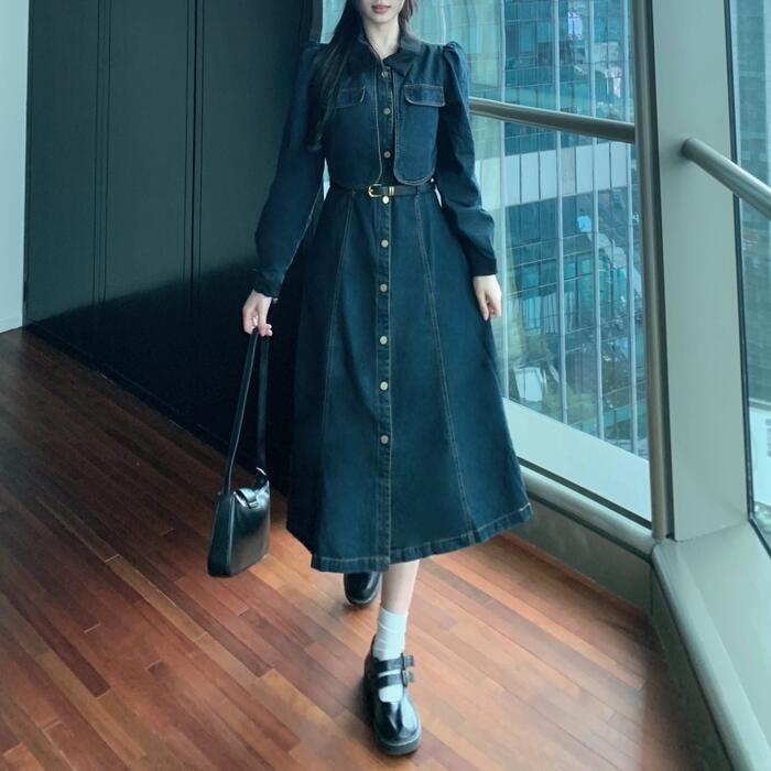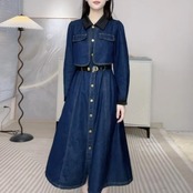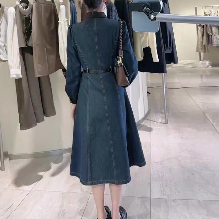大きいサイズ レイヤード風 ワンピース デニム 襟付き ワンピ ドレス 袖あり レディース きれいめ カジュアル ミモレ丈 長袖 大人 可愛い フェミニン Aライン ハイウエスト ウエストベルト 体型カバー 韓国 青 ブルー 春 秋 冬 20代 30代 40代 50代