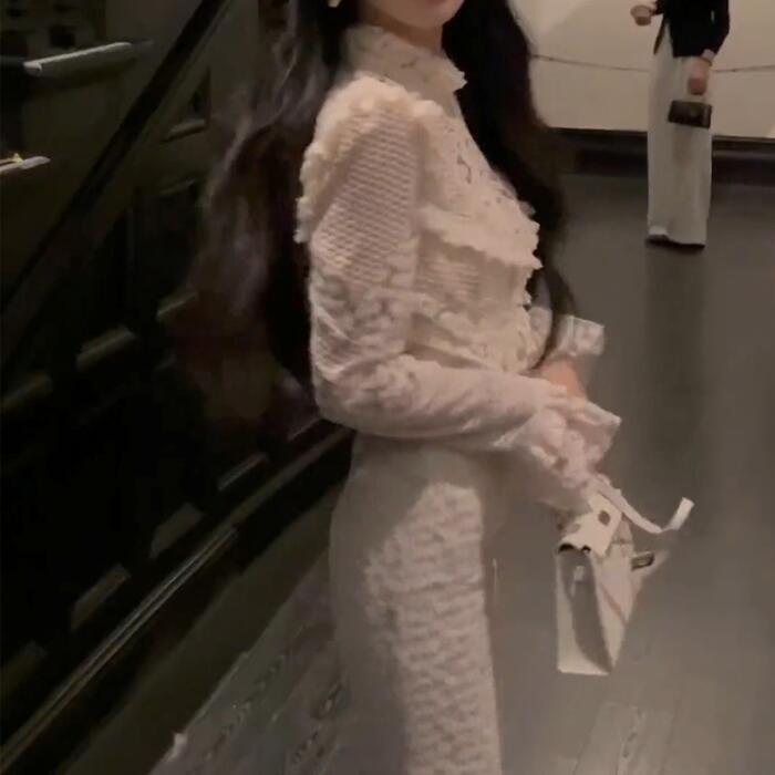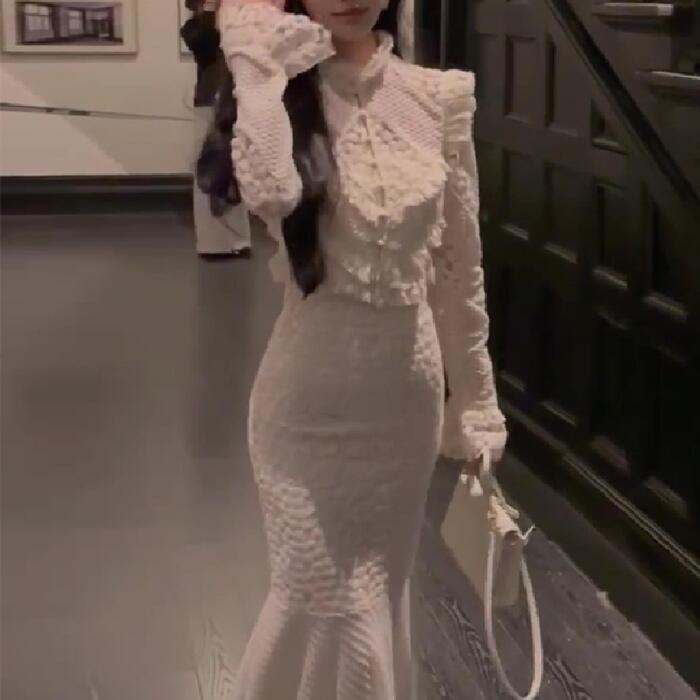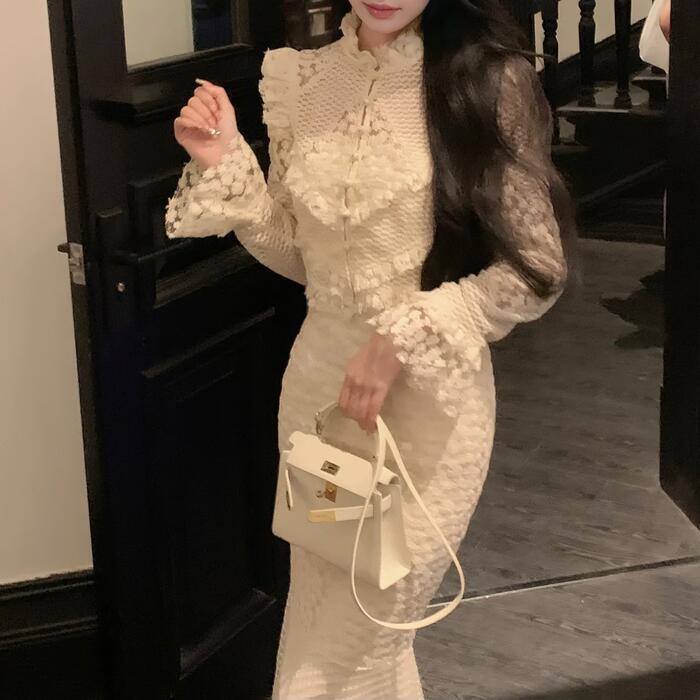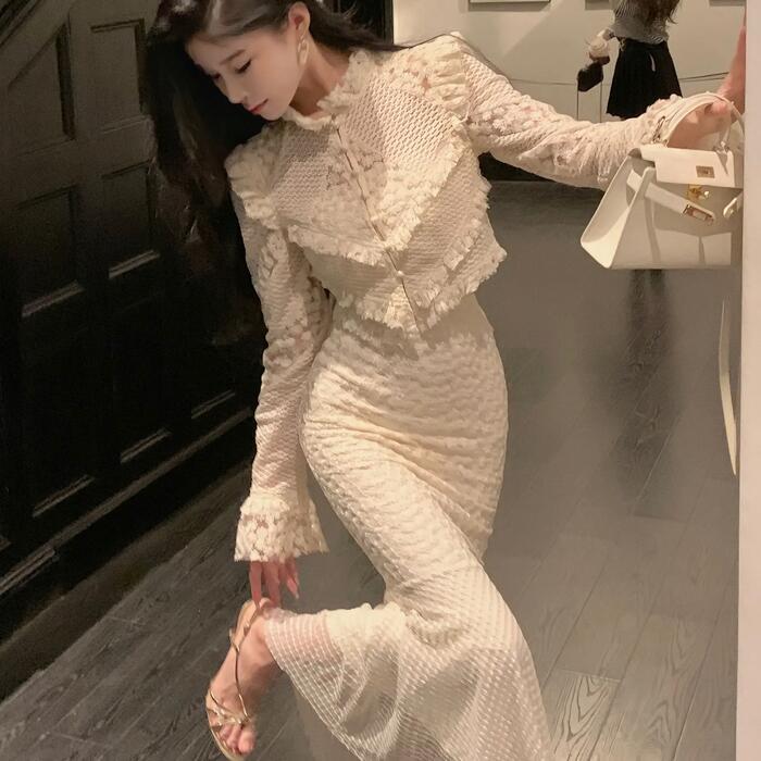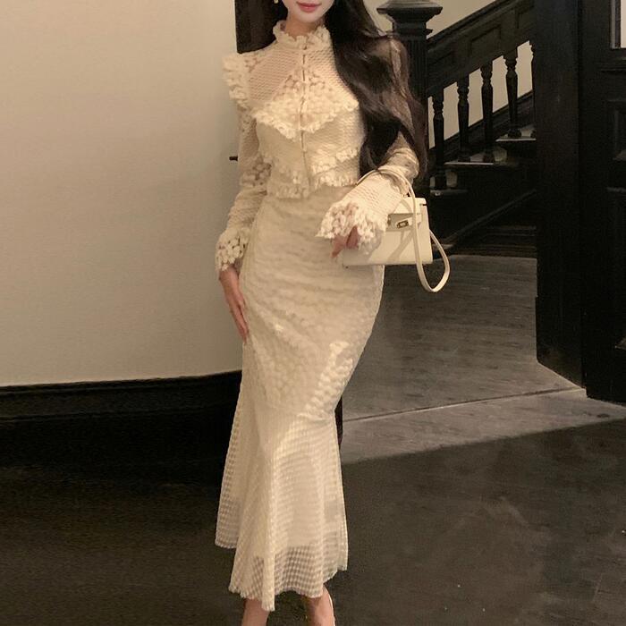 セットアップ 2点セット レース スーツ ブラウス スカート マーメイド 長袖 フリル ショート丈 おしゃれ 大人 可愛い エレガント きれいめ カジュアル フェミニン パーティー お呼ばれ オケージョン ベージュ 春 秋 冬 20代 30代 40代 50代