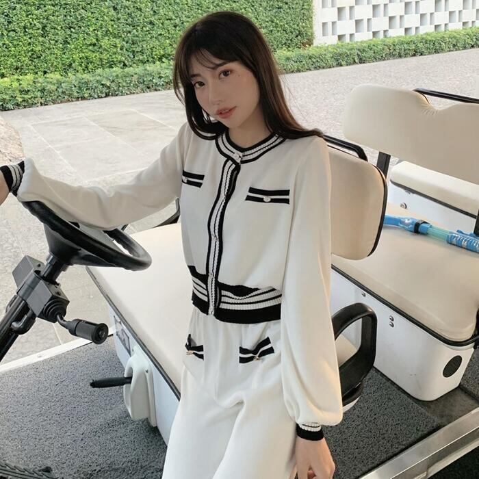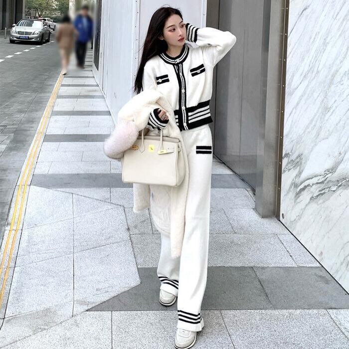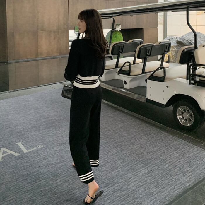 配色ラインがアクセントになったニットセットアップ。