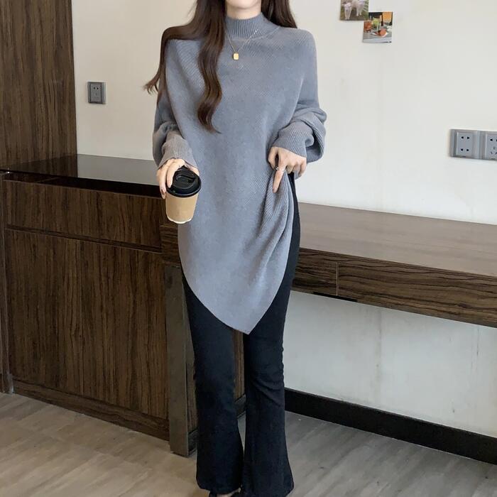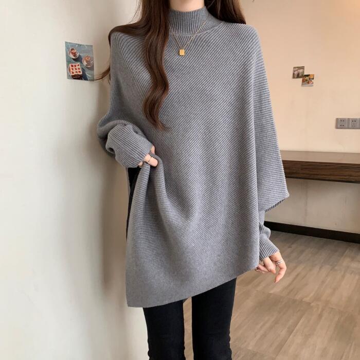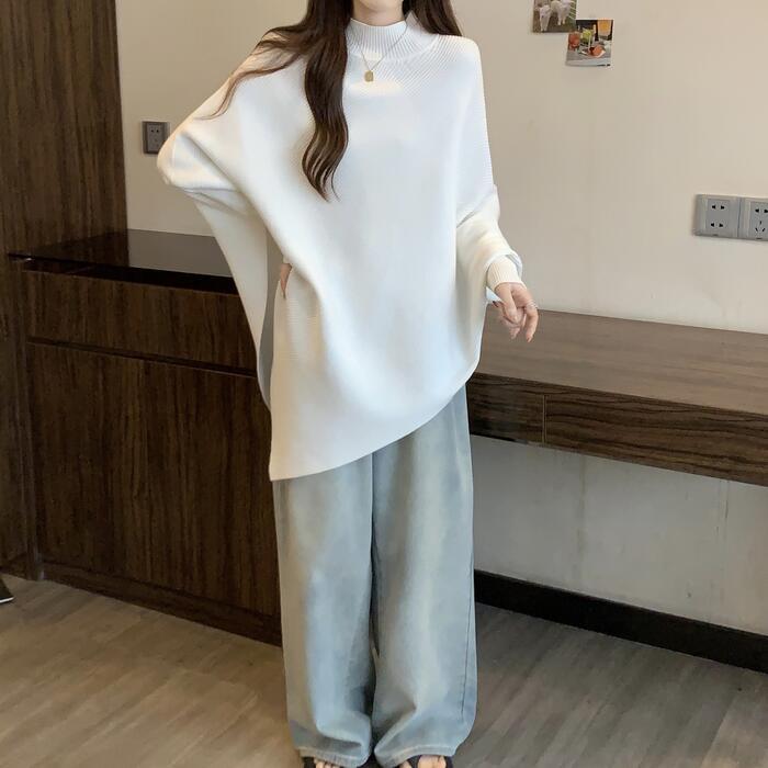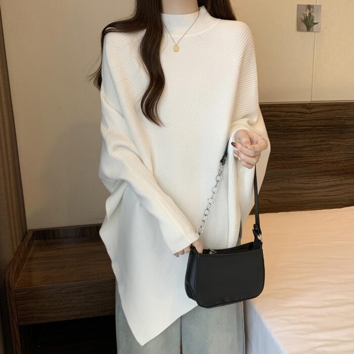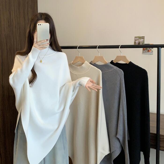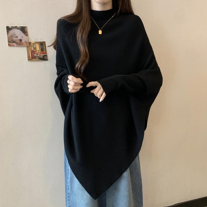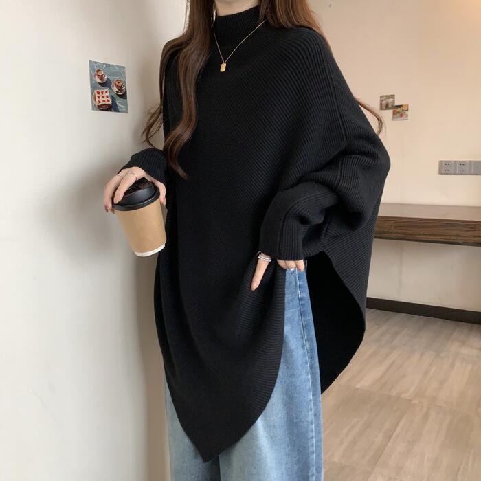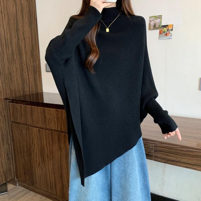 全4色 大きいサイズ 体型カバー ゆったり シンプル トップス ニット ドルマンスリーブ アシンメトリー レディース エレガント きれいめ カジュアル 長袖 ポンチョ ハイネック 大人 可愛い フェミニン おしゃれ プルオーバー ホワイト 白 ベージュ グレー ブラック 黒 春 秋 冬 20代 30代 40代 50代