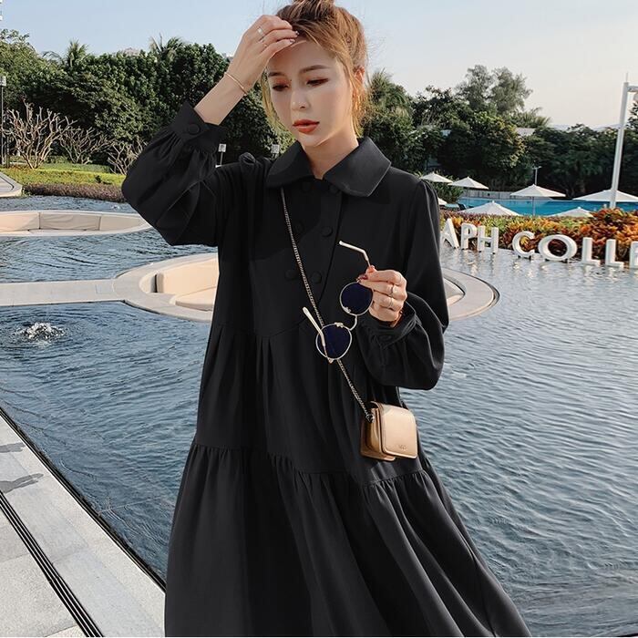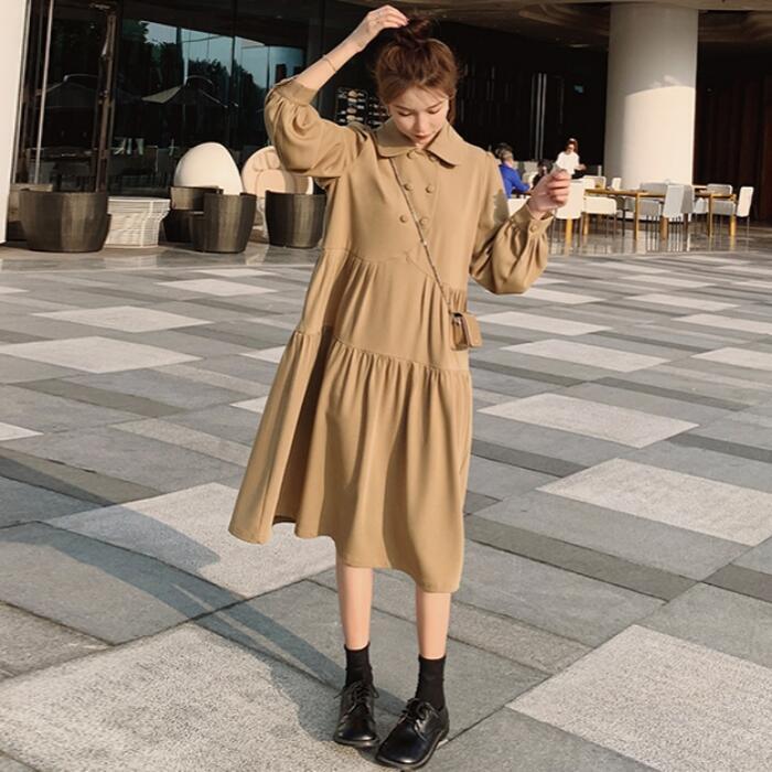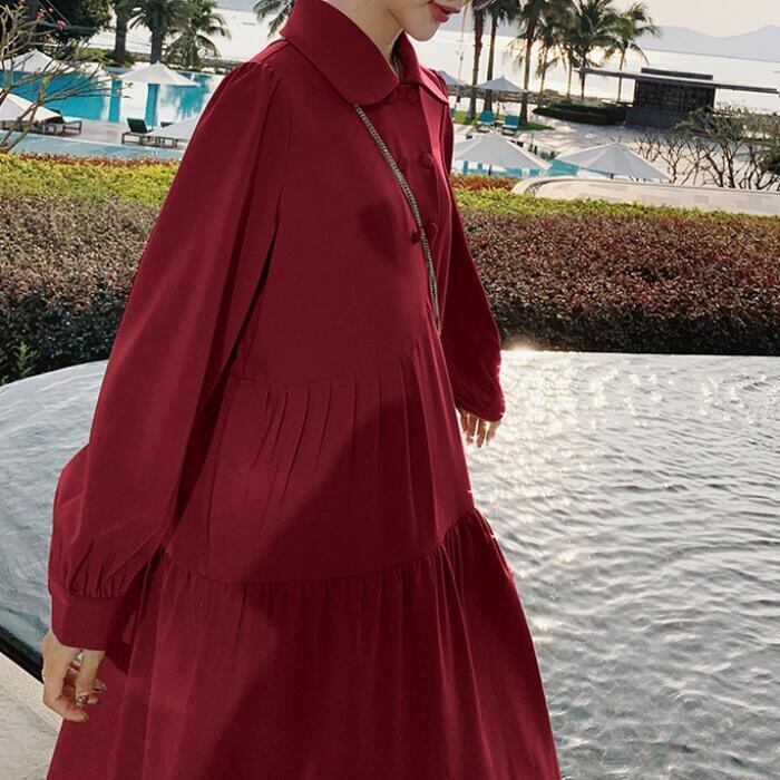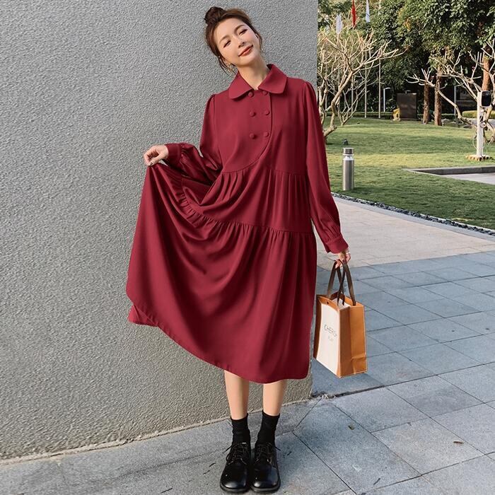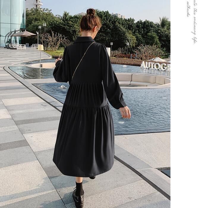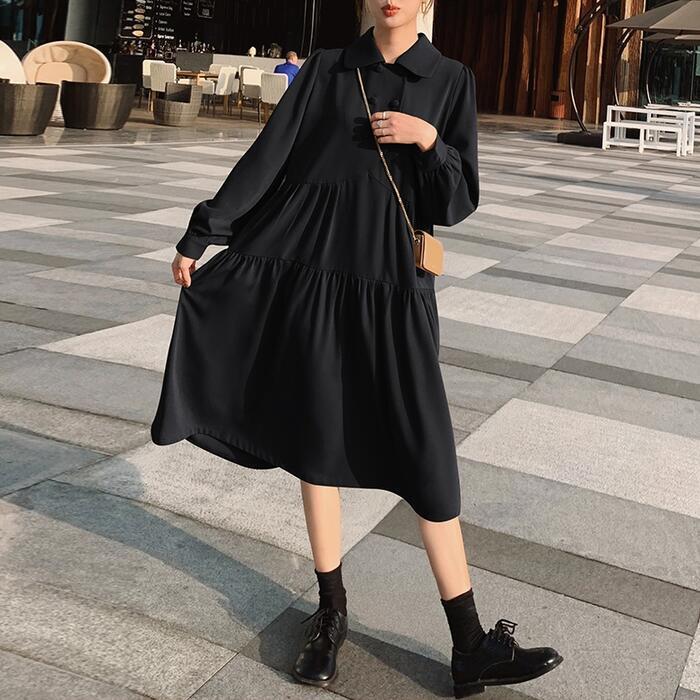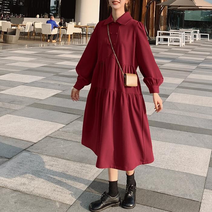 全3色 大きいサイズ 体型カバー ティアード ワンピース ドレス ワンピ 袖あり レディース エレガント きれいめ カジュアル ミモレ丈 長袖 大人 可愛い フェミニン ゆったり 楽ちん シンプル ナチュラル 韓国 ベージュ レッド 赤 ブラック 黒 春 秋 冬 20代 30代 40代 50代