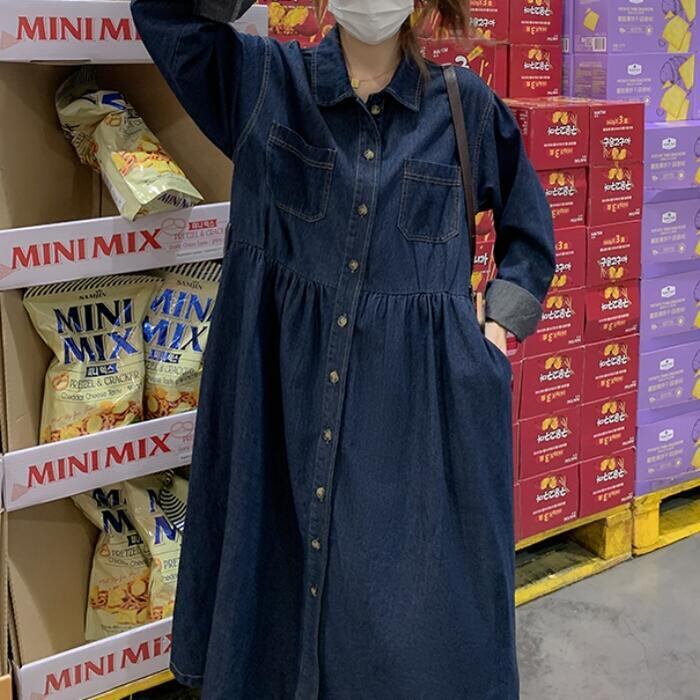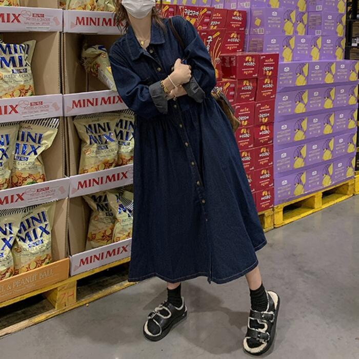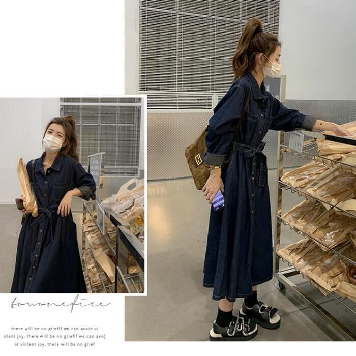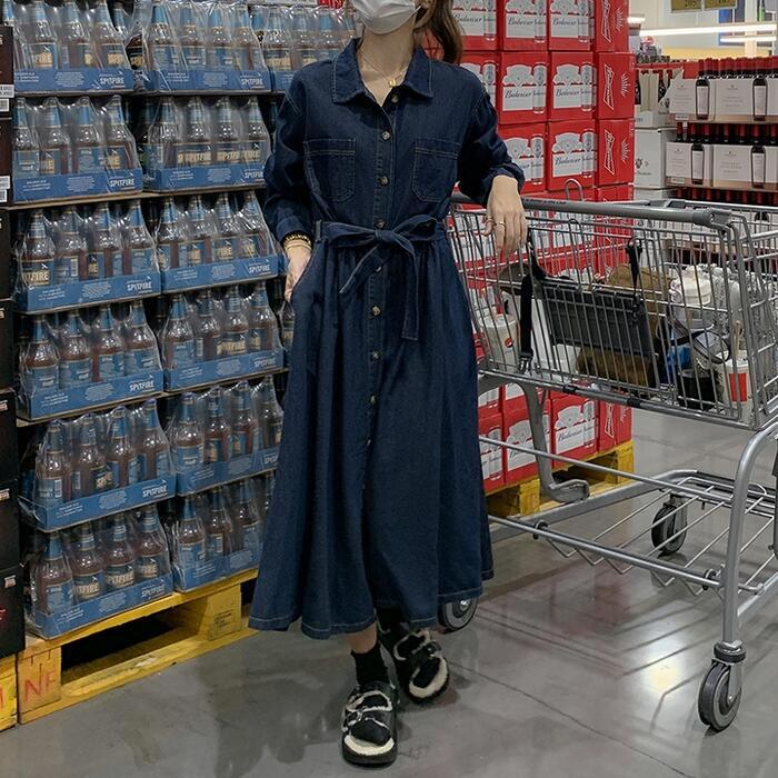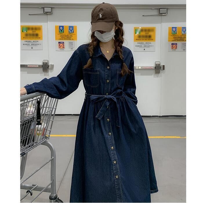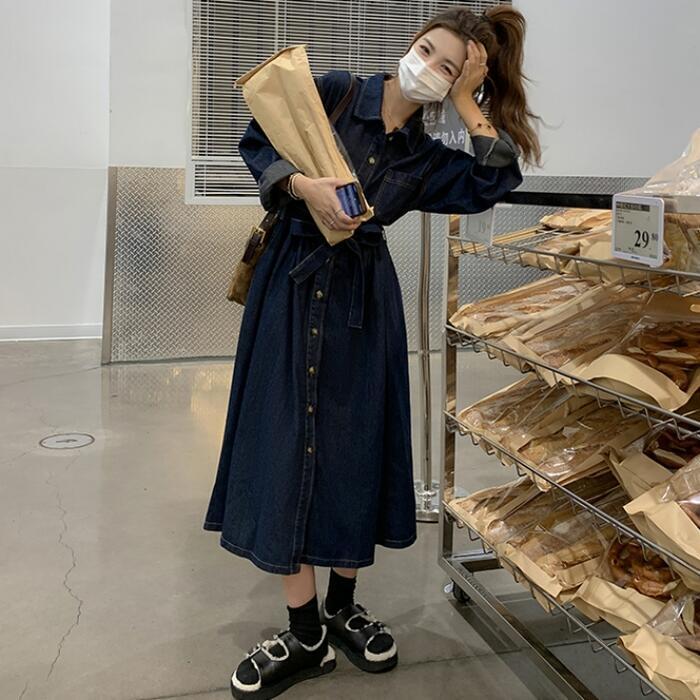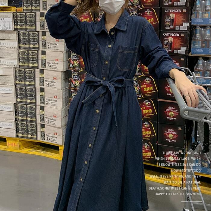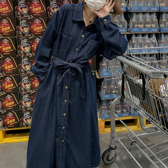 大きいサイズ 体型カバー デニム ワンピース ドレス ワンピ 袖あり レディース シャツワンピ エレガント きれいめ カジュアル ミモレ丈 長袖 大人 可愛い フェミニン ゆったり 楽ちん シンプル ウエストベルト 韓国 青 ブルー 春 秋 冬 20代 30代 40代 50代