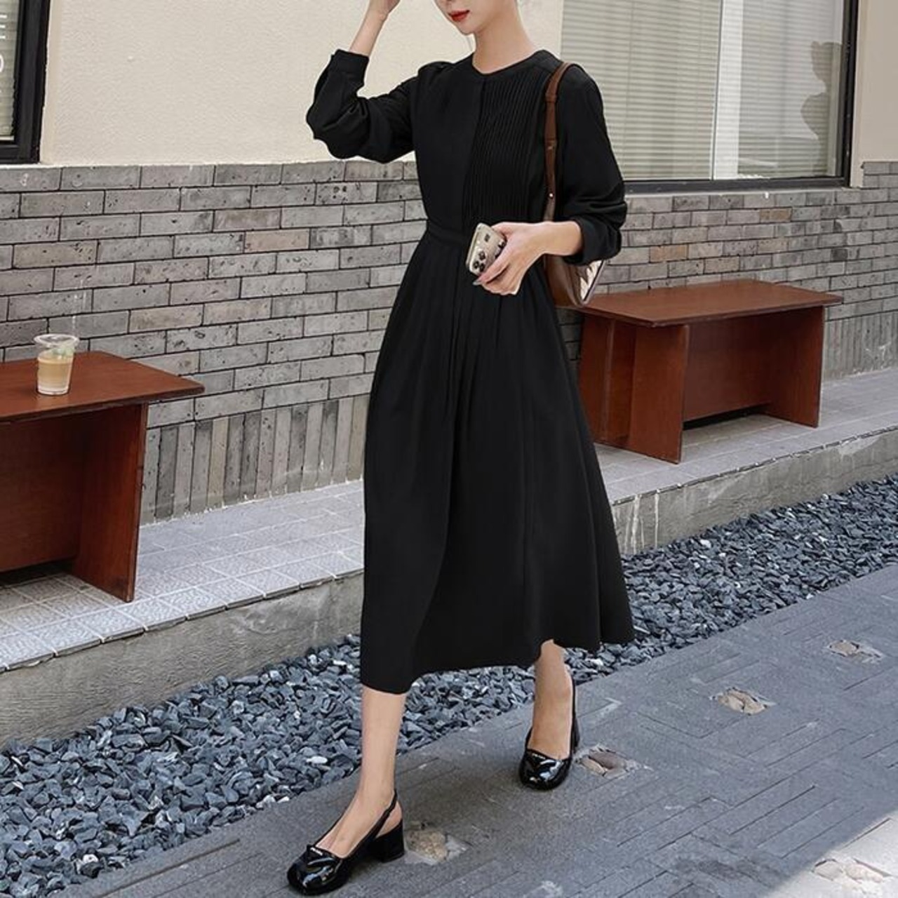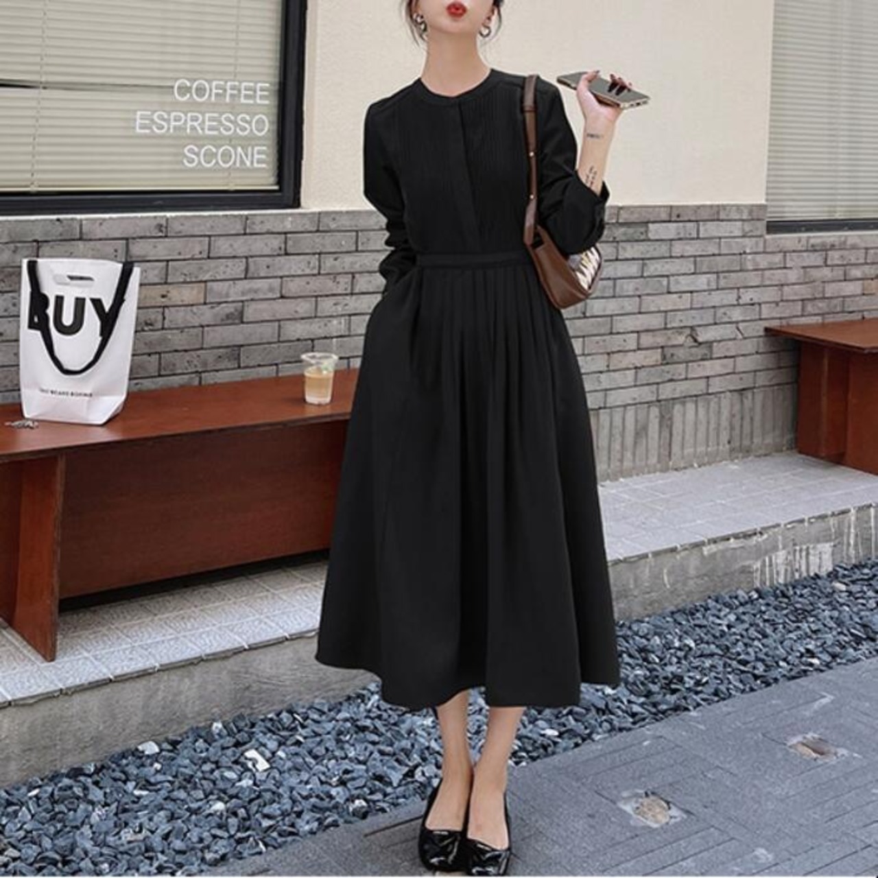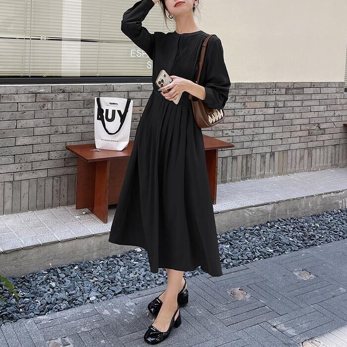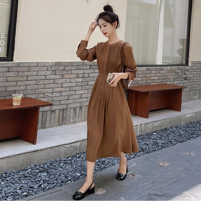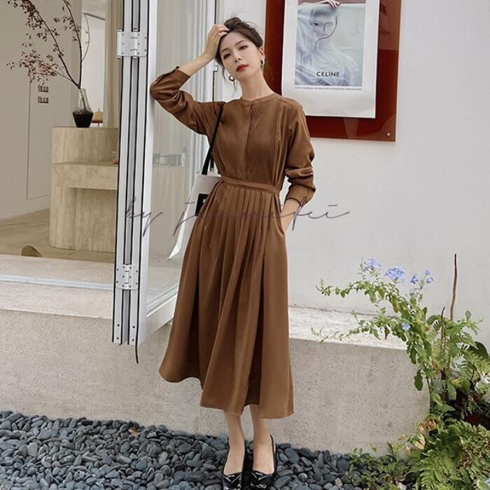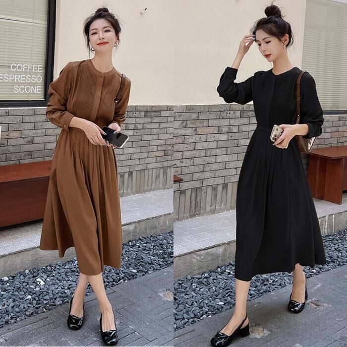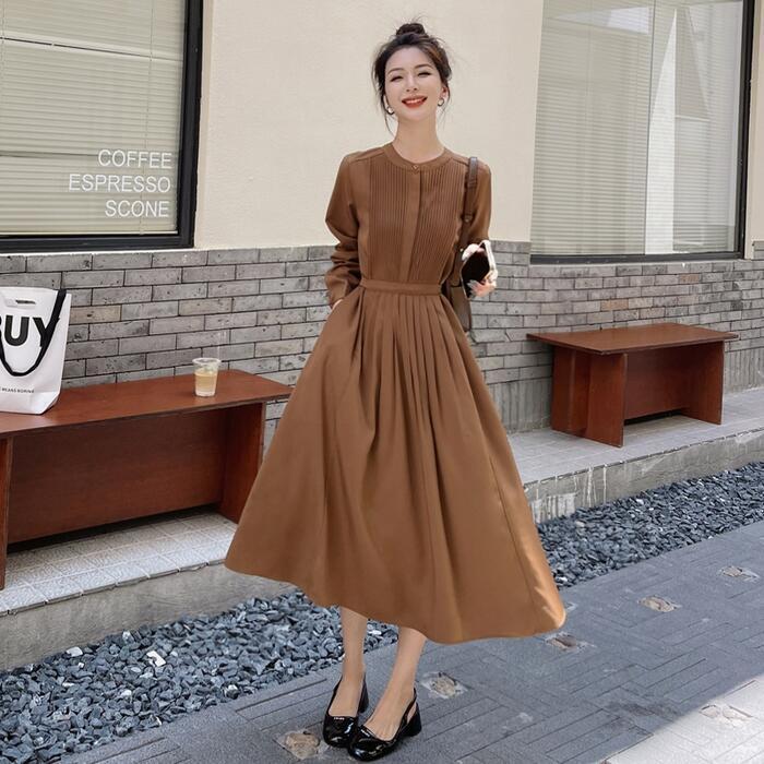 全2色 大きいサイズ 体型カバー ワンピース ドレス ワンピ 袖あり プリーツ レディース シャツワンピ エレガント きれいめ カジュアル ミモレ丈 長袖 大人 可愛い フェミニン ハイウエスト シンプル 韓国 ブラウン ブラック 黒 春 秋 冬 20代 30代 40代 50代