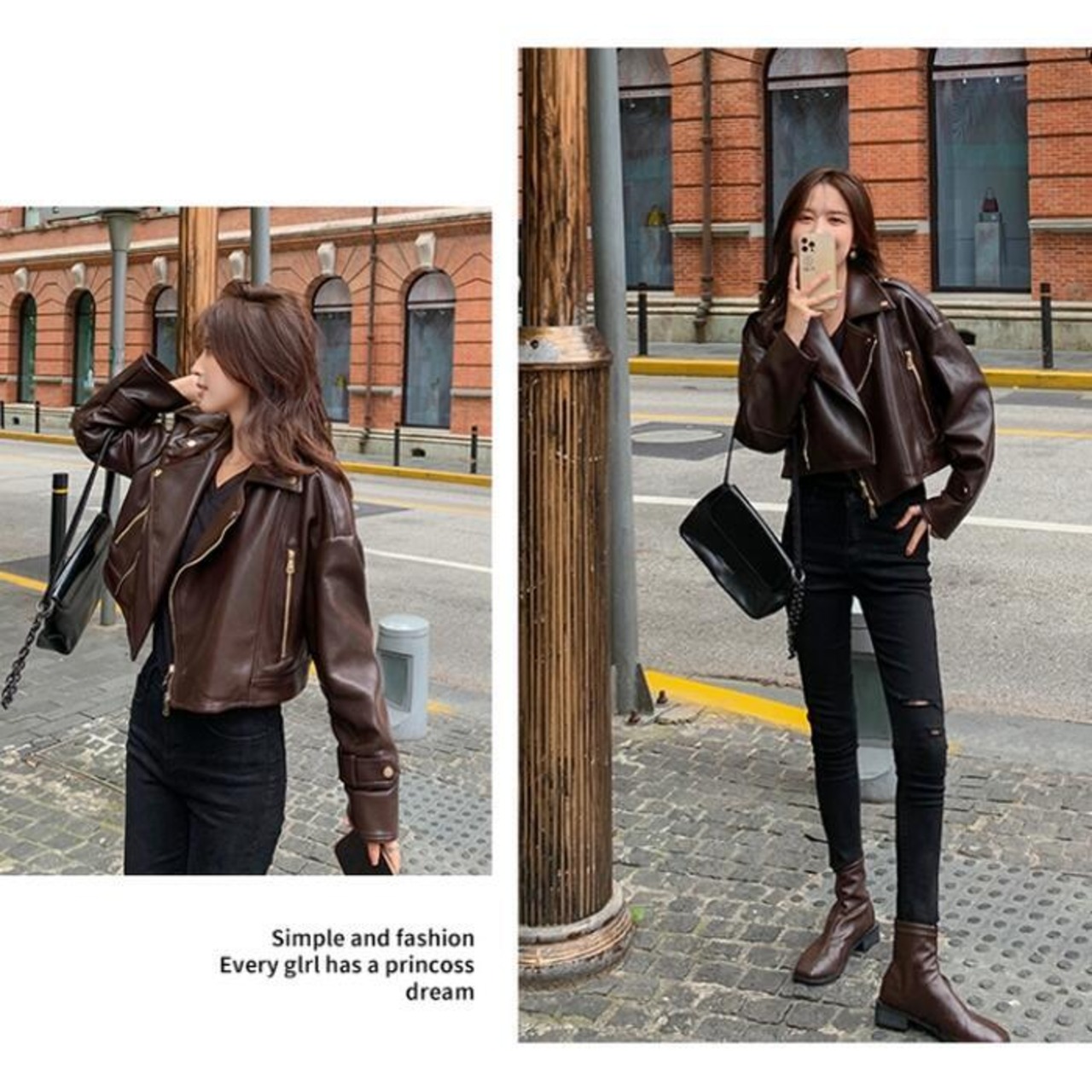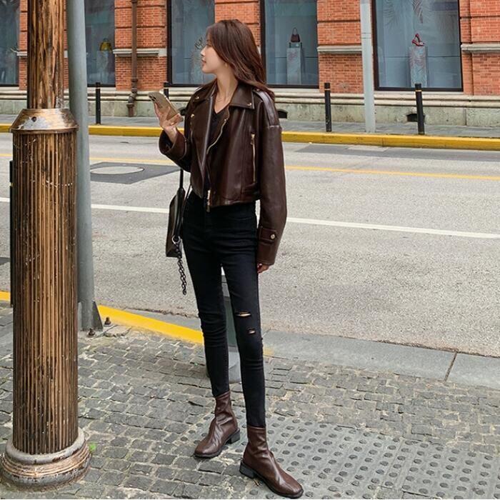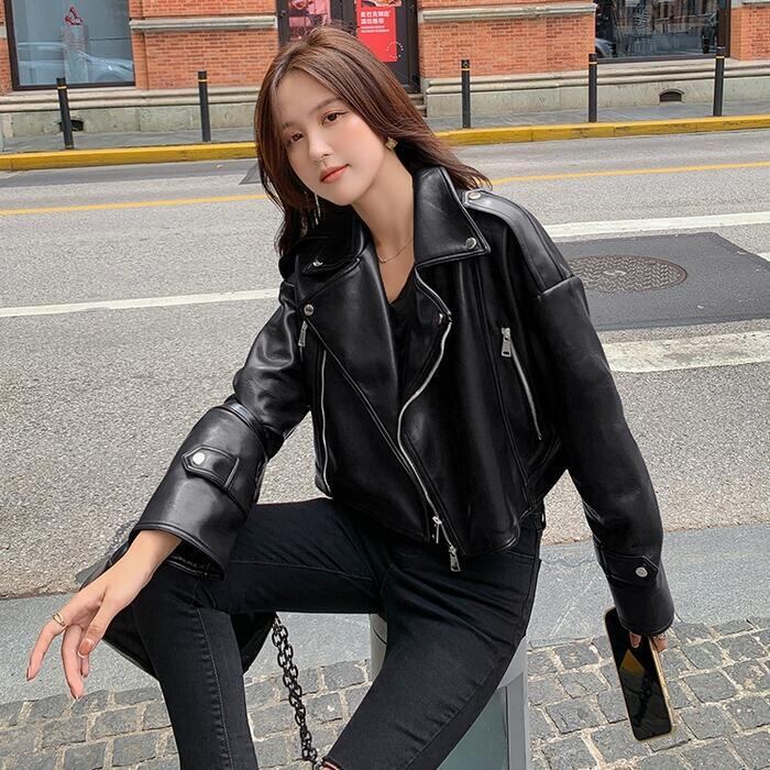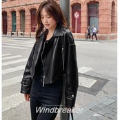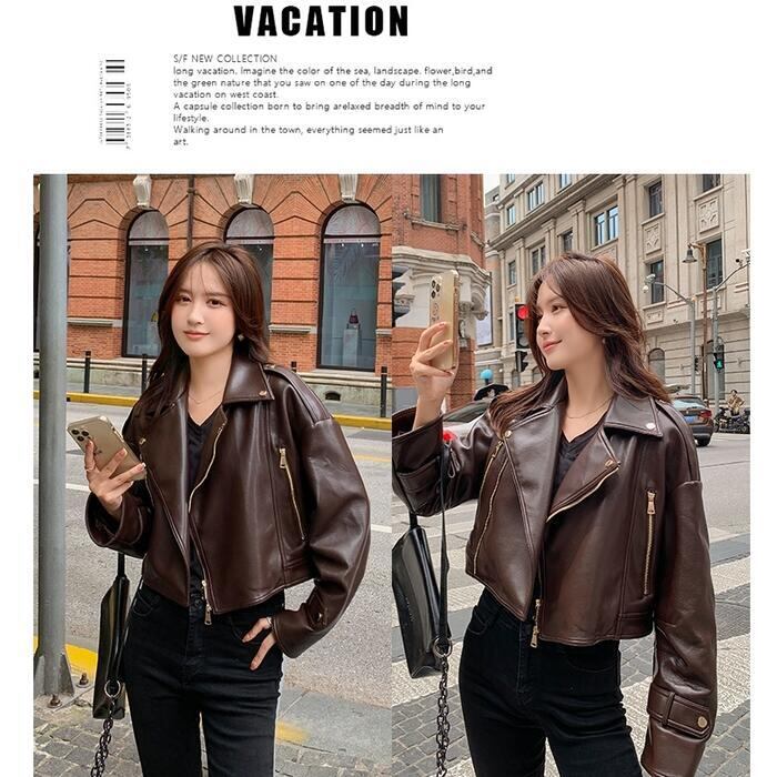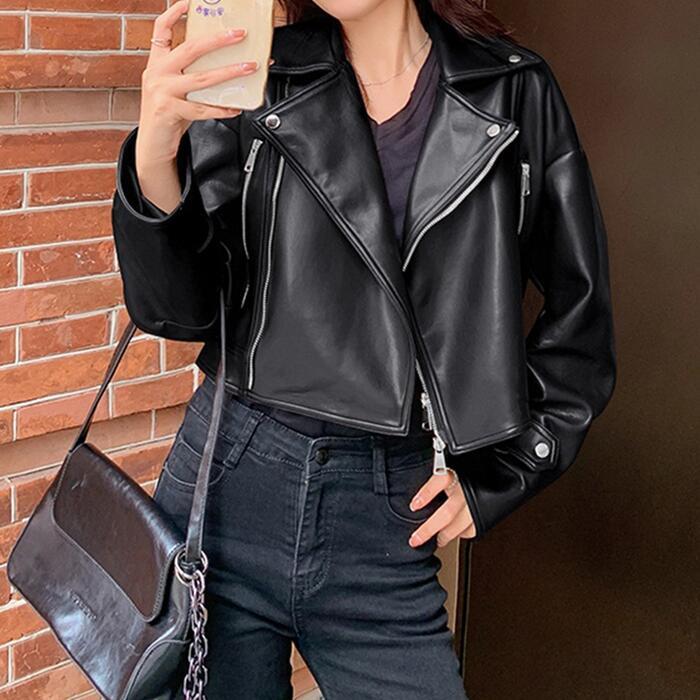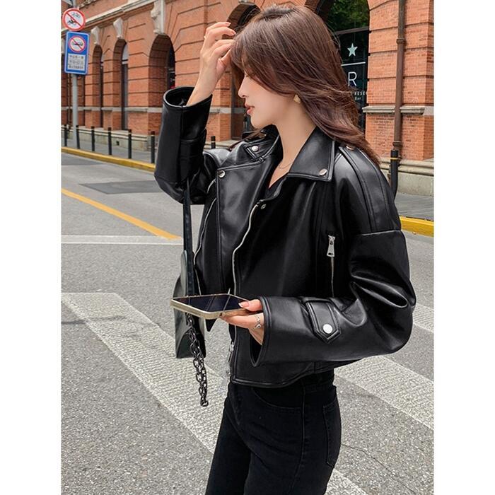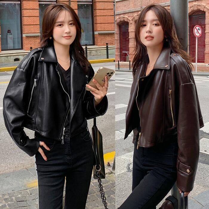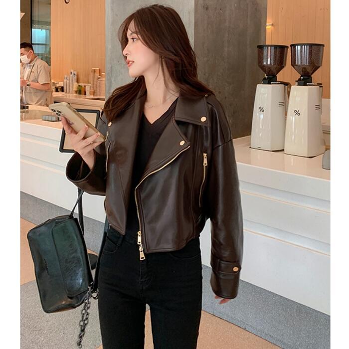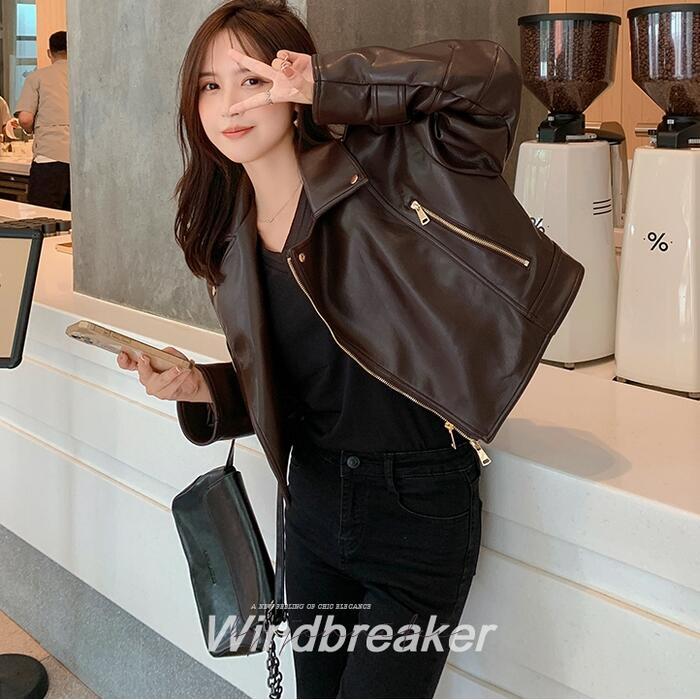 全2色 大きいサイズ 体型カバー フェイクレザー アウター コート ジャケット ライダースジャケット レディース エレガント きれいめ カジュアル 長袖 大人 フェミニン ショート丈 かっこいい マニッシュ おしゃれ 韓国 ブラウン ブラック 黒 春 秋 冬 20代 30代 40代 50代