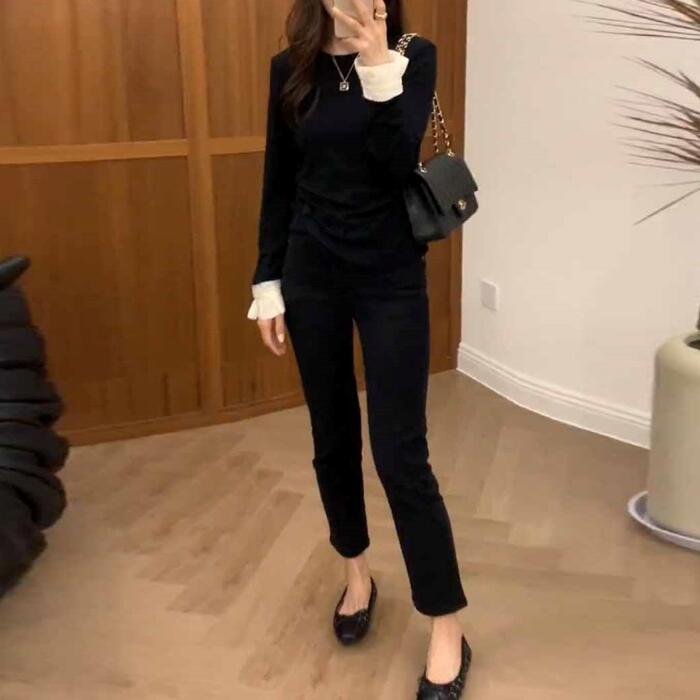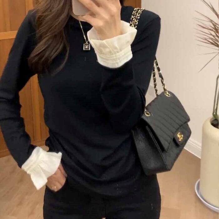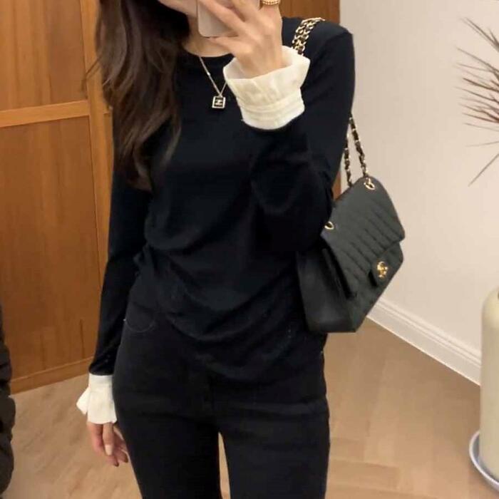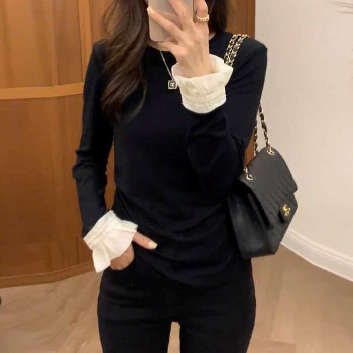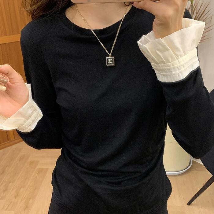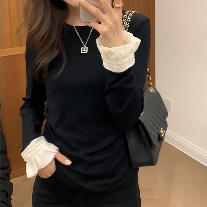 トップス Tシャツ カットソー フリル 配色 バイカラー レディース エレガント きれいめ カジュアル 長袖 プルオーバー 大人 可愛い フェミニン シンプル おしゃれ インナー 大きいサイズ 韓国 ブラック 黒 春 秋 冬 20代 30代 40代 50代