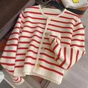 全2色 体型カバー トップス ニット カーディガン ボーダー レディース エレガント きれいめ カジュアル 長袖 プルオーバー 大人 可愛い フェミニン おしゃれ マリン シンプル 通勤 オフィス 韓国 レッド 赤 ブラック 黒 春 秋 冬 20代 30代 40代 50代
