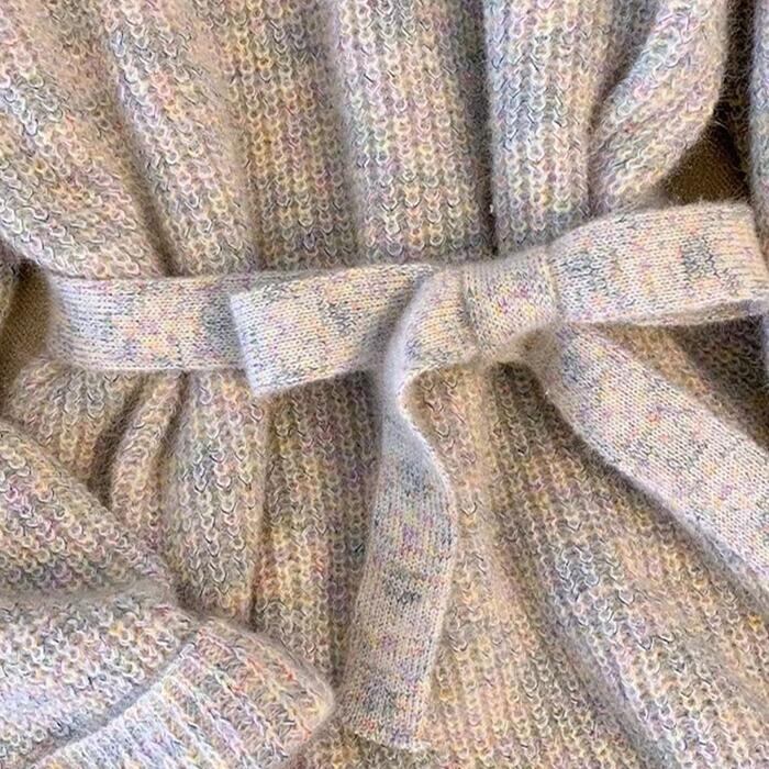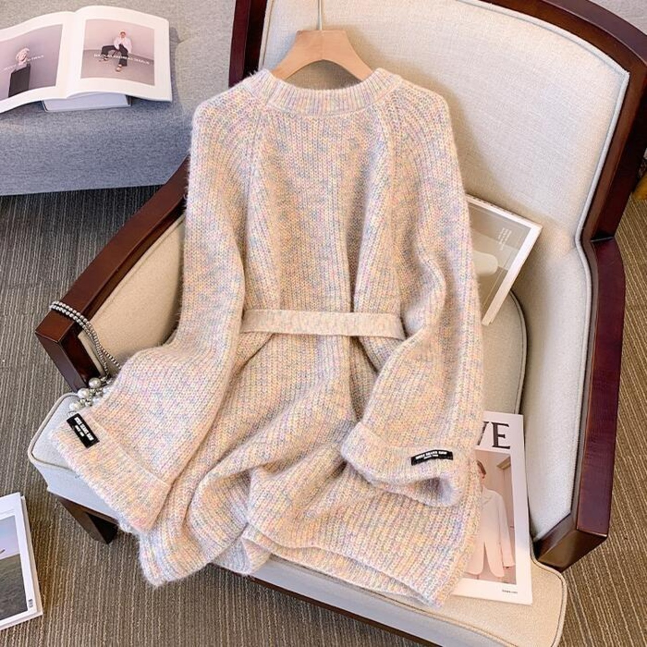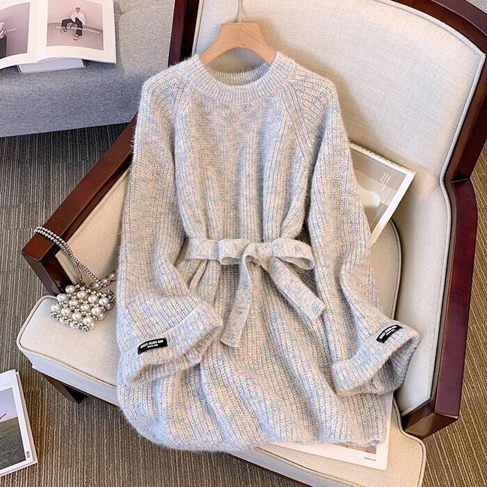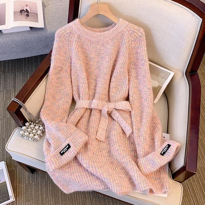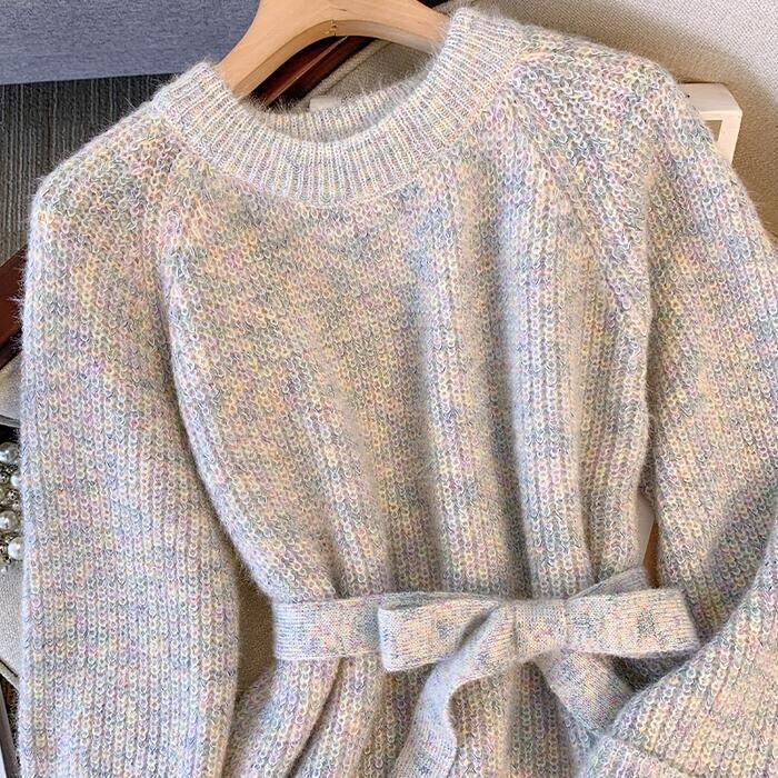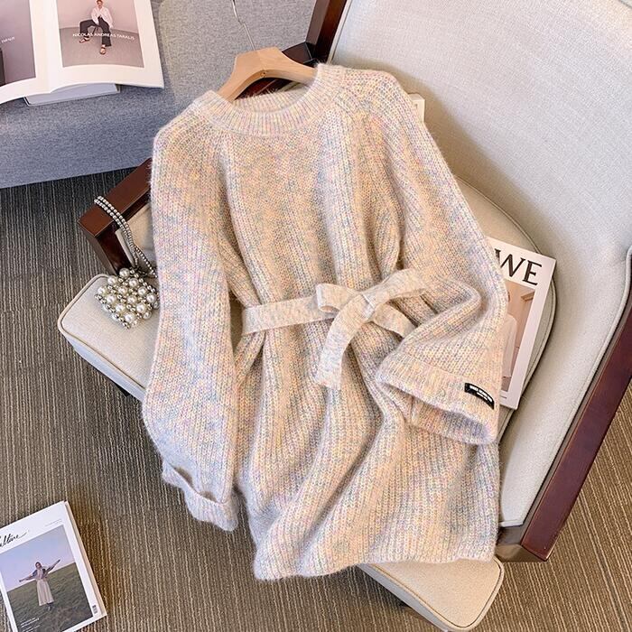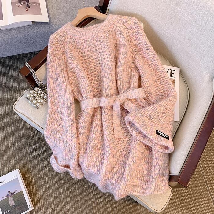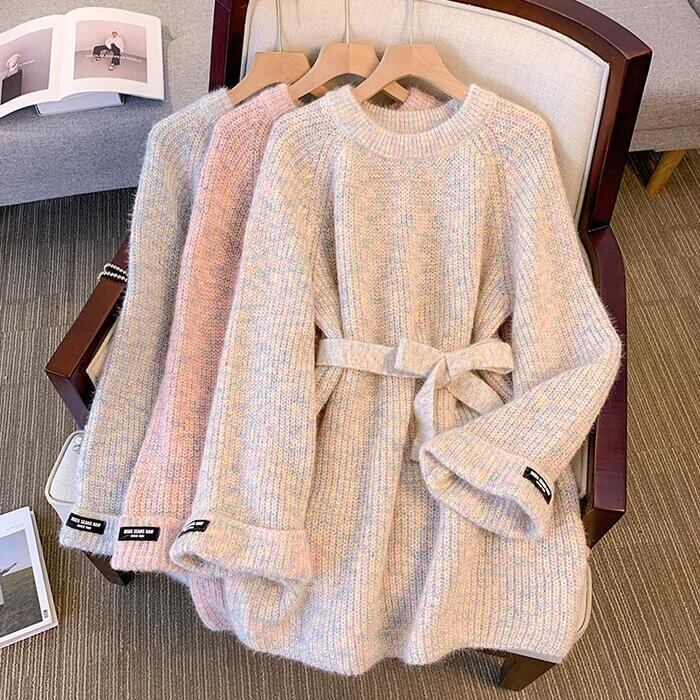 全3色 大きいサイズ 体型カバー トップス ニット セーター メランジ ローゲージ レディース エレガント きれいめ カジュアル 長袖 プルオーバー 大人 可愛い フェミニン おしゃれ ゆったり オーバーサイズ ウエストリボン 韓国 ベージュ ブルー 青 ピンク 秋 冬 20代 30代 40代 50代
