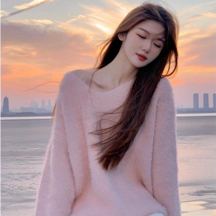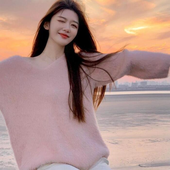 大きいサイズ 体型カバー トップス シャギー ニット セーター レディース エレガント きれいめ カジュアル 長袖 プルオーバー 大人 可愛い フェミニン おしゃれ ゆったり Vネック シンプル 暖かい ガーリー 韓国 ピンク 春 秋 冬 20代 30代 40代 50代