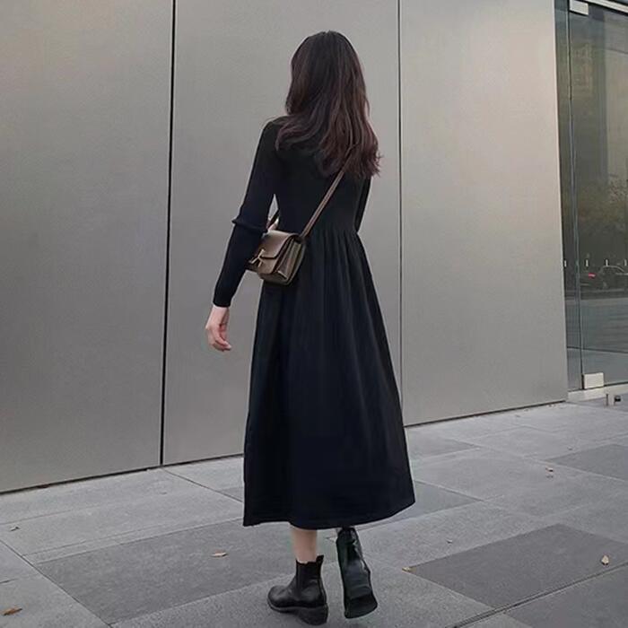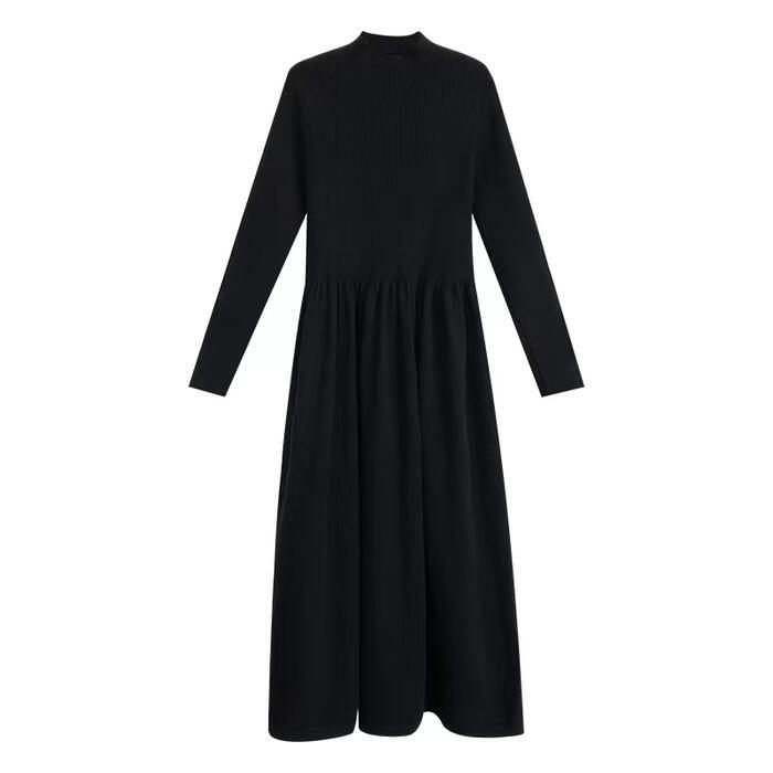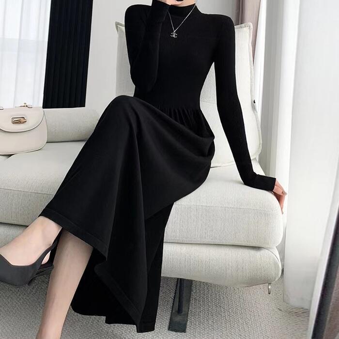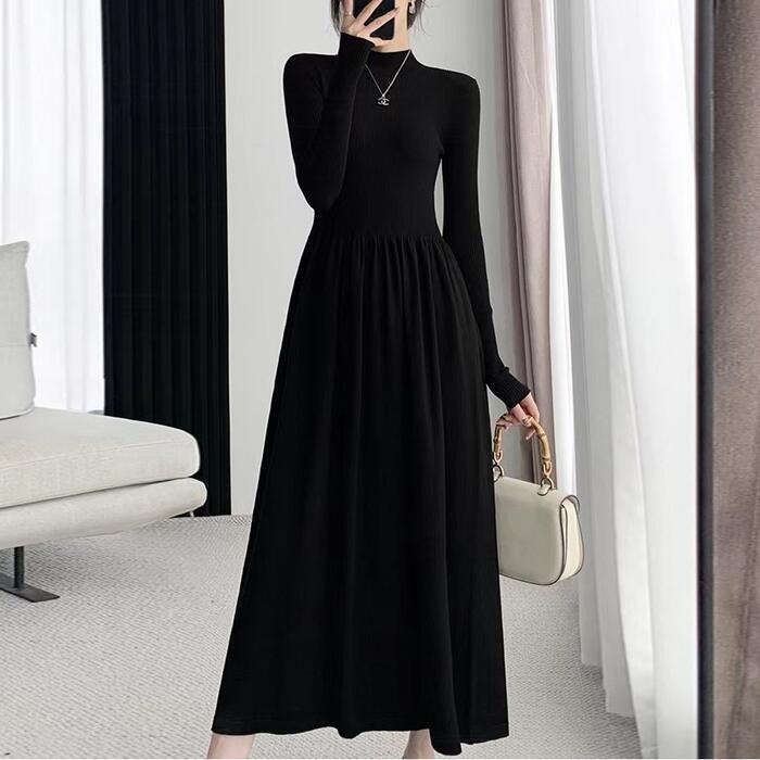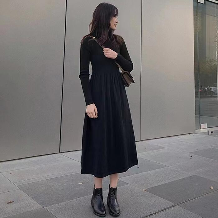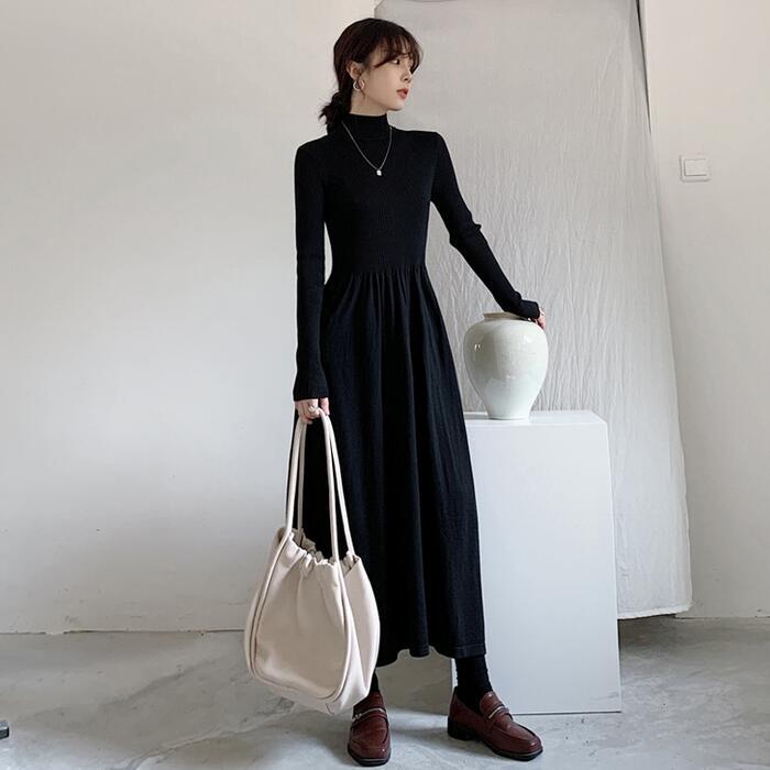 ワンピース ドレス ニット ワンピ 袖あり タートル レディース エレガント きれいめ カジュアル ミモレ丈 長袖 大人 可愛い フェミニン ハイウエスト シンプル フレア 韓国 体型カバー 大きいサイズ ブラック 黒 春 秋 冬 20代 30代 40代 50代