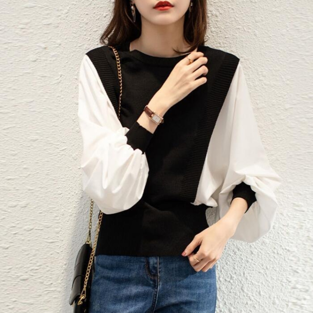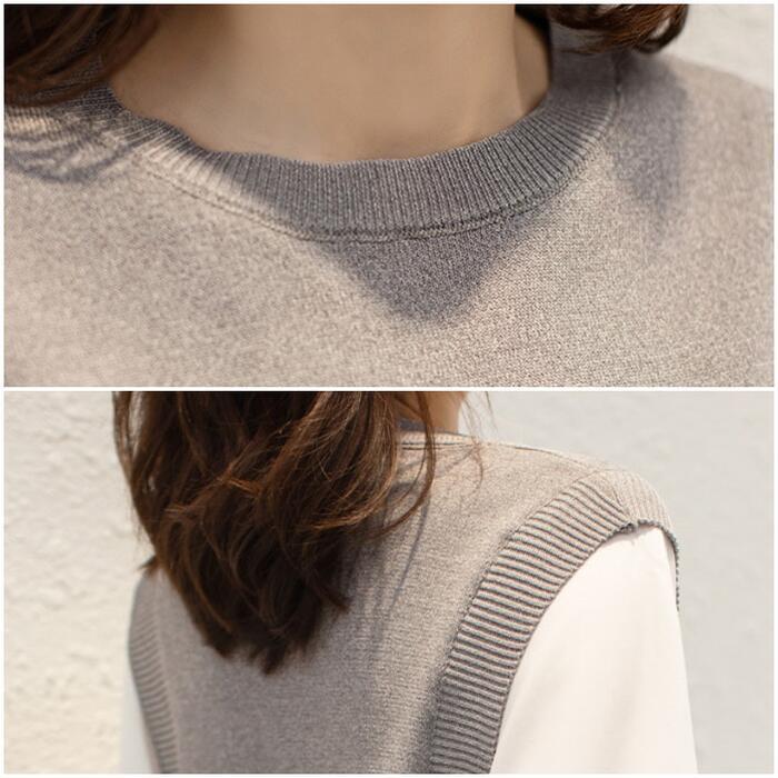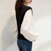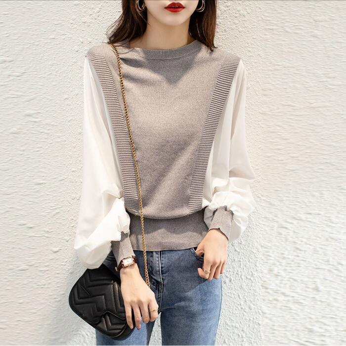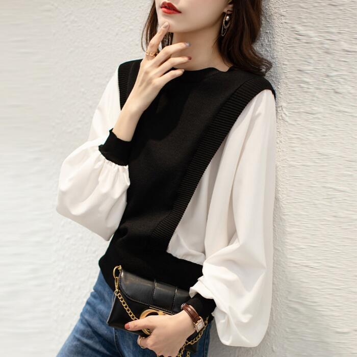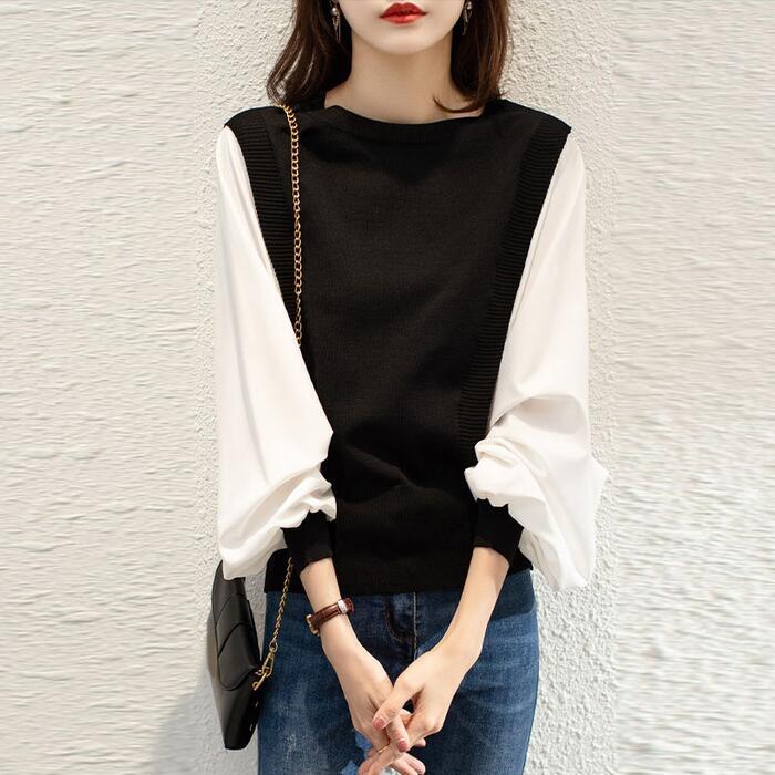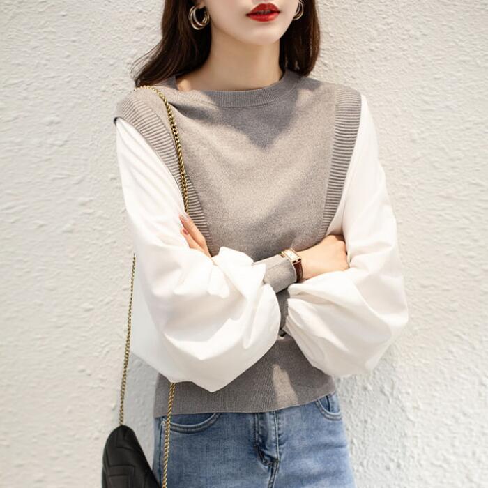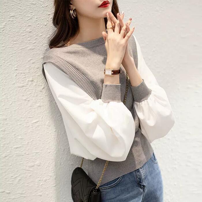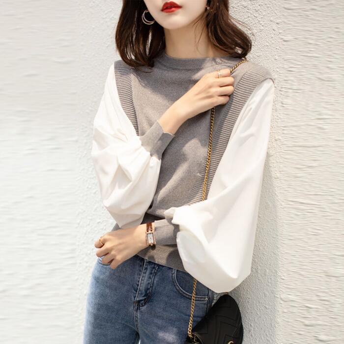 全2色 大きいサイズ 体型カバー レイヤード風 トップス ニット シャツ ブラウス カットソー レディース パフスリーブ エレガント きれいめ カジュアル 長袖 プルオーバー 大人 可愛い フェミニン おしゃれ クルーネック 韓国 グレー ブラック 黒 春 秋 冬 20代 30代 40代 50代