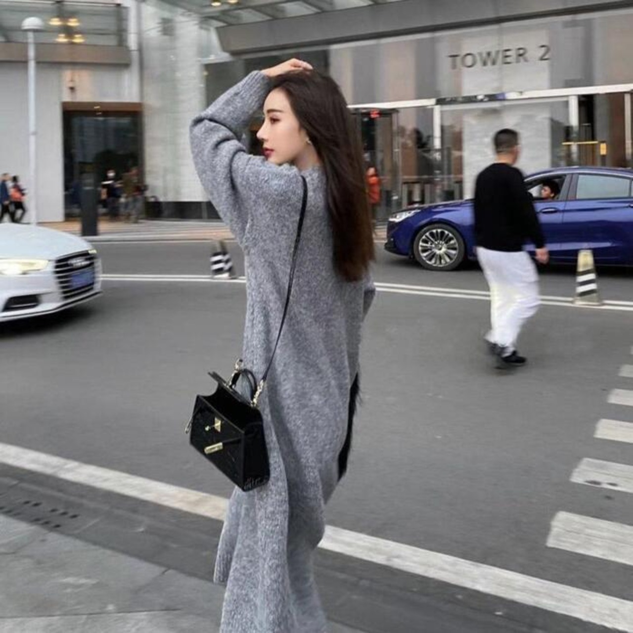大きく開いたフロントスリットが個性的なニットワンピース。