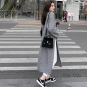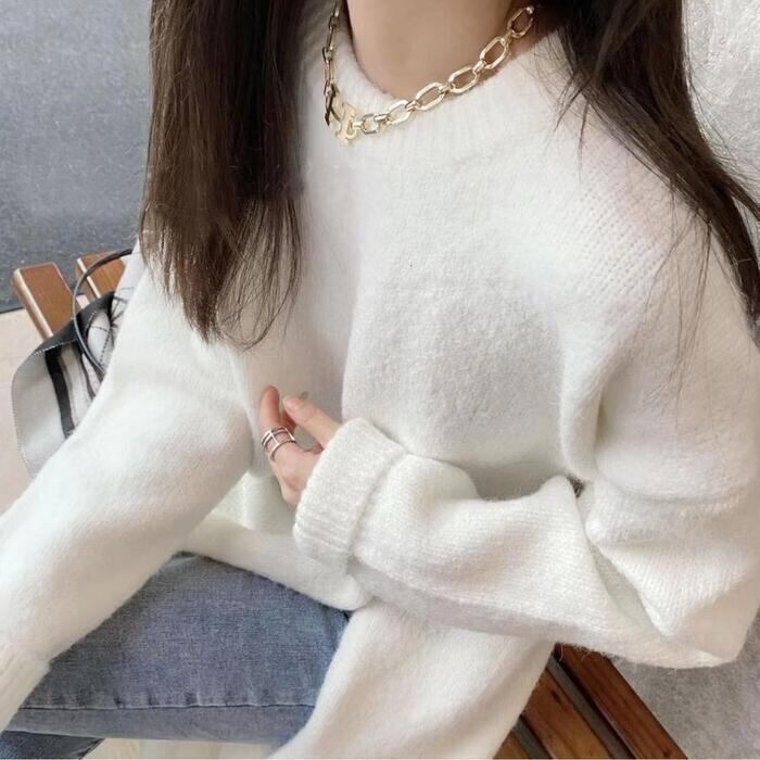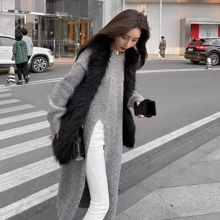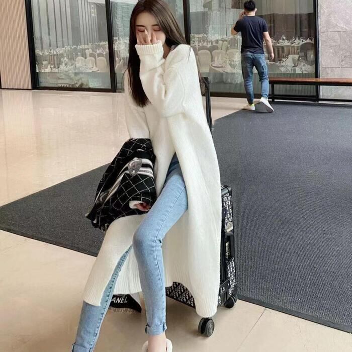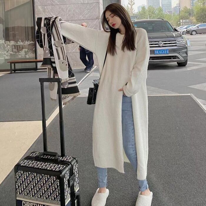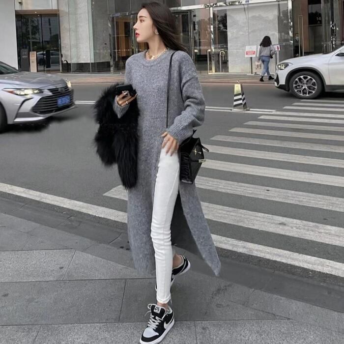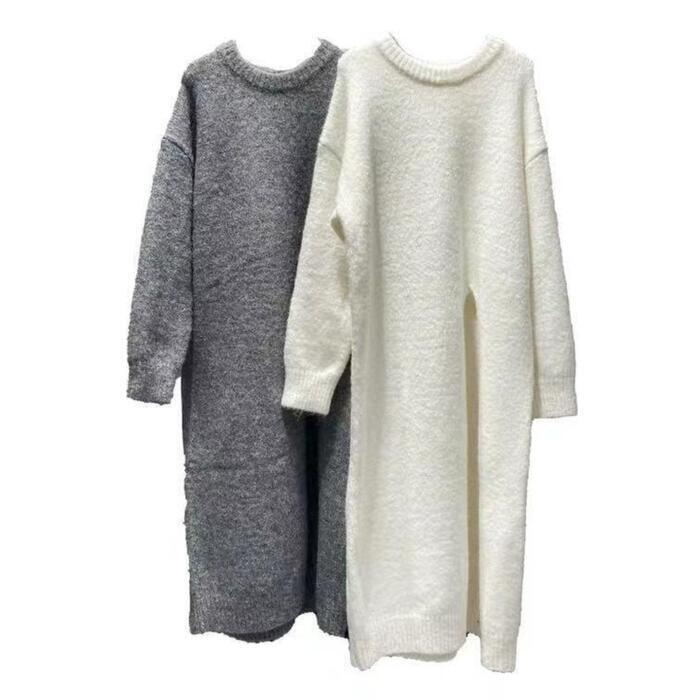 全2色 大きいサイズ 体型カバー レイヤード トップス ニット セーター ワンピース レディース エレガント きれいめ カジュアル 長袖 プルオーバー ロングスリット 大人 可愛い フェミニン おしゃれ ゆったり シンプル 韓国 ホワイト 白 グレー 春 秋 冬 20代 30代 40代 50代