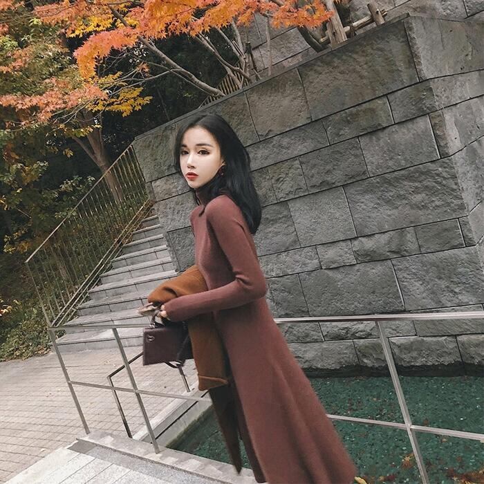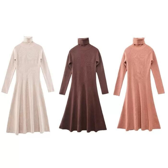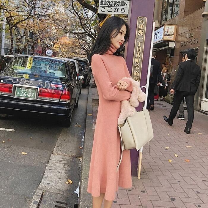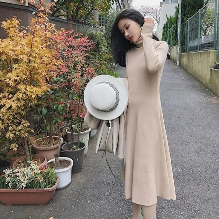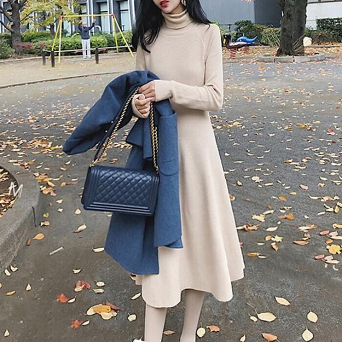 全3色 大きいサイズ 体型カバー ニット ワンピース ドレス ワンピ 袖あり レディース エレガント きれいめ カジュアル ミモレ丈 長袖 タートルネック 大人 可愛い フェミニン フレア Aライン 楽ちん シンプル ナチュラル 韓国 ベージュ ピンク ブラウン 春 秋 冬 20代 30代 40代 50代