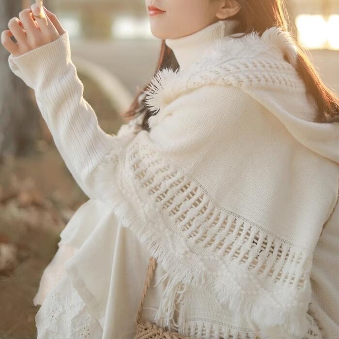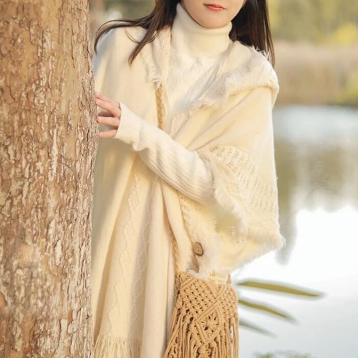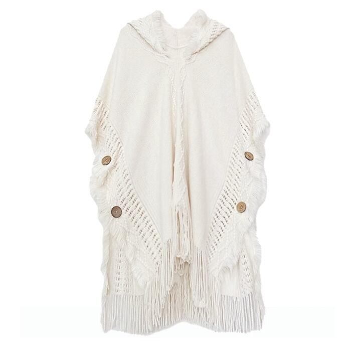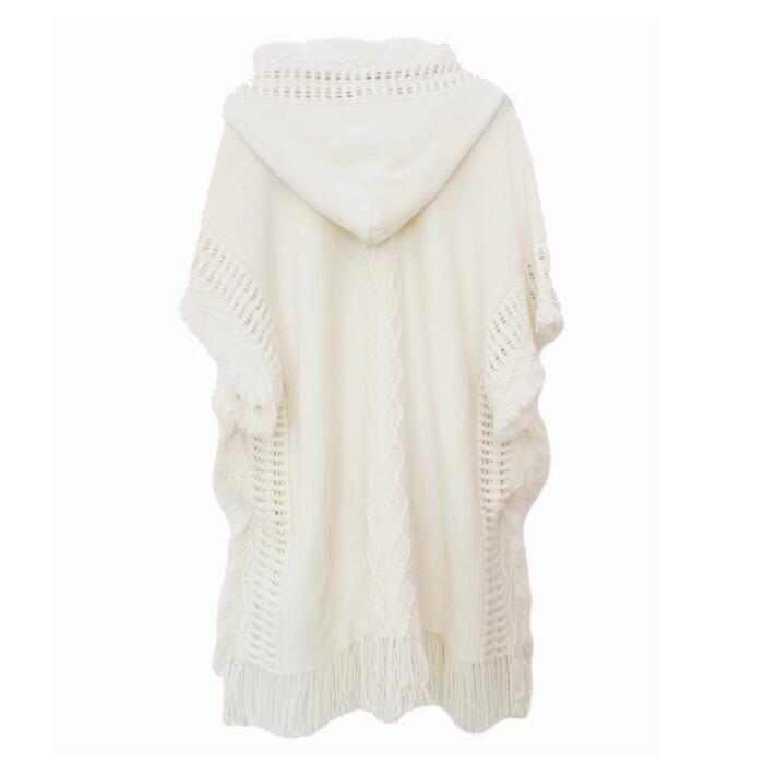 レース編みやフリンジなどディテールにこだわったフード付きニットポンチョ。