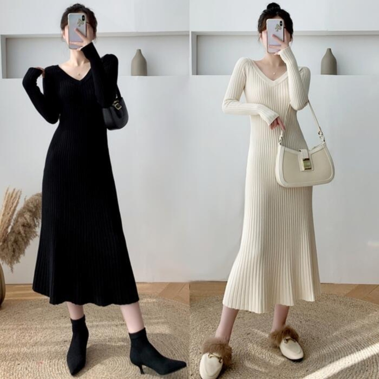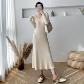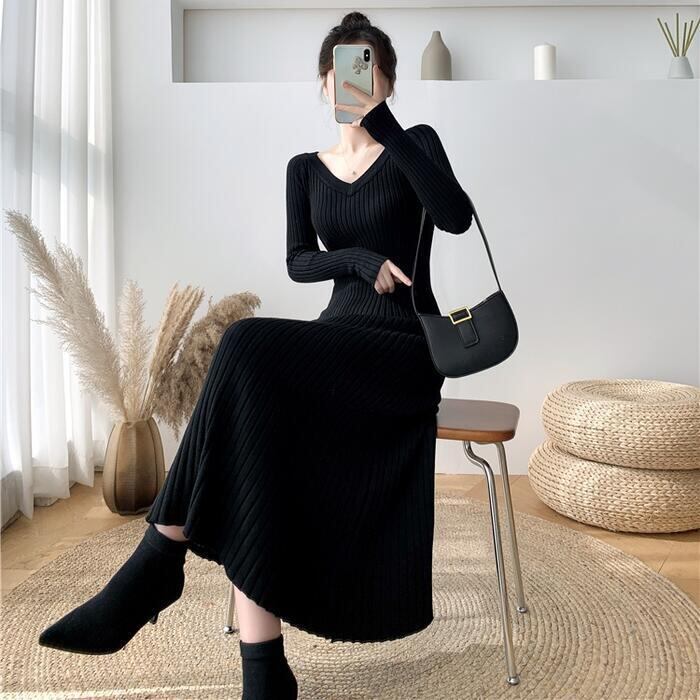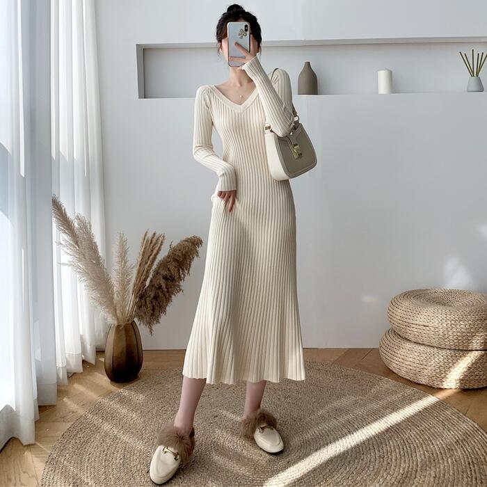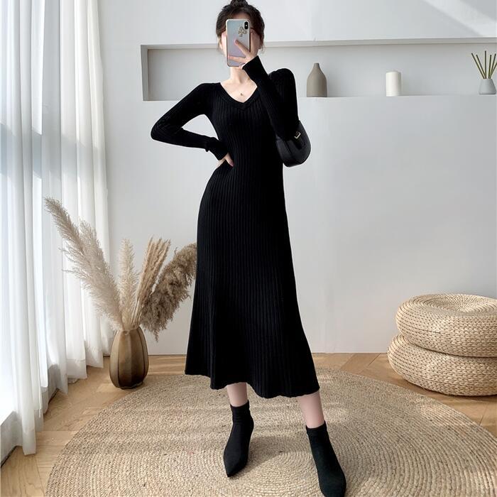 全2色 大きいサイズ ニット ワンピース ドレス ワンピ リブ 袖あり レディース エレガント きれいめ カジュアル ミモレ丈 フレア 長袖 大人 可愛い フェミニン Aライン ハイウエスト シンプル Vネック アイボリー ブラック 黒 春 秋 冬 20代 30代 40代 50代