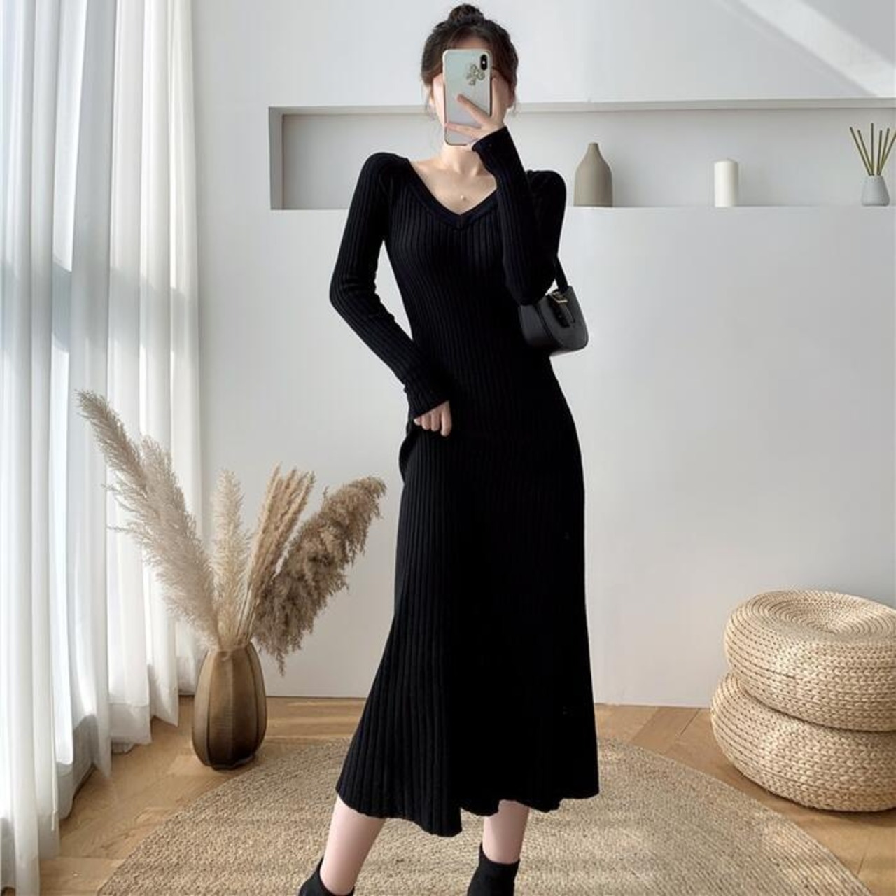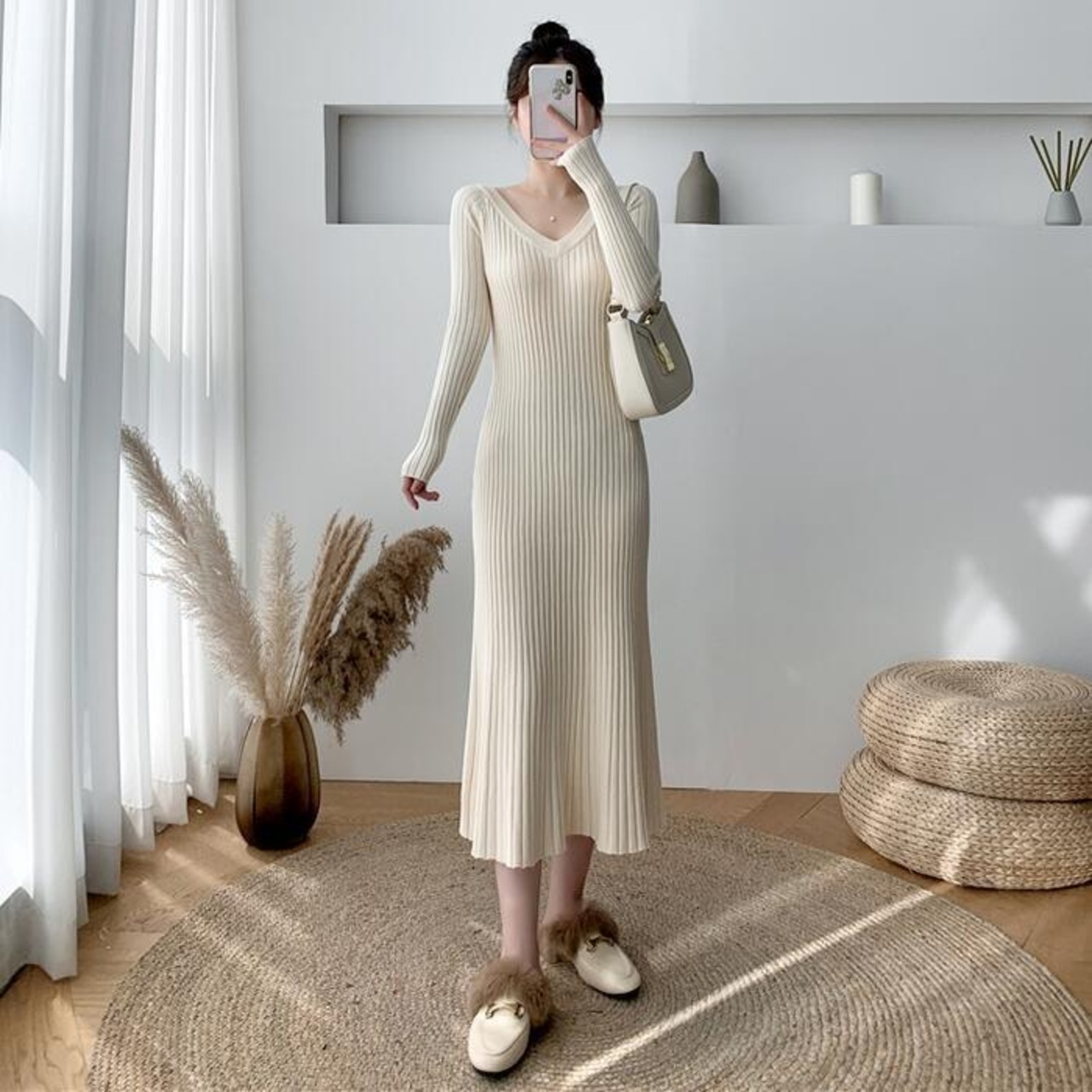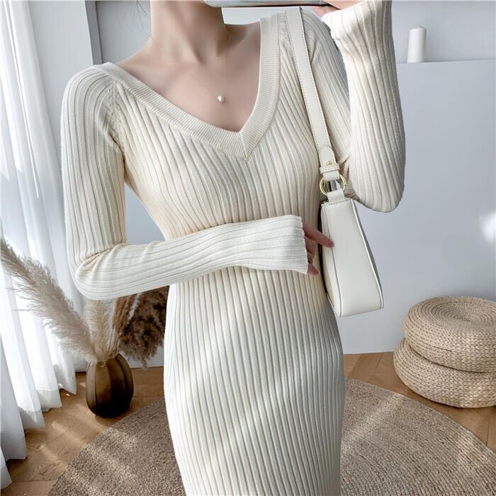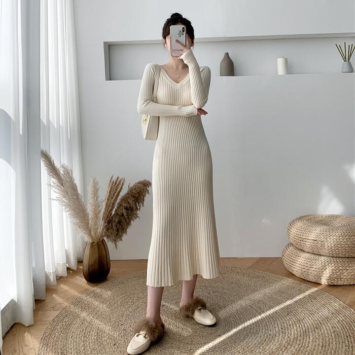 ワイドリブのVネックニットワンピース。