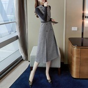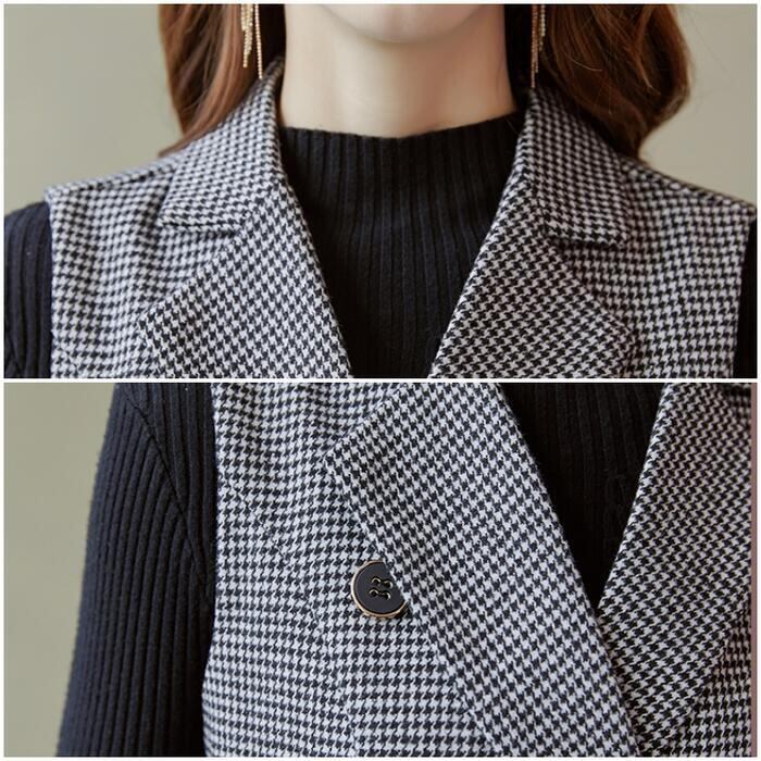 大きいサイズ 体型カバー セットアップ 2点セット ニット トップス ワンピース 千鳥格子 ノースリーブ おしゃれ レイヤード 大人 可愛い ひざ丈 スリット エレガント きれいめ カジュアル フェミニン ブラック 黒 春 秋 冬 20代 30代 40代 50代