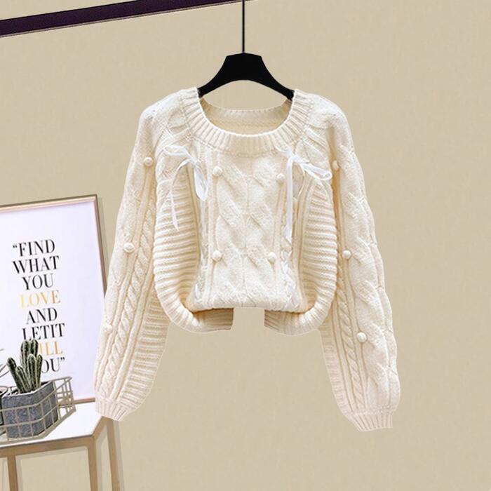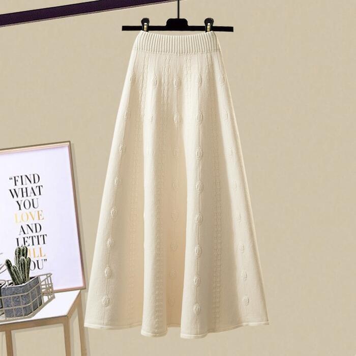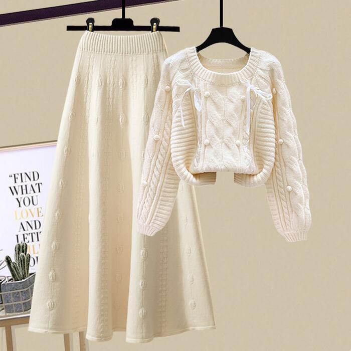 大きいサイズ セットアップ 2点セット ニット トップス スカート ケーブル 長袖 おしゃれ 大人 可愛い ミモレ丈 エレガント きれいめ カジュアル フェミニン リボン Aライン シンプル 体型カバー 韓国 ホワイト 白 春 秋 冬 20代 30代 40代 50代