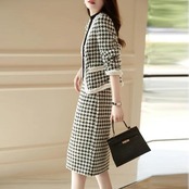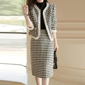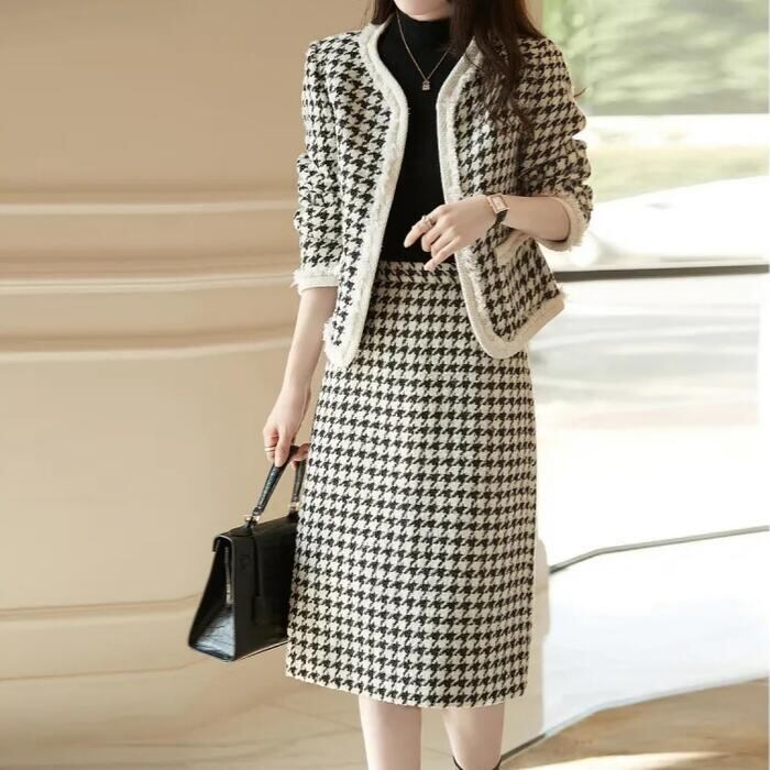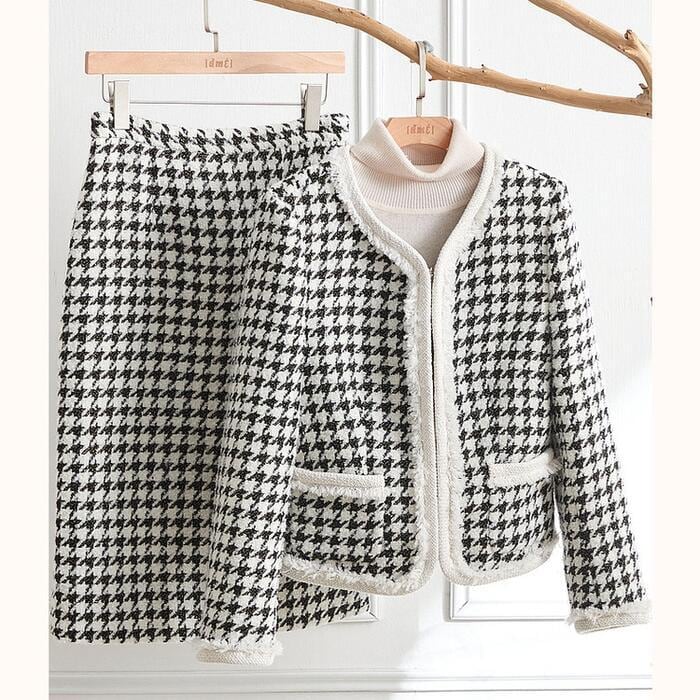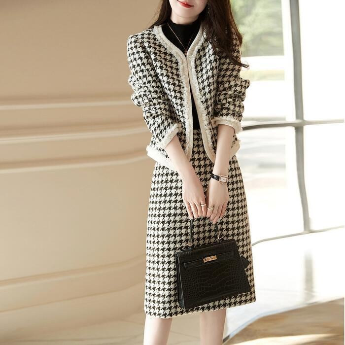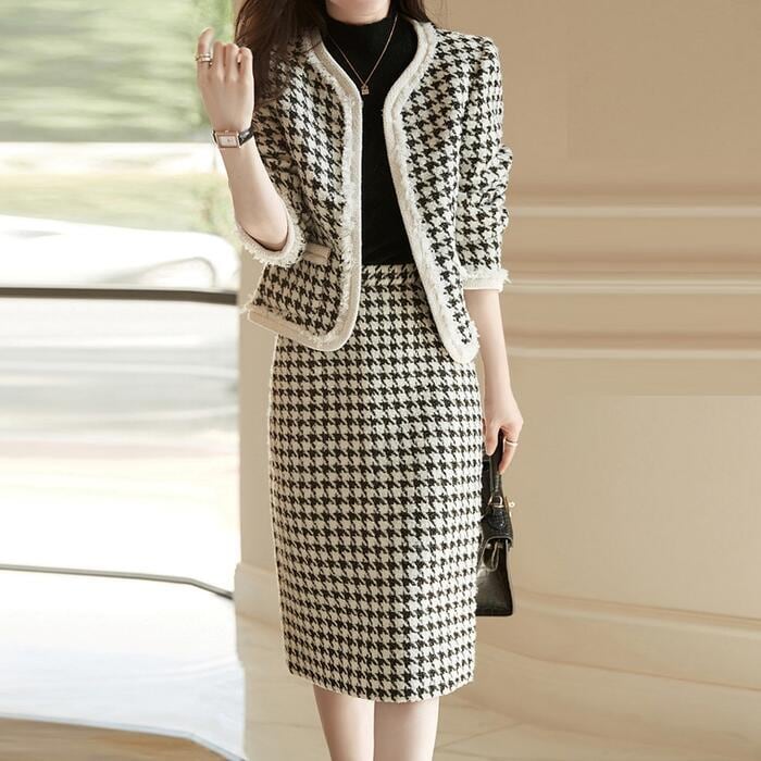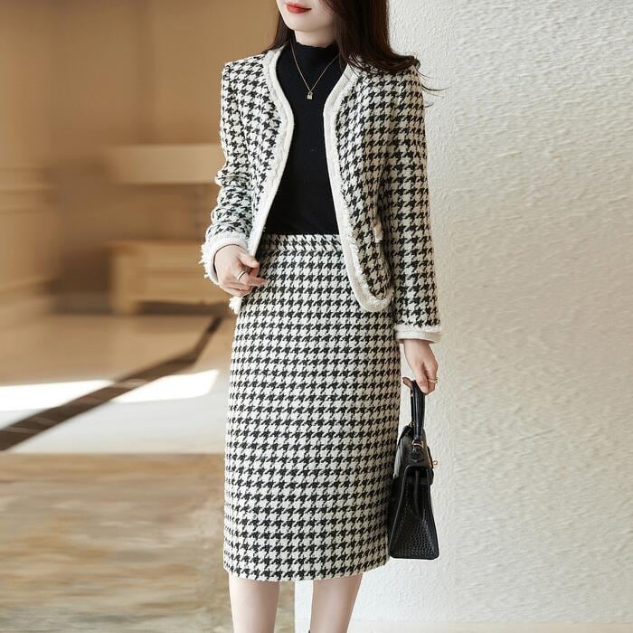 エレガントな千鳥格子柄スカートセットアップ。