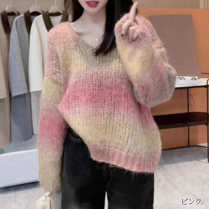 全3色 大きいサイズ トップス ニット グラデーション セーター メランジ レディース エレガント きれいめ カジュアル 長袖 大人 可愛い フェミニン おしゃれ Vネック プルオーバー ゆったり 体型カバー パープル イエロー ピンク 春 秋 冬 20代 30代 40代 50代