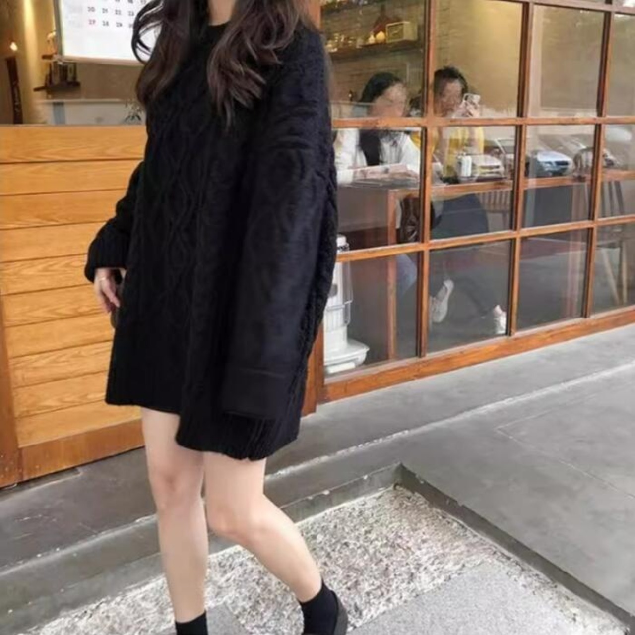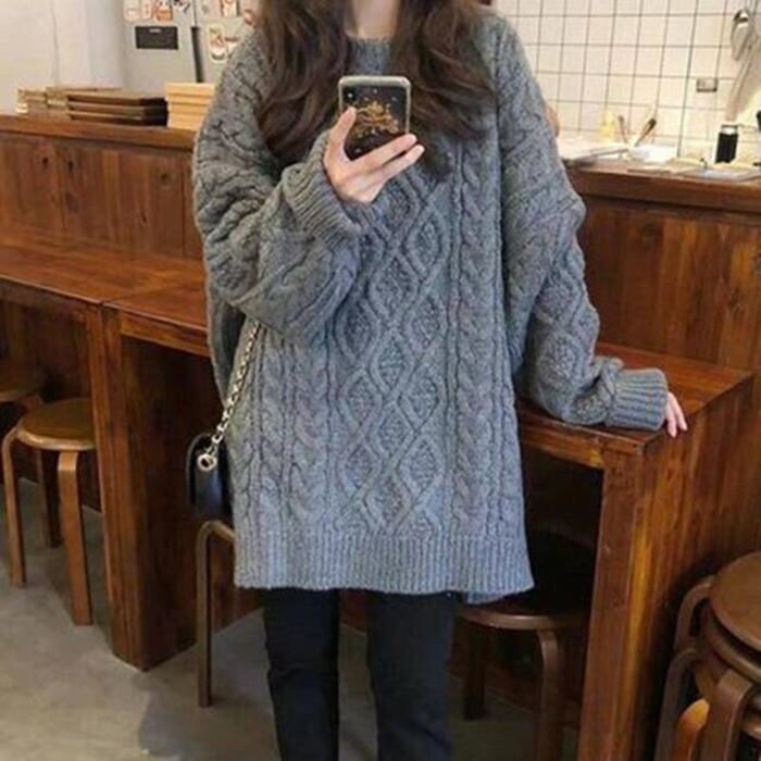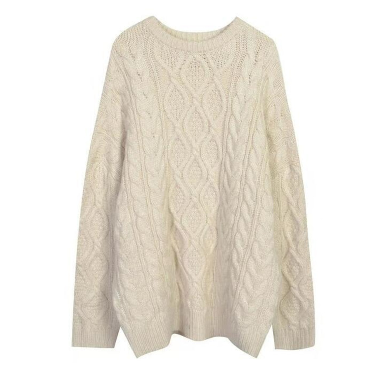 お尻が隠れる丈感のケーブルニットプルオーバー。