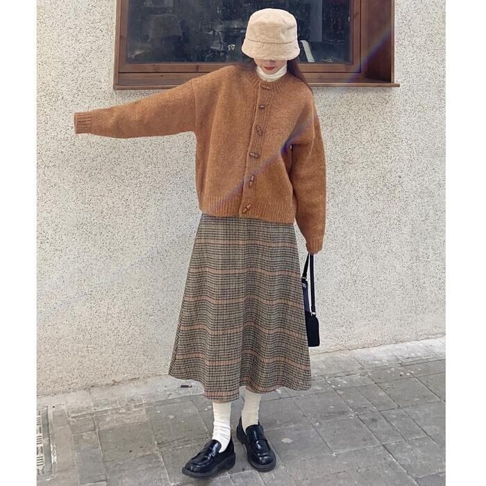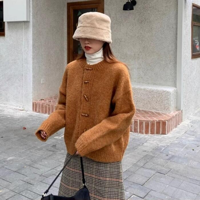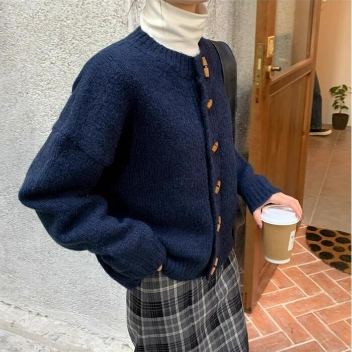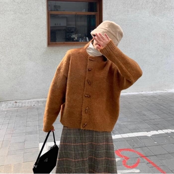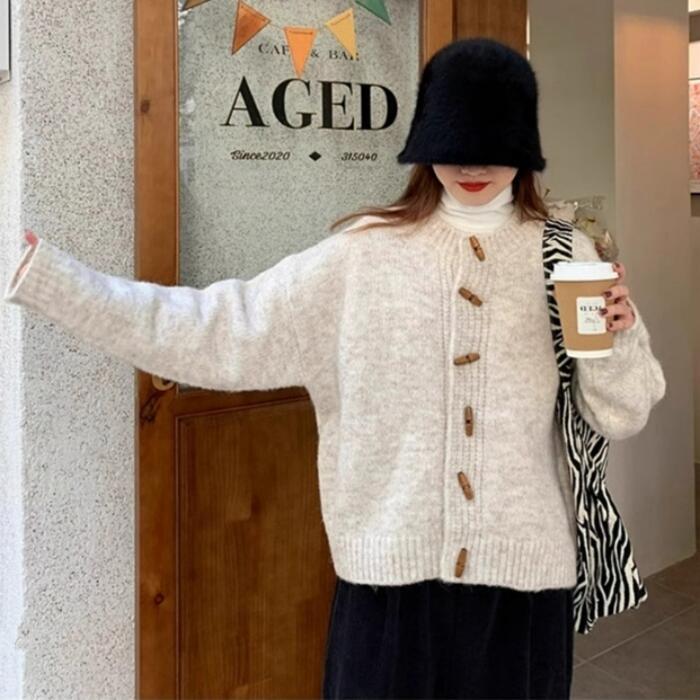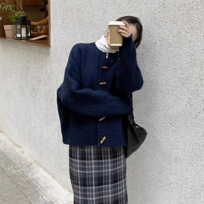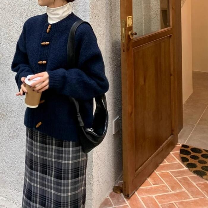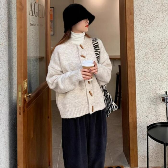 トグルボタンが可愛いニットカーディガン。