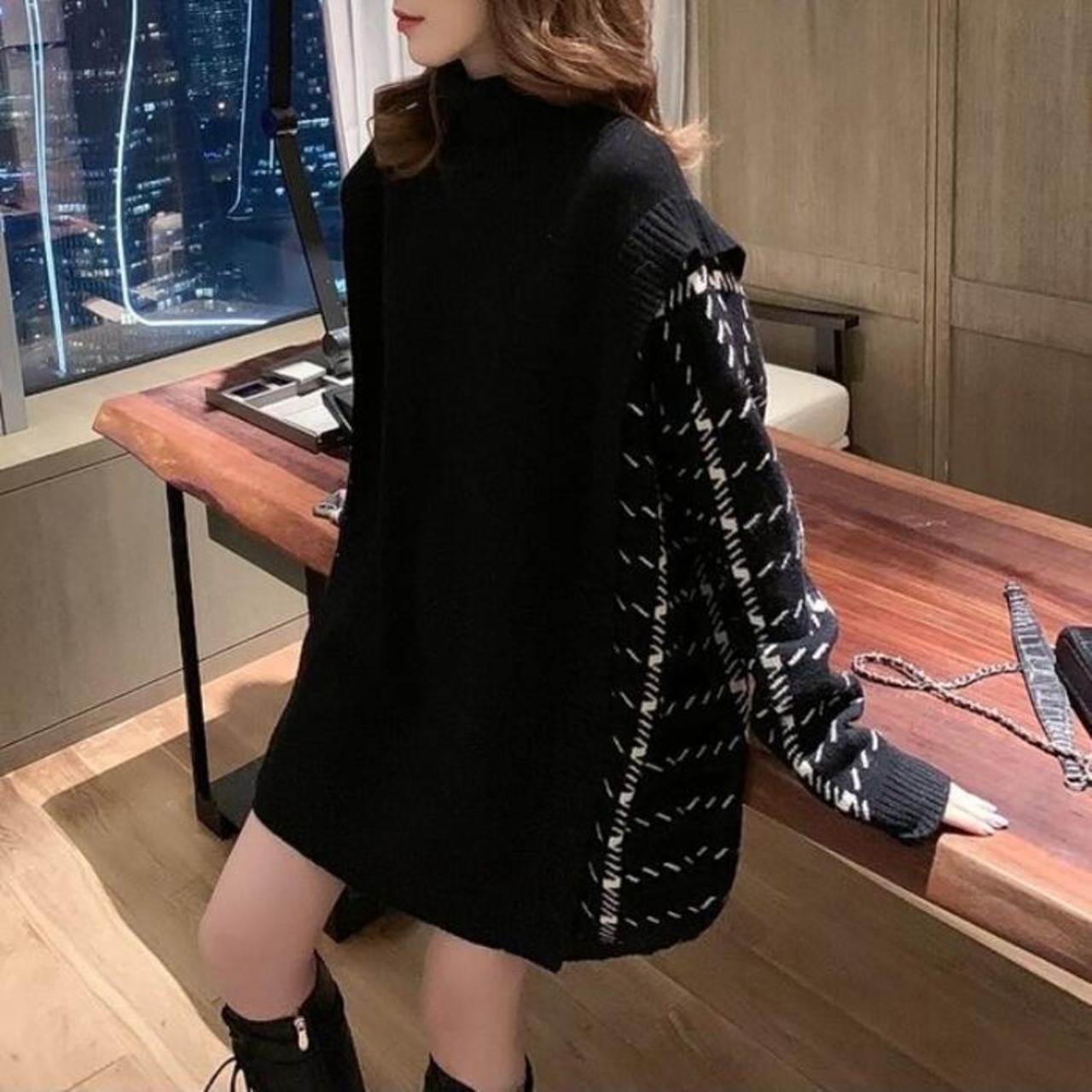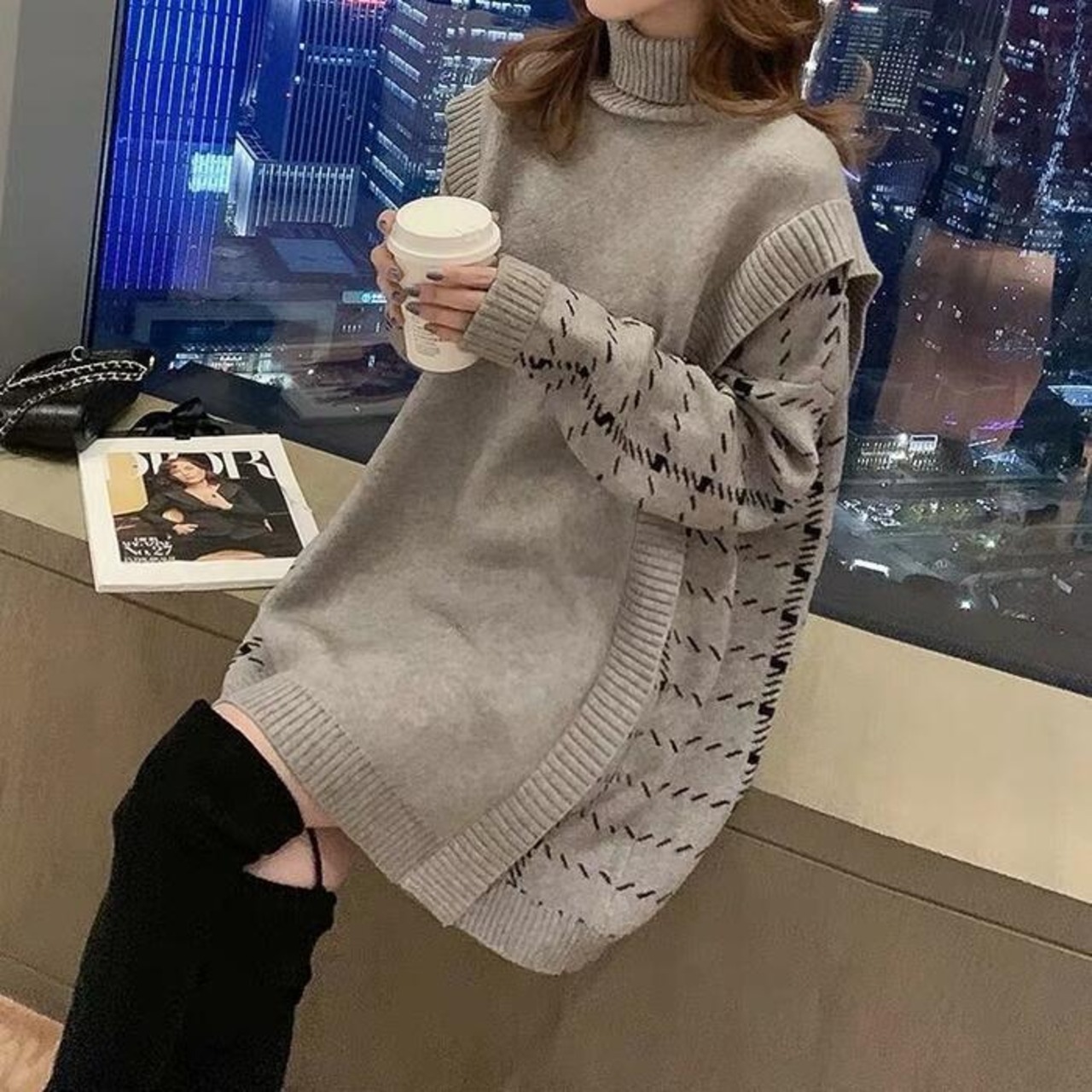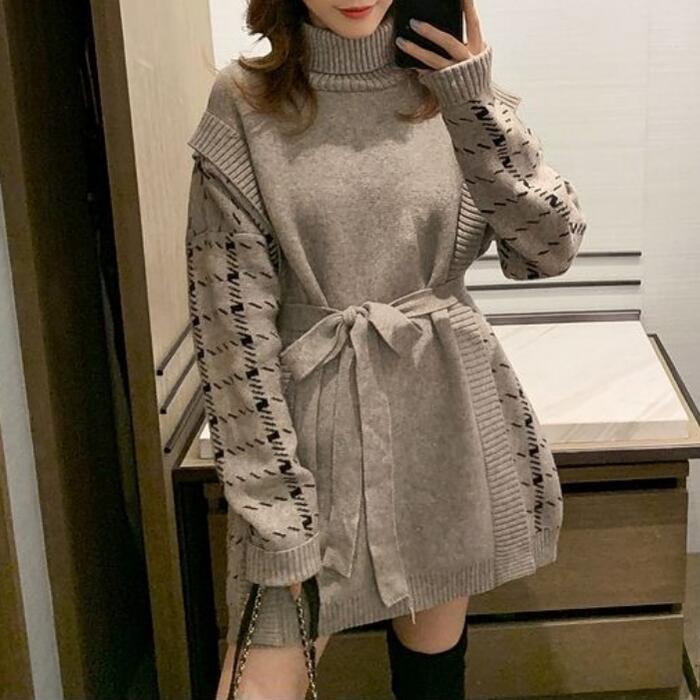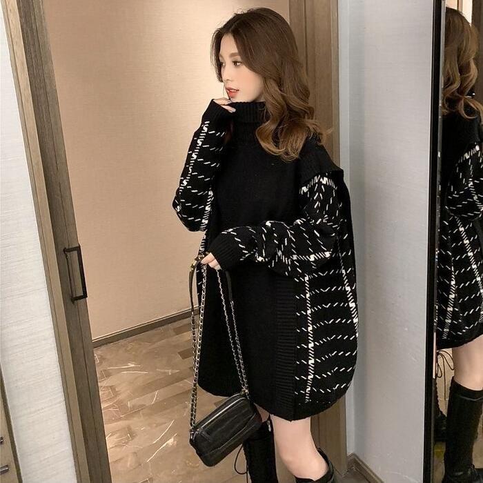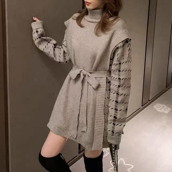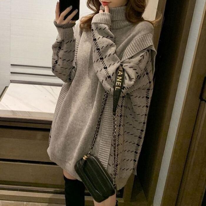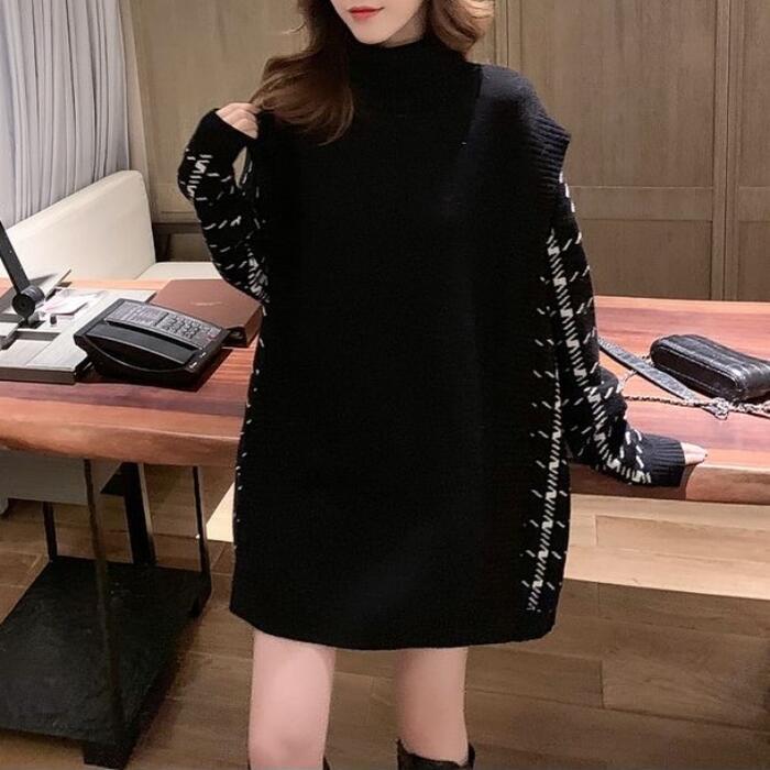 全2色 トップス ニット タートルネック セーター 切り替え プルオーバー レディース エレガント きれいめ カジュアル 長袖 大人 可愛い フェミニン おしゃれ チェック ゆったり オーバーサイズ グレー ブラック 黒 春 秋 冬 20代 30代 40代 50代