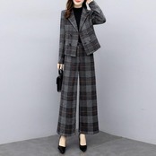 ショート丈のテーラードジャケットとハイウエストパンツのセットアップ。