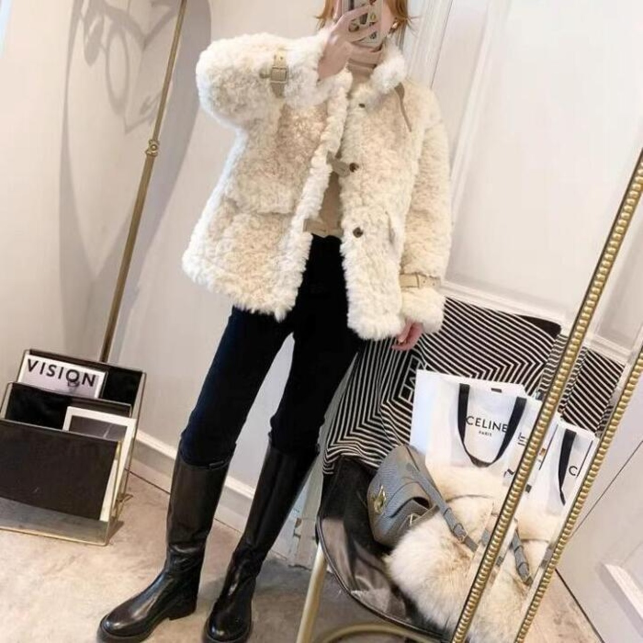 ファーの女性らしさとカジュアルな雰囲気をミックスしトレンドライクな印象に。