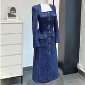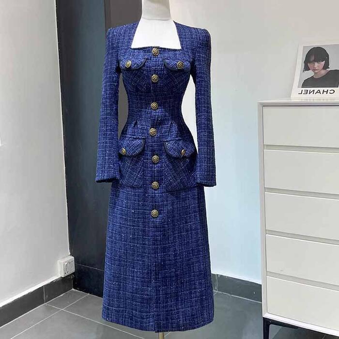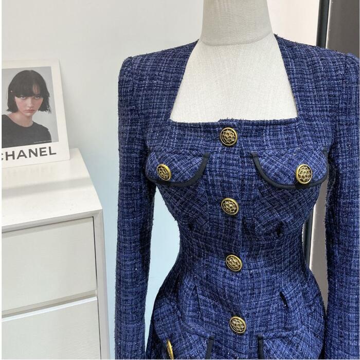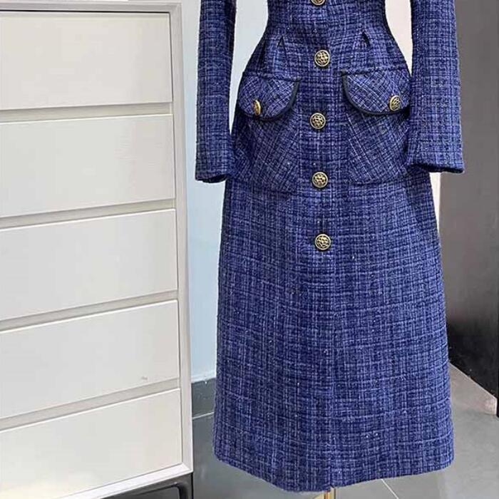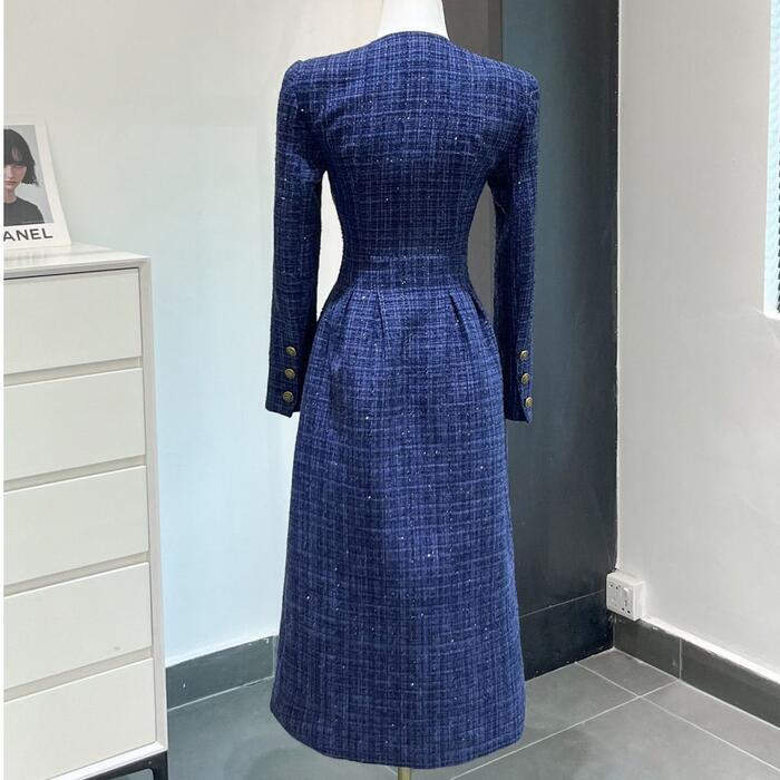 ネイビーのツイードにゴールドボタンがエレガントなワンピース。