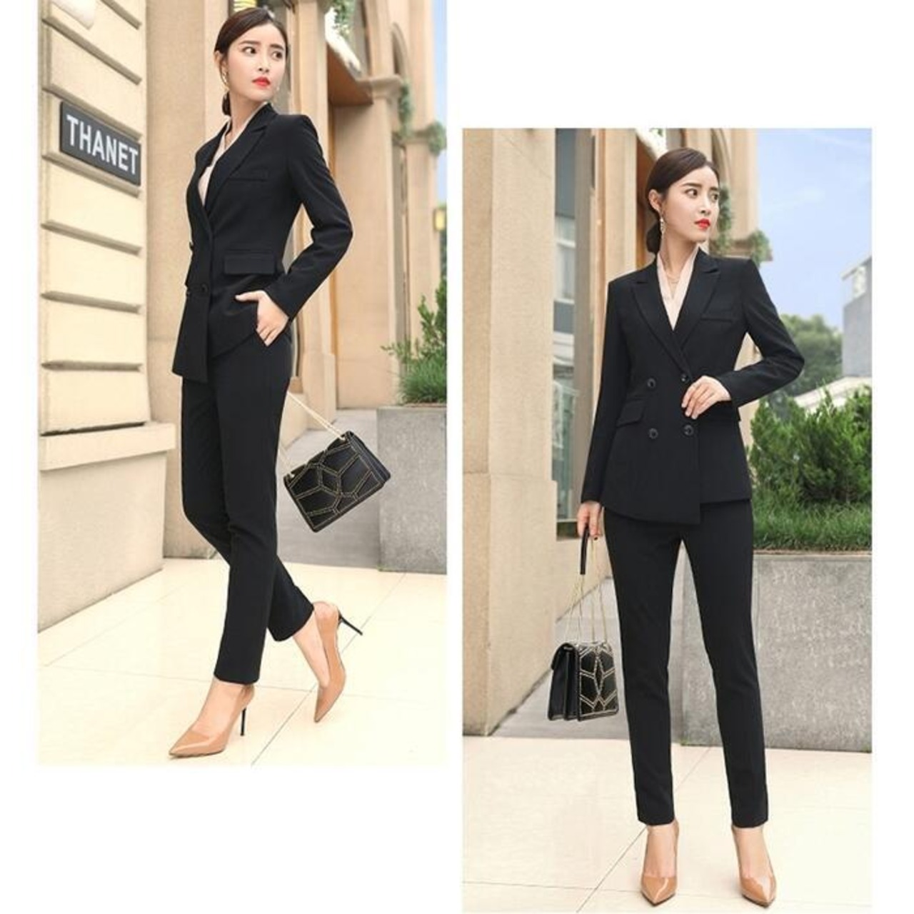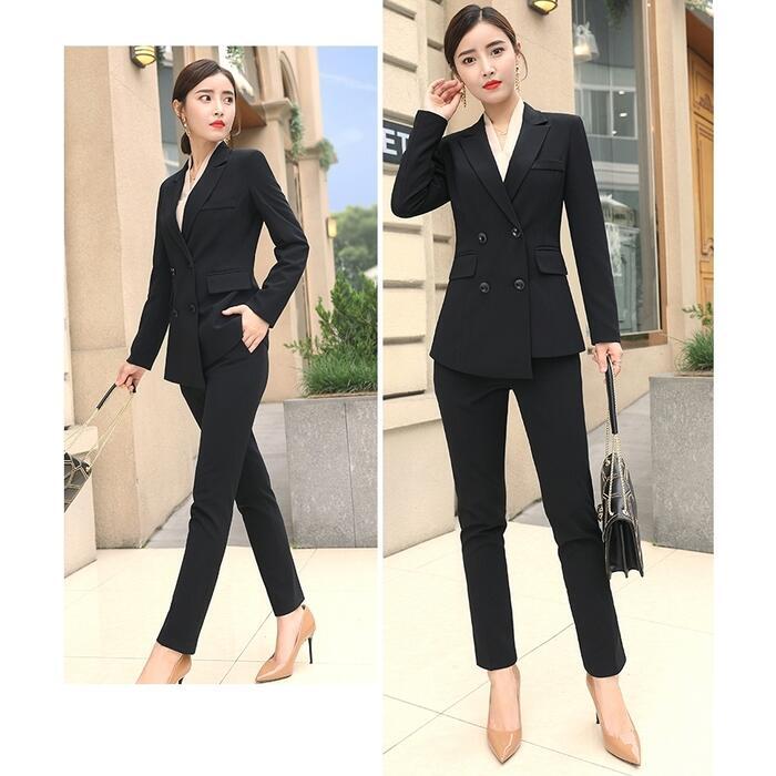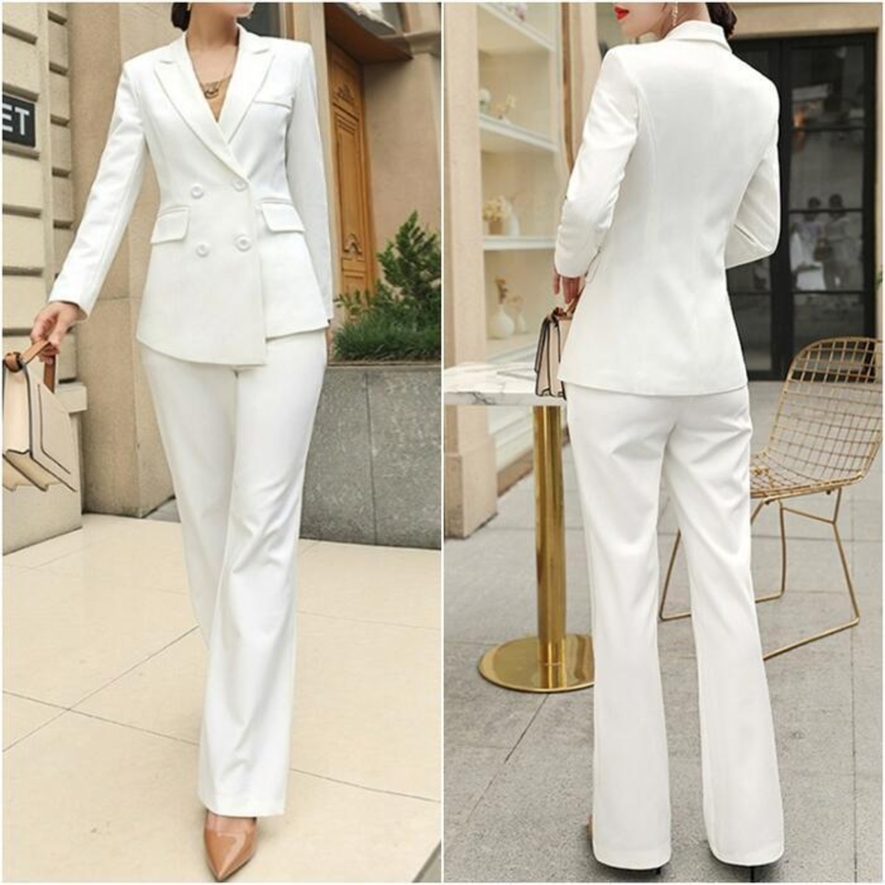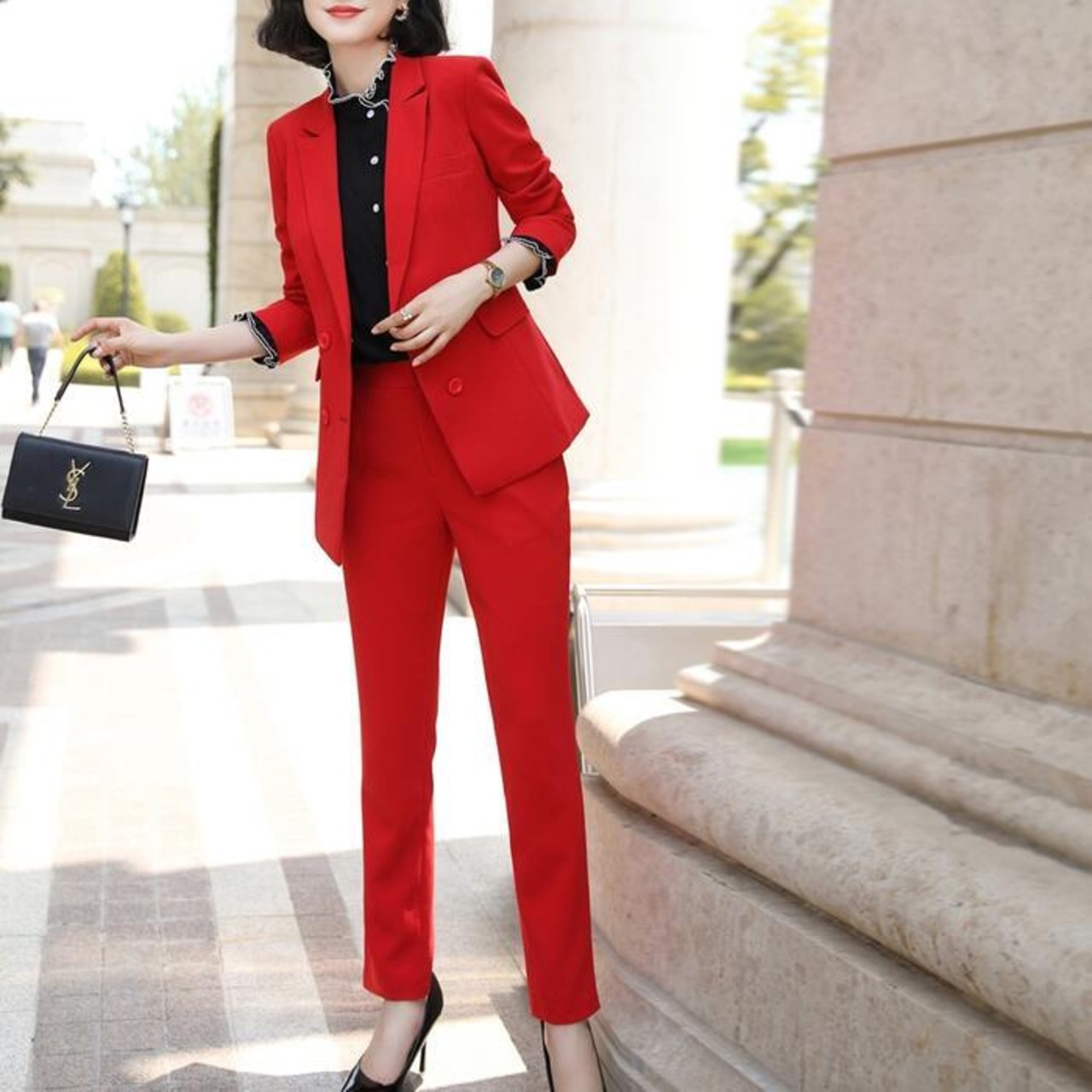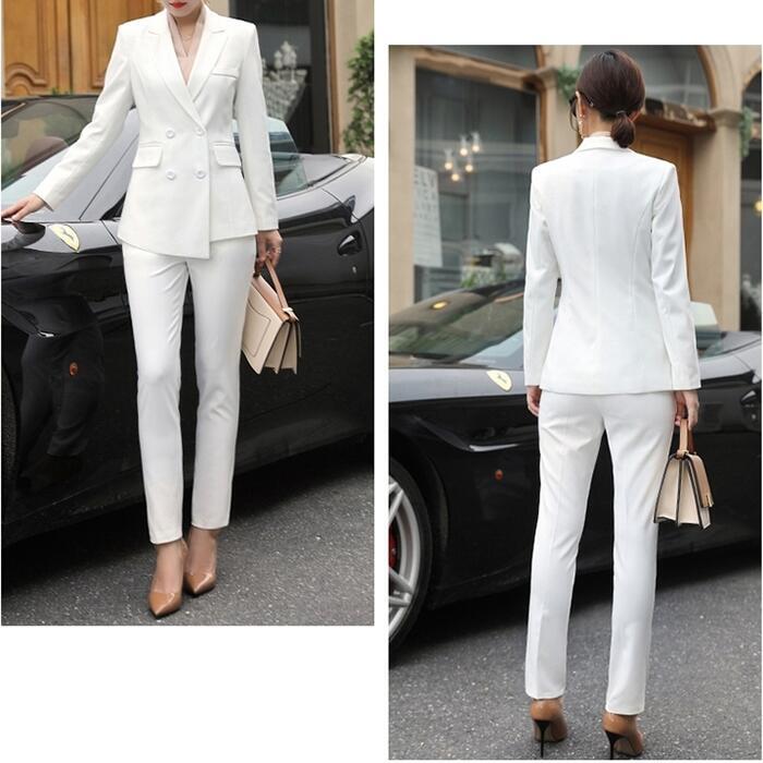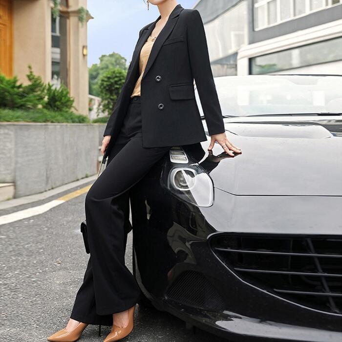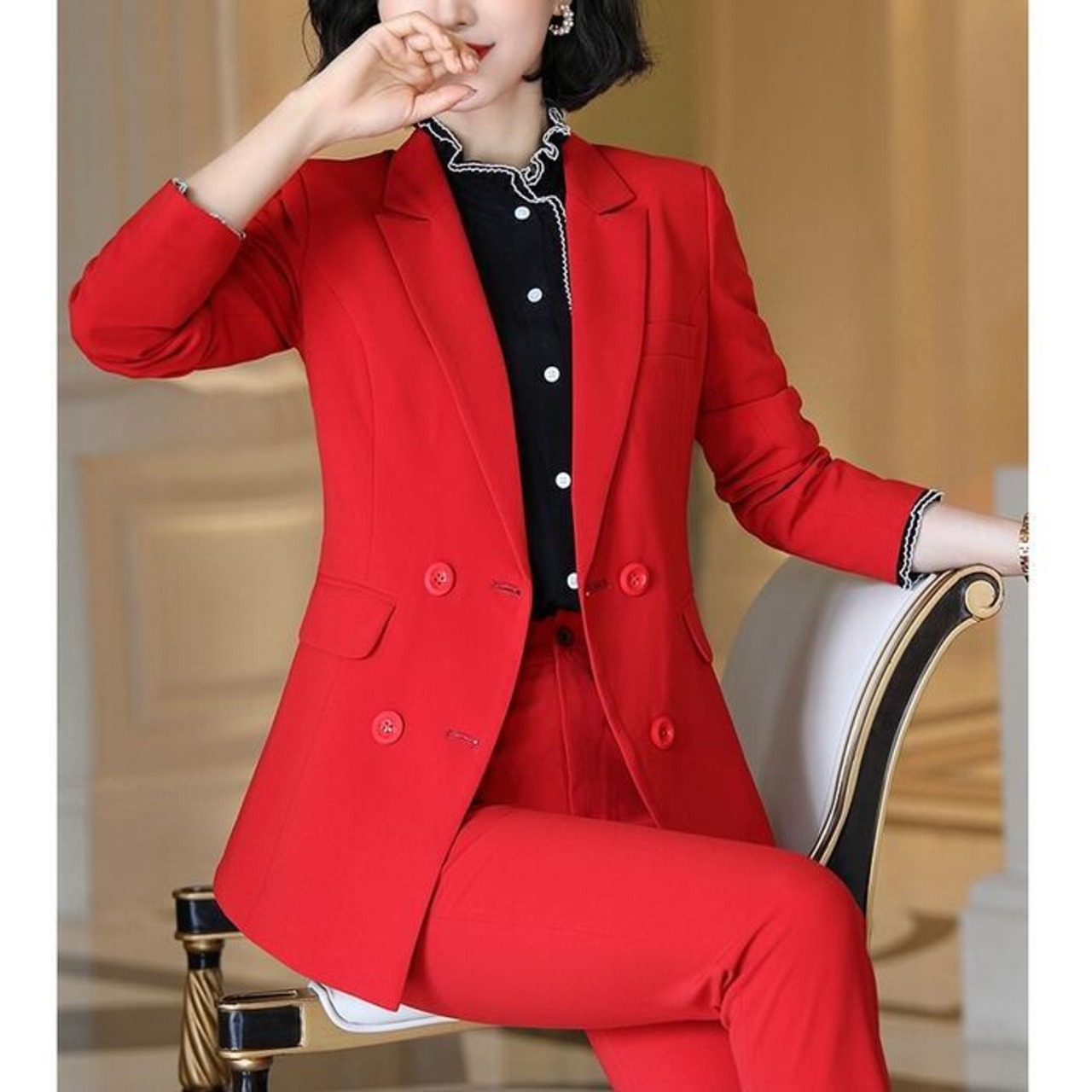 女性らしいシルエットが魅力のパンツスーツ。