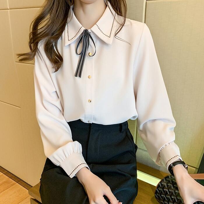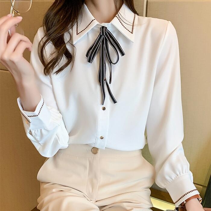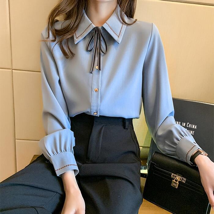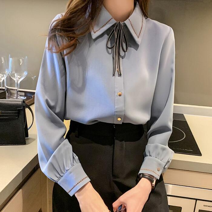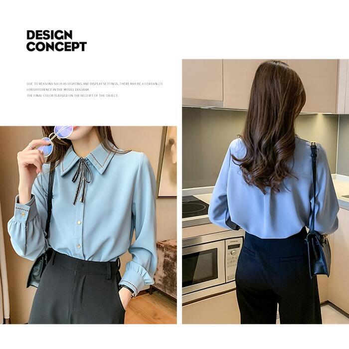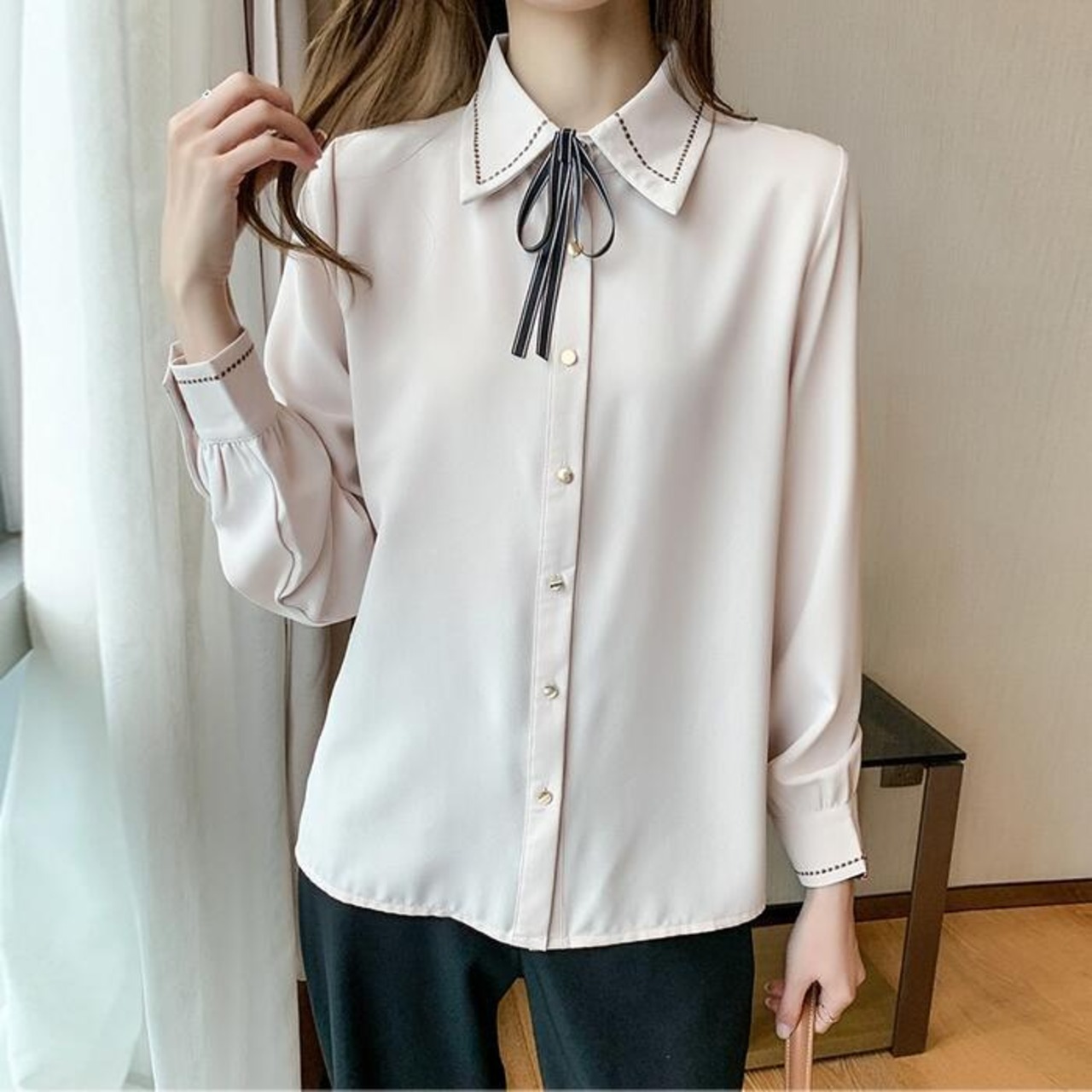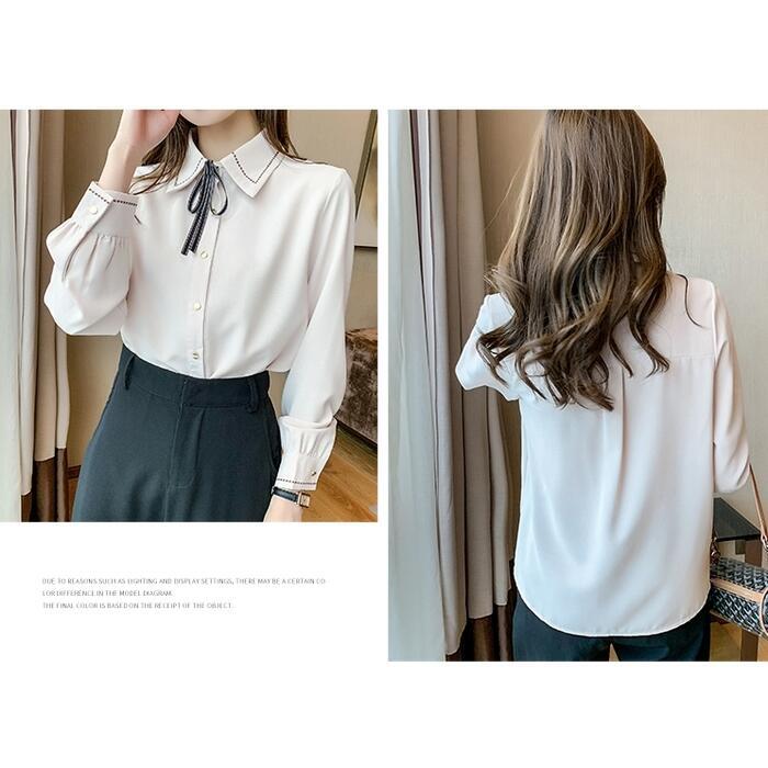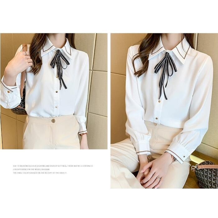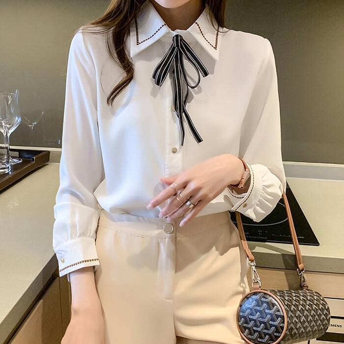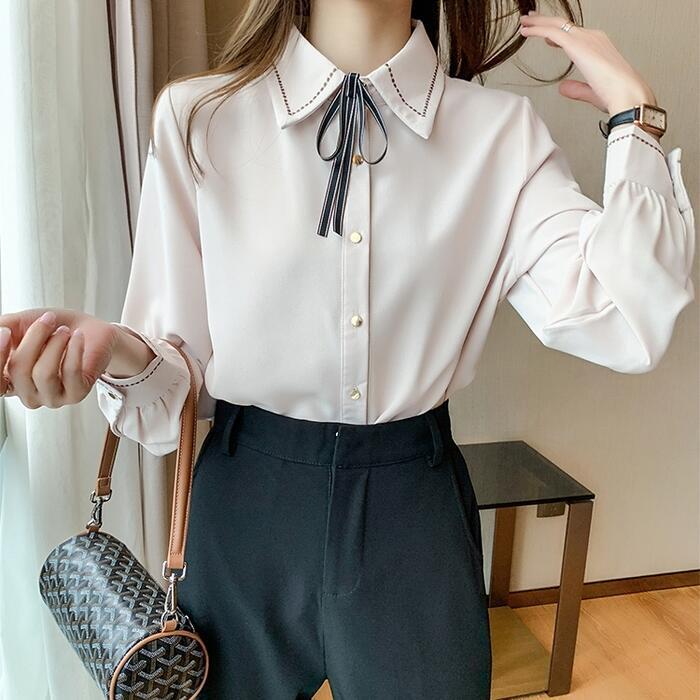 ステッチと首元のリボンが可愛いシフォンブラウス。